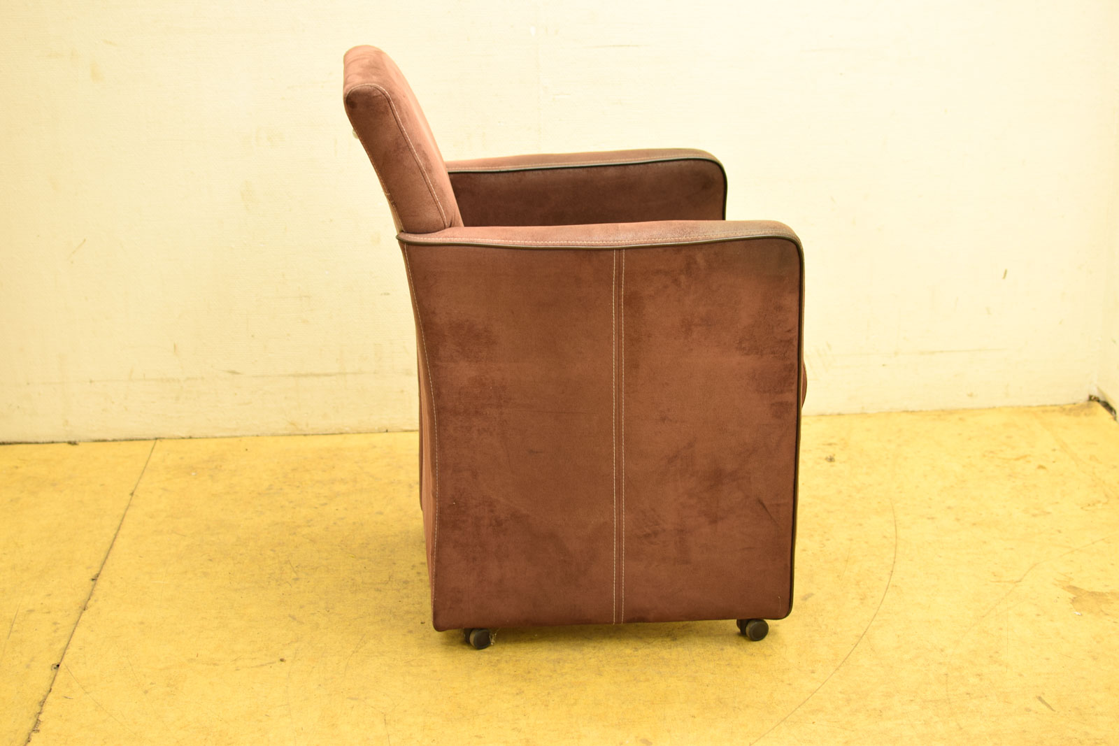 de stoel heeft aan de onderkant wieltjes en een handvat aan de achterkant de de stoel heeft wat vlekjes is gebruikt en heeft slijtage sporen op de armleuningen maar nog heel en zit en rolt nog goed van armleuning tot armleuning gemeten breed 65 cm