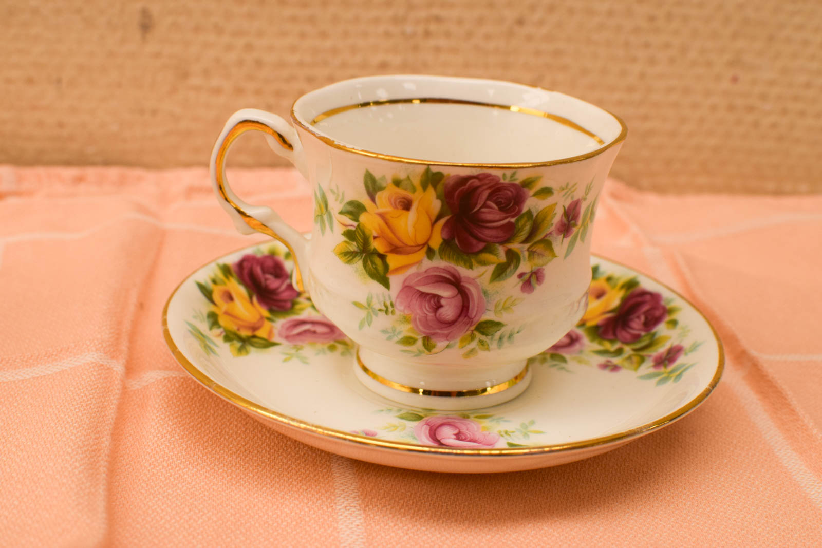 diameter bovenkant van het kopje 7 cm hoog 6 de kopjes hebben lichte verkleuring aan de binnenkant diameter van het schaaltje 13 cm
