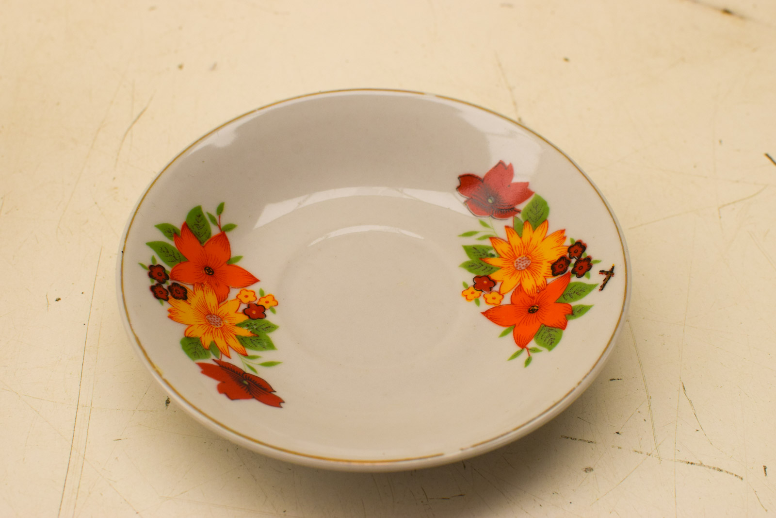 het servies heeft slijtage op het geverfde randje het kopje gemeten diameter bovenkant opening 7,5 cm hoog 6,5 cm diameter van het schaaltje 12 cm het servies heeft lichte krasjes