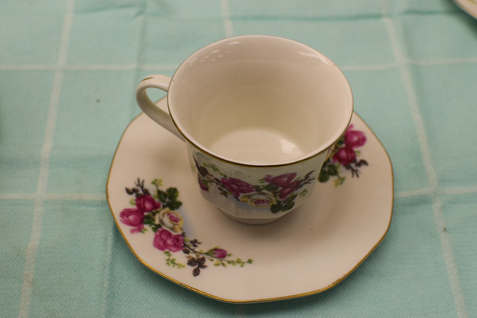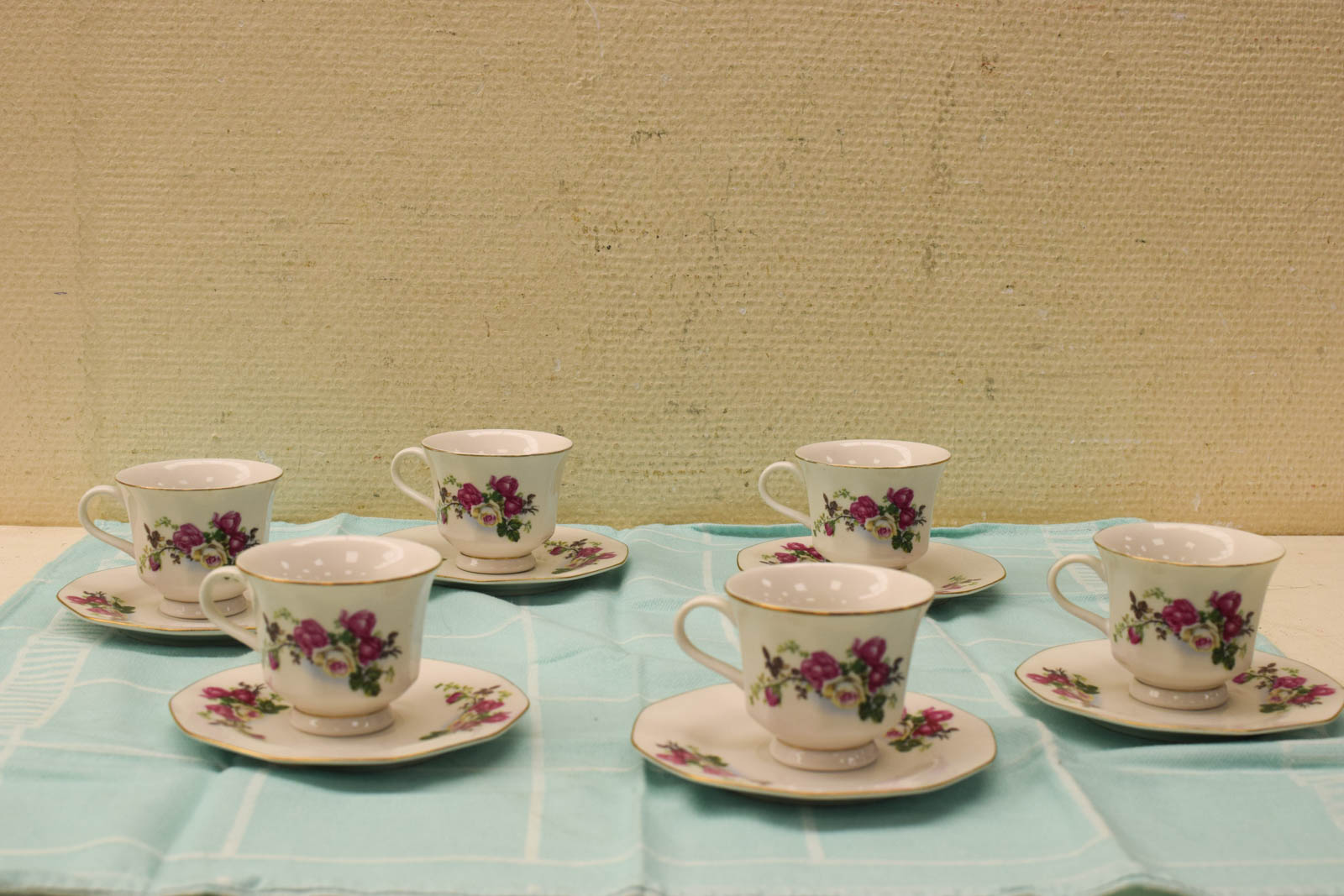 diameter bovenkant opening van het kopje 7,5 cm hoog 6,5 cm diameter van het schoteltje 13,5 cm het servies heeft slijtage van het goudkleurige rand