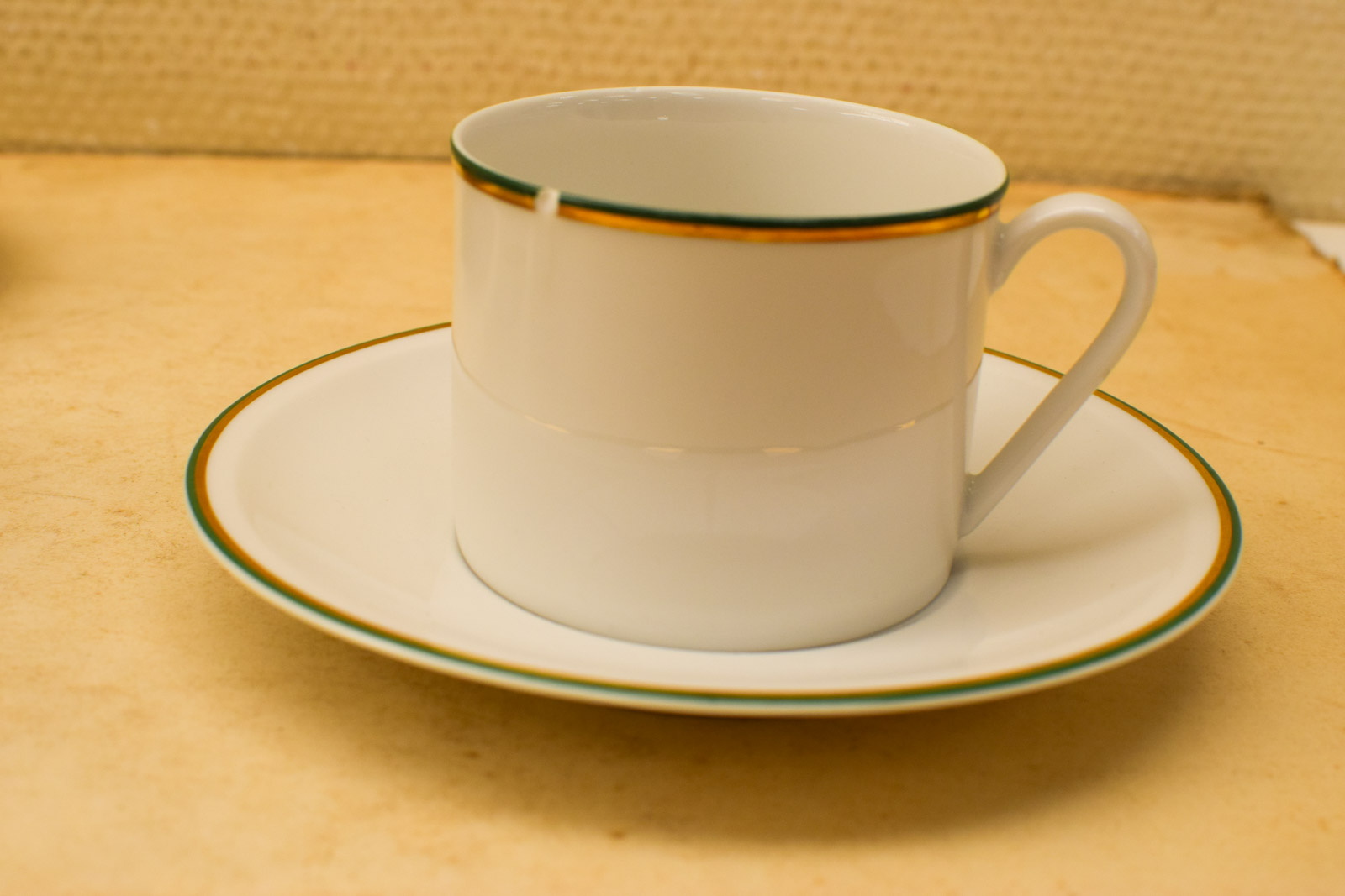 Dit 13-delige Arzberg porseleinen theeservies is een klassiek servies met elegante groen-gouden versiering langs de rand. Het bestaat uit een theepot, melkkan, suikerpot met deksel, twee kopjes met schoteltjes, en twee extra kopjes zonder schotels. Het servies is oorspronkelijk Duits porselein van Arzberg, een fabrikant met ruime geschiedenis in het maken van fijnaardig tafelgoed.
