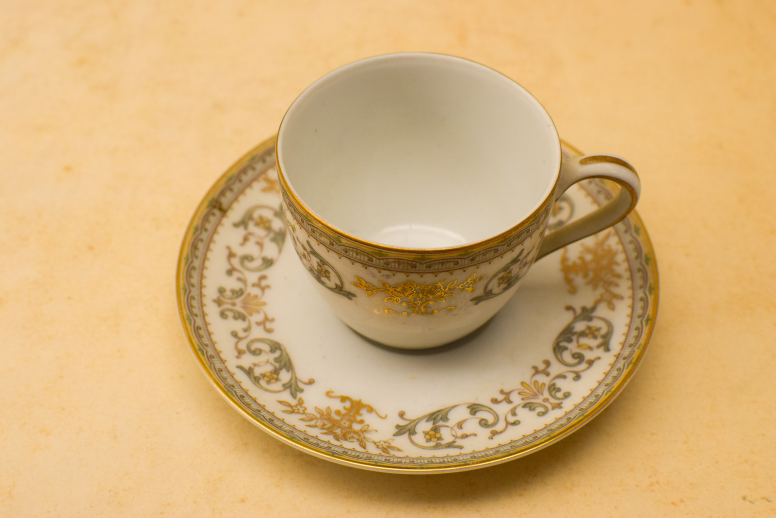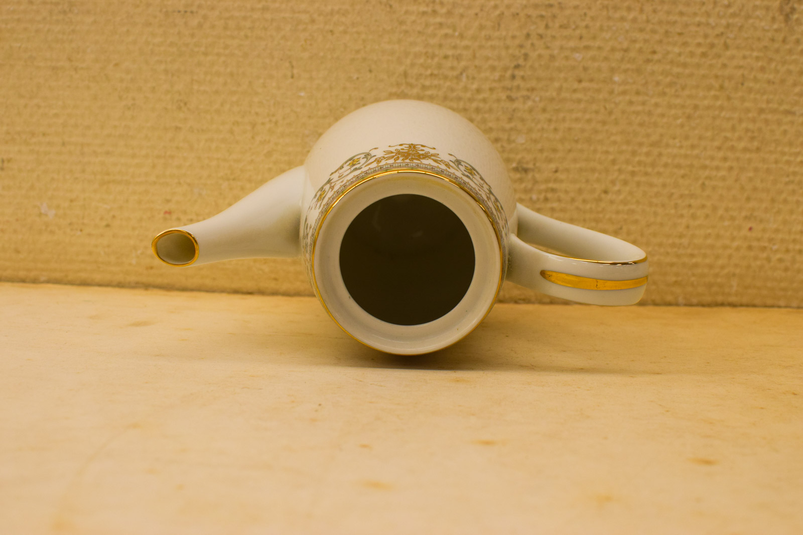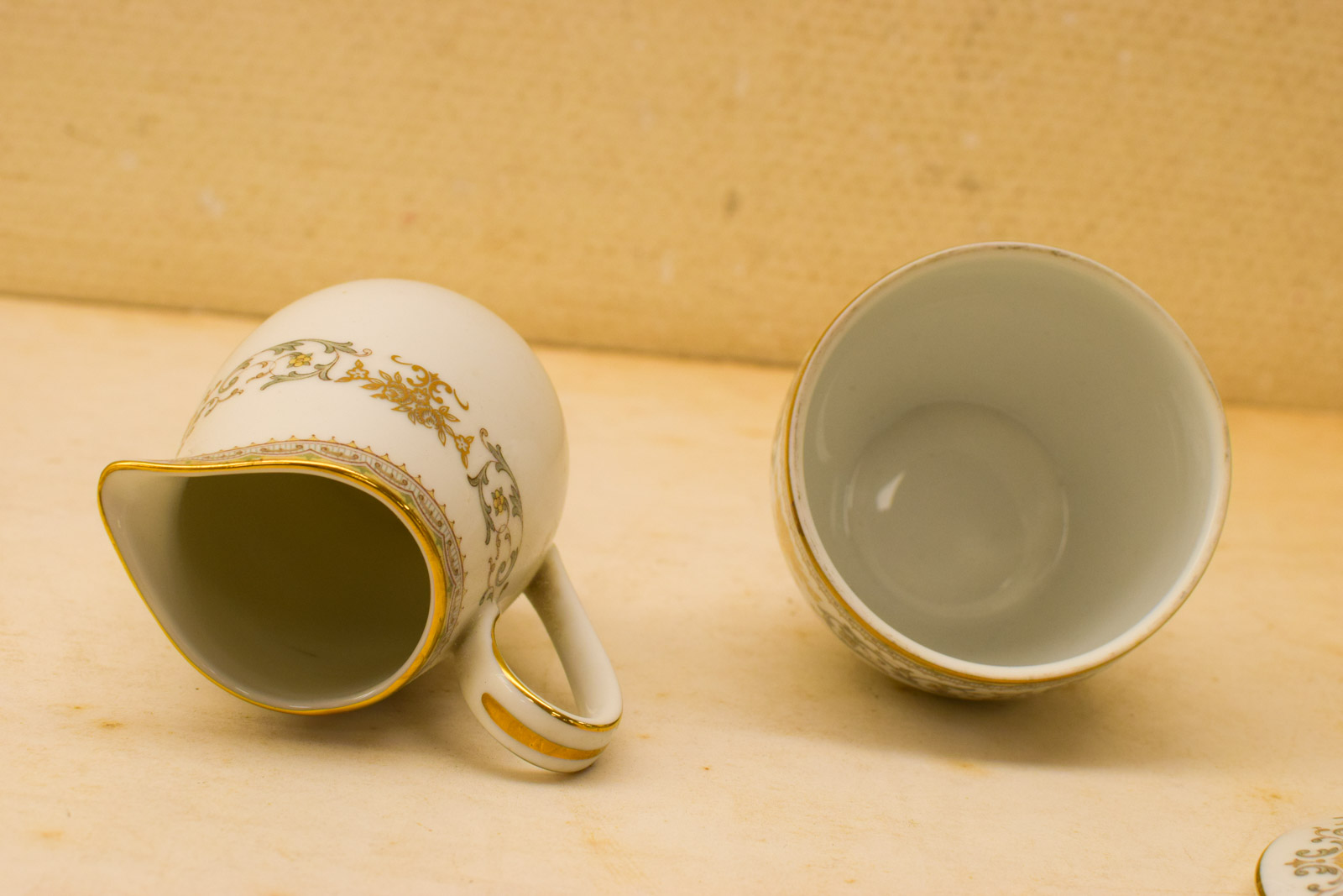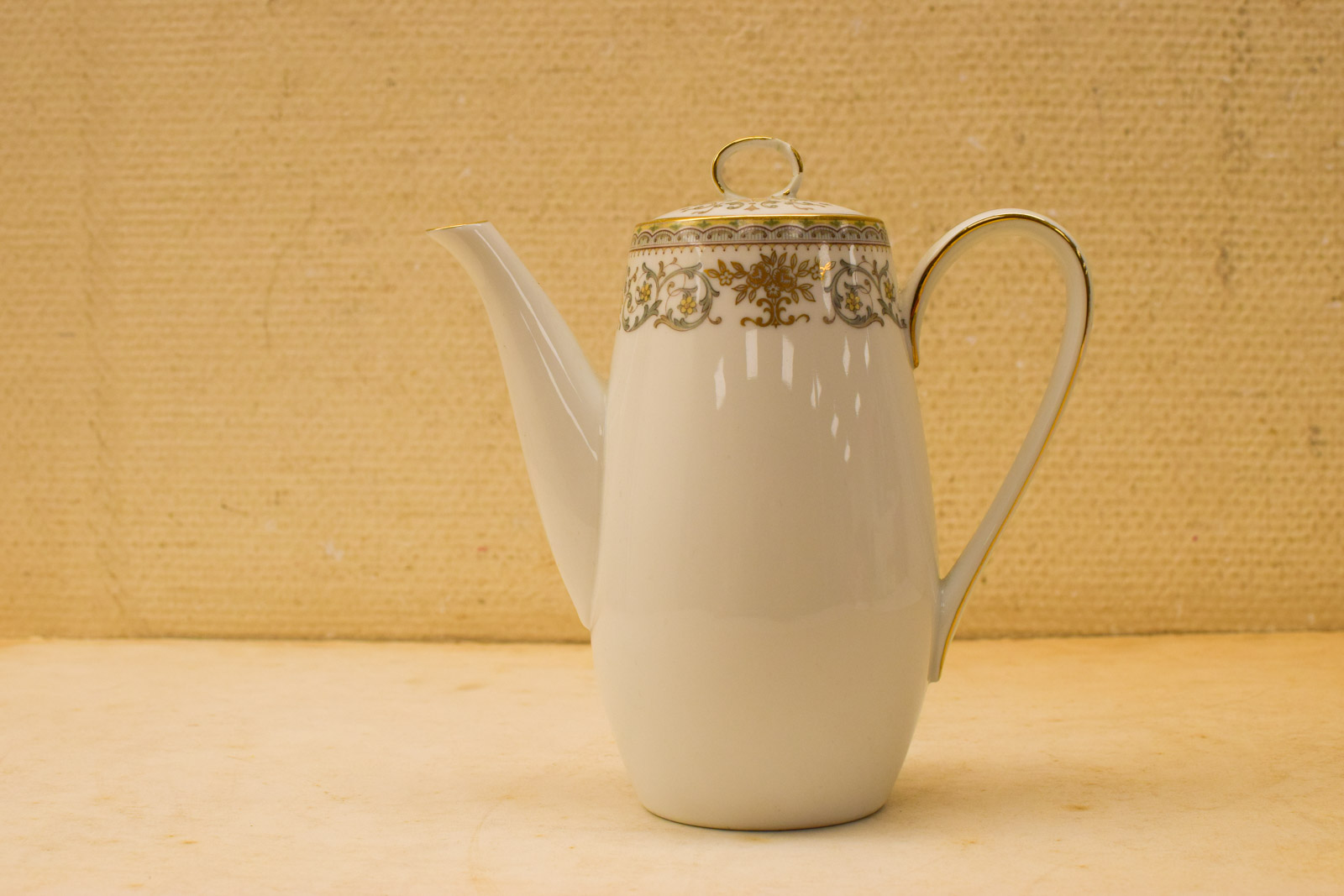 het kopje gemeten diameter bovenkant 6 cm hoog 5 cm diameter van het schaaltje 12 cm melkkannetje gemeten van tuit met oor 9 cm hoog 9 cm suikerpot gemeten zonder deksel diameter bovenkant opening 7,5 cm hoog 7 cm de theepot gemeten zonder deksel van tuit met oor 18 cm hoog 16 cm de dekseltje van de theepot de ronde hendel is stuk zie foto het servies heeft lichte slijtage op het goudkleurige rand
