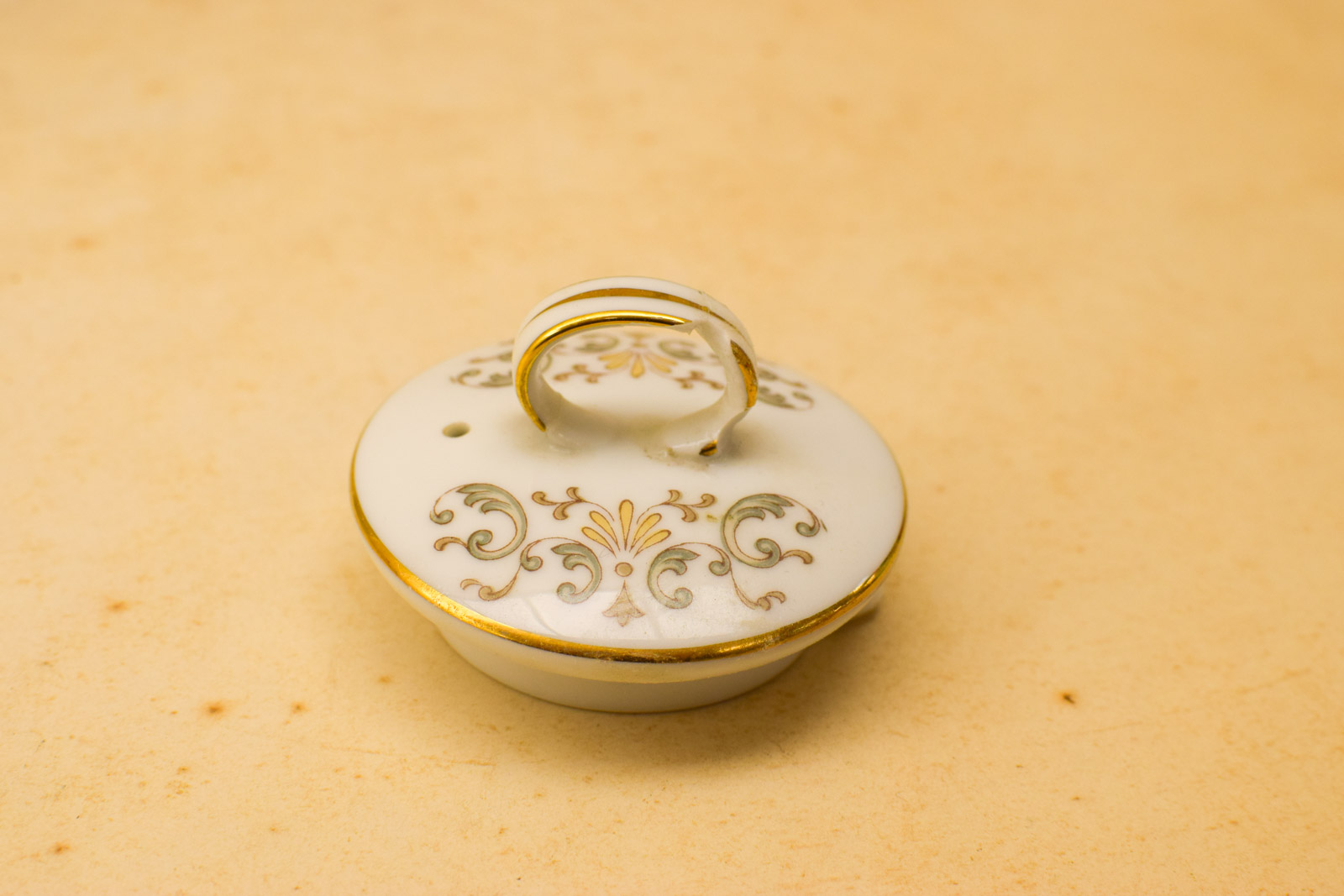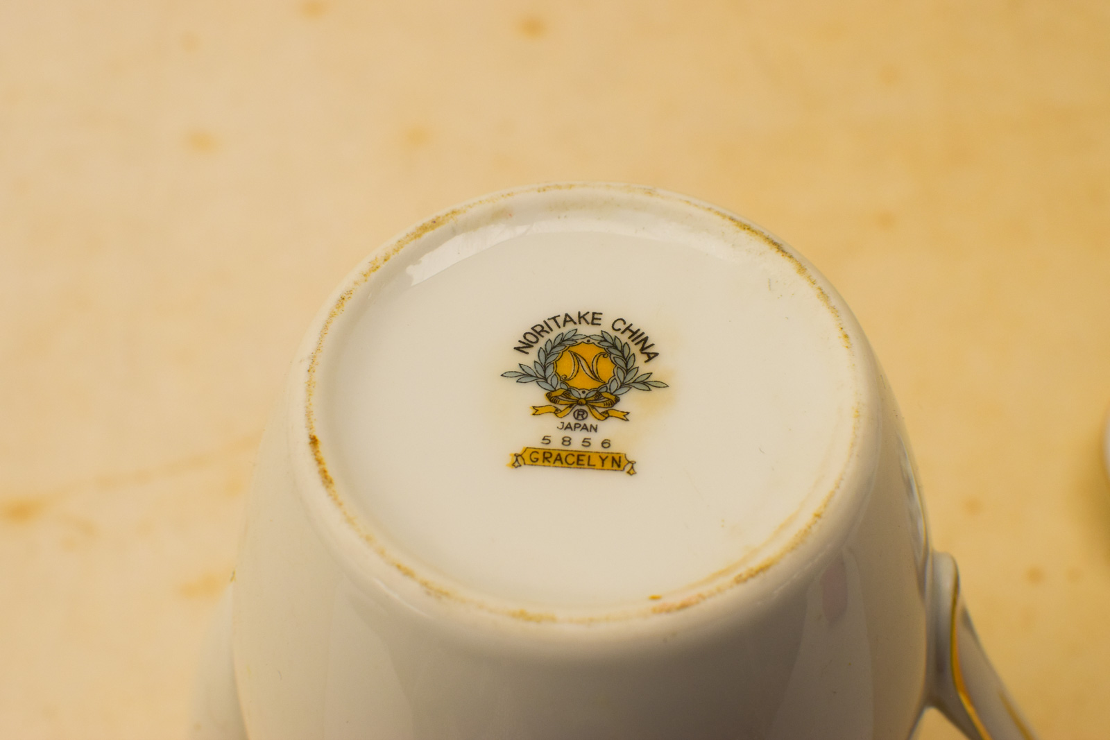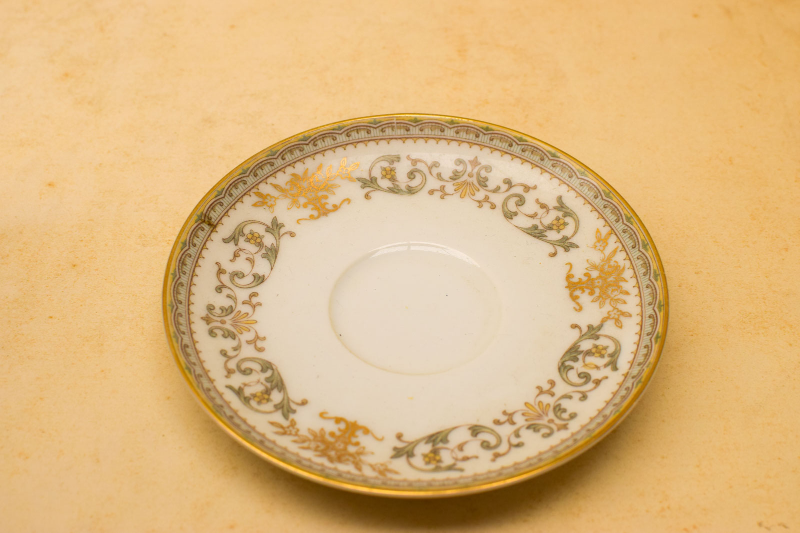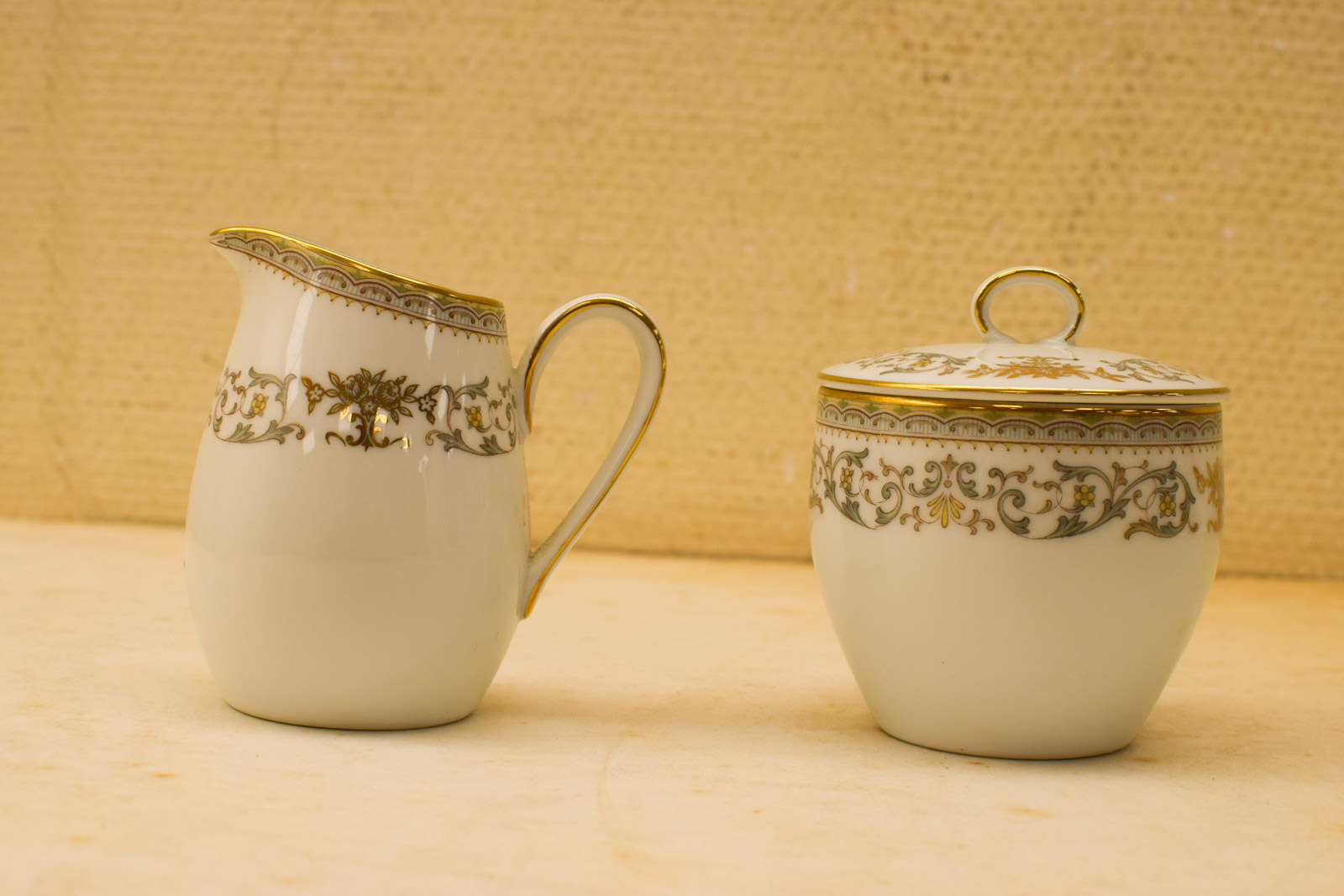 het kopje gemeten diameter bovenkant 6 cm hoog 5 cm diameter van het schaaltje 12 cm melkkannetje gemeten van tuit met oor 9 cm hoog 9 cm suikerpot gemeten zonder deksel diameter bovenkant opening 7,5 cm hoog 7 cm de theepot gemeten zonder deksel van tuit met oor 18 cm hoog 16 cm de dekseltje van de theepot de ronde hendel is stuk zie foto het servies heeft lichte slijtage op het goudkleurige rand
