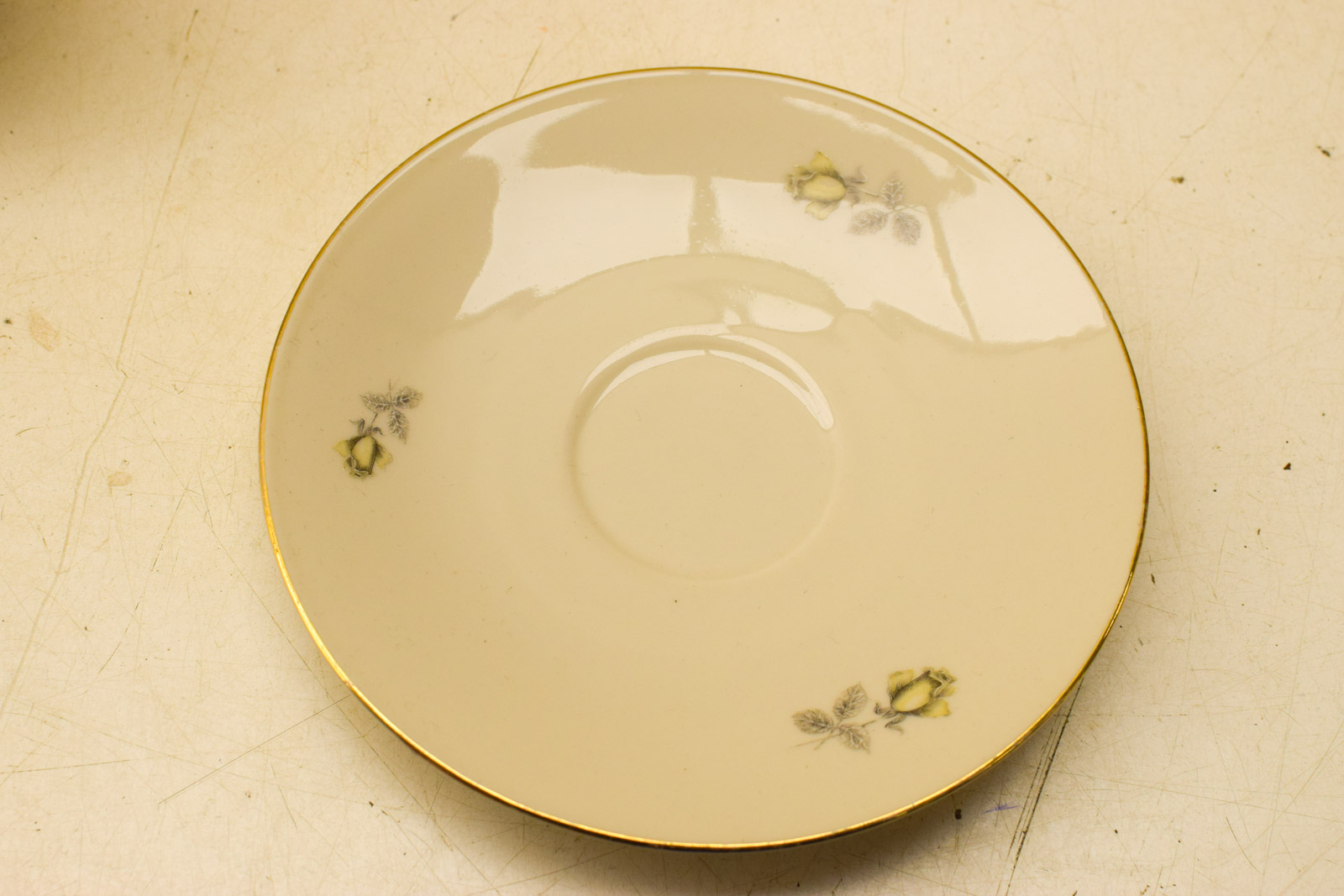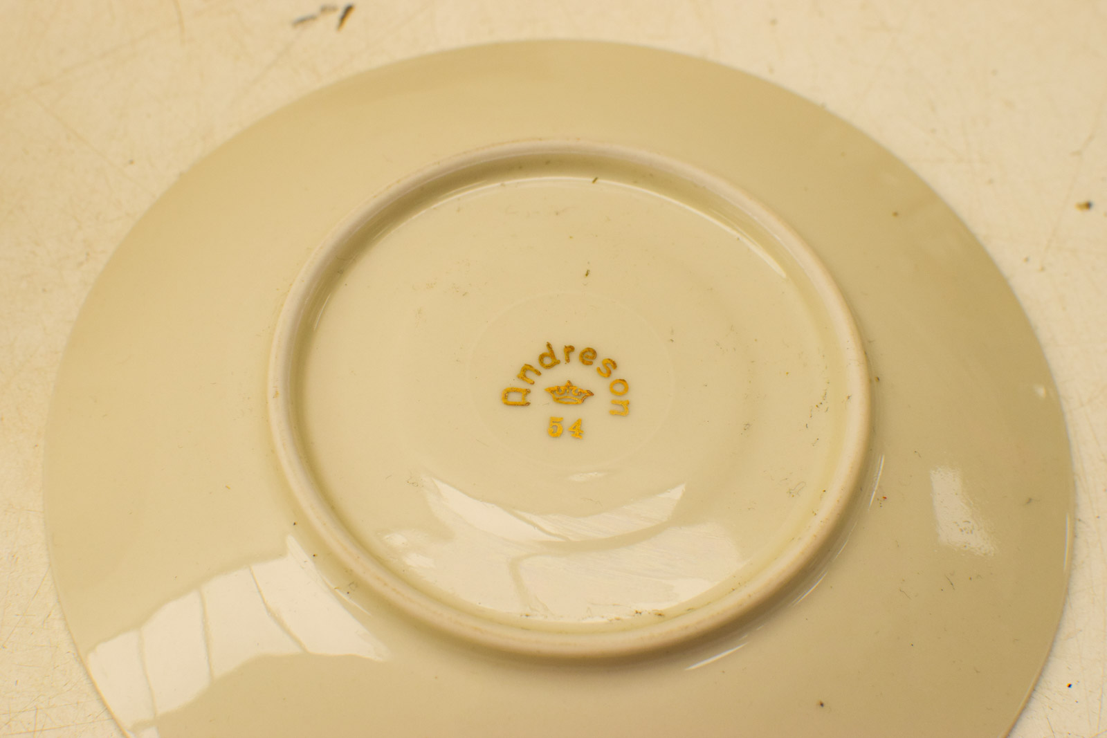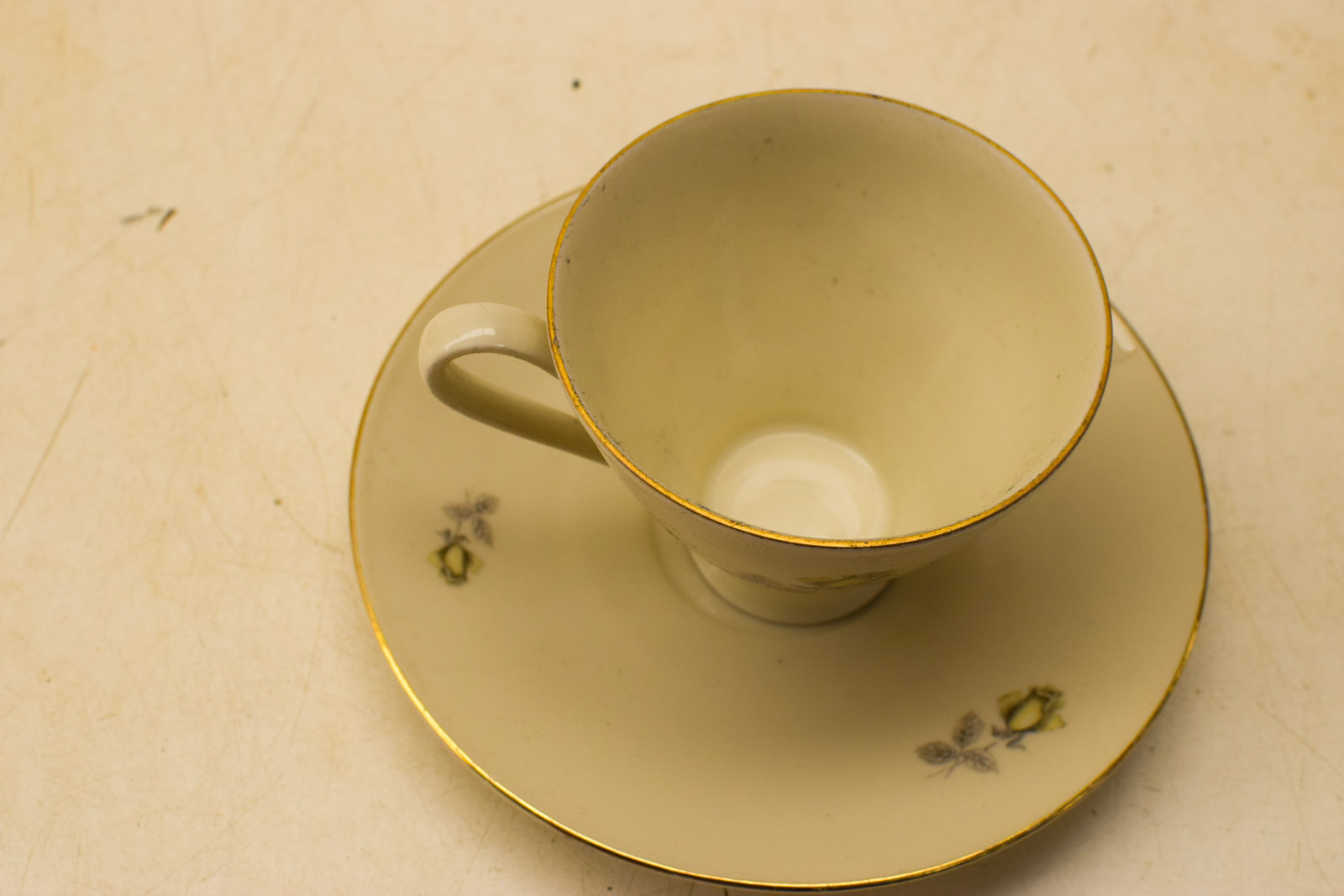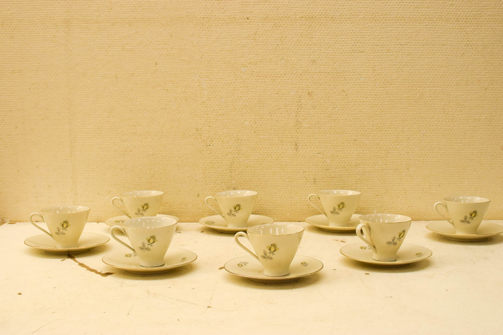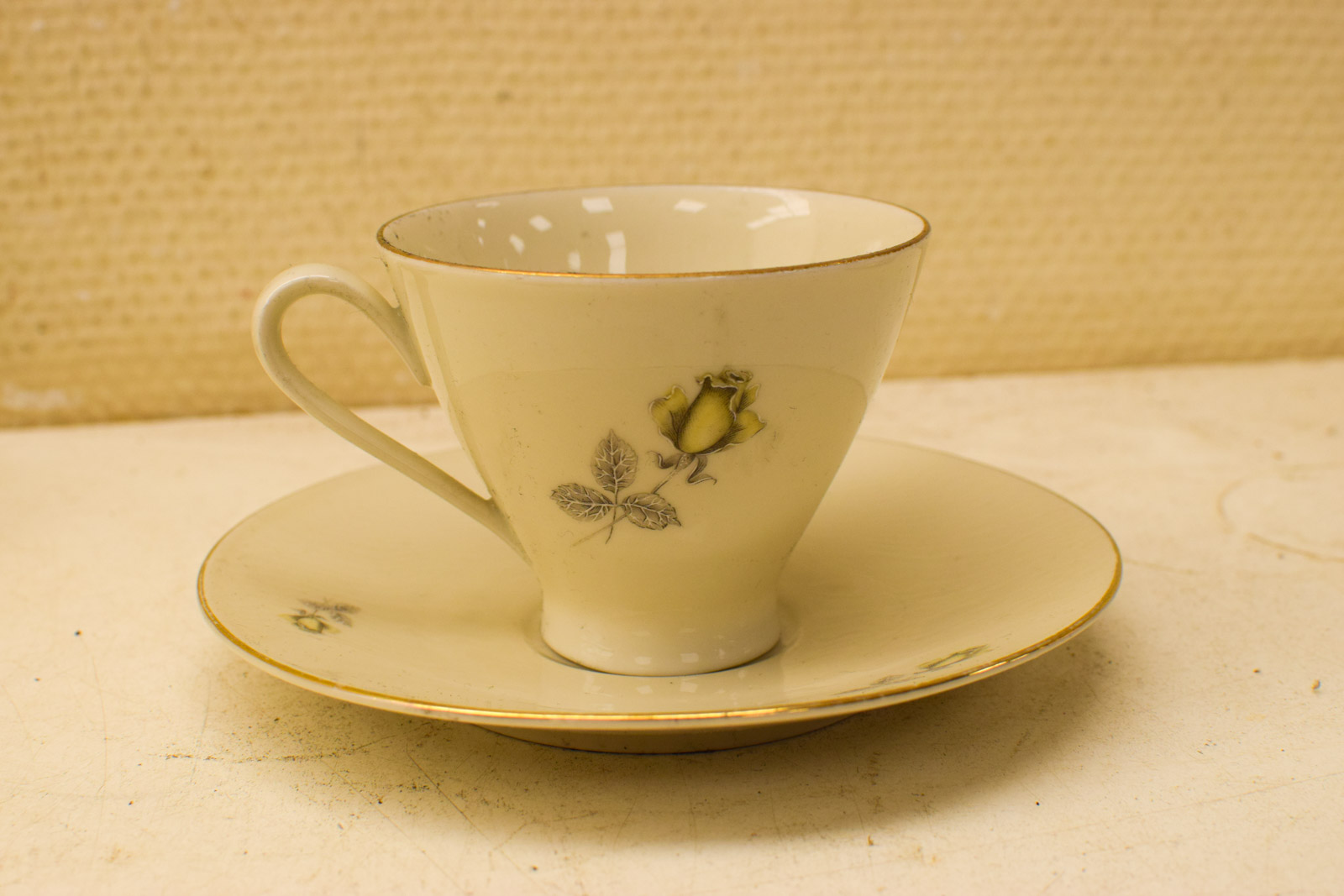 het kopje gemeten diameter bovenkant opening 8,5 cm hoog 7 cm diameter en het schoteltje 15 cm het servies heeft slijtage op het geverfde randje heeft lichte krasjes