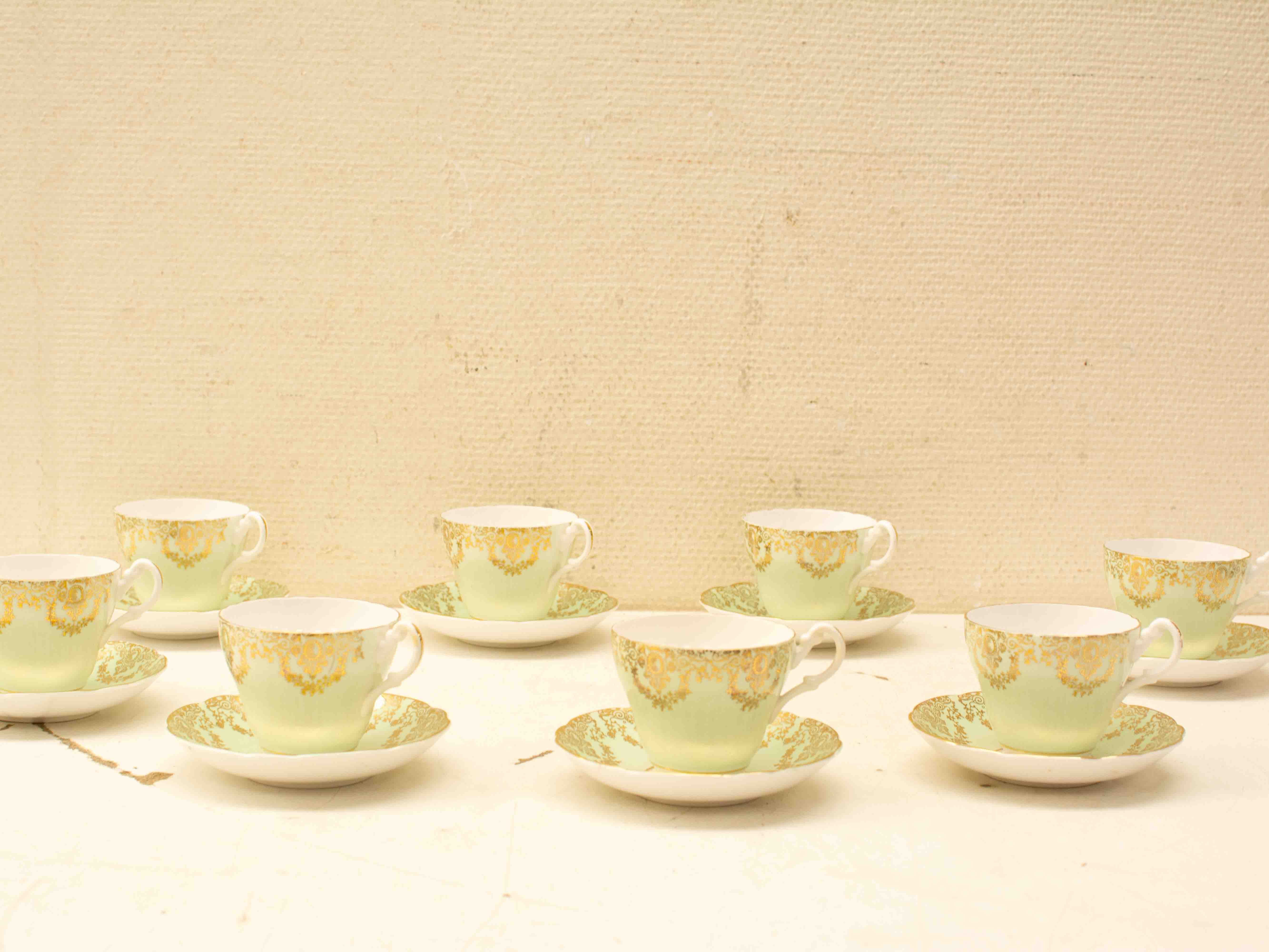 diameter bovenkant opening van het kopje 8,5 cm hoog 7 cm diameter van het schoteltje 14 cm het servies heeft wat vlekjes en krasjes en wat slijtage op het verf