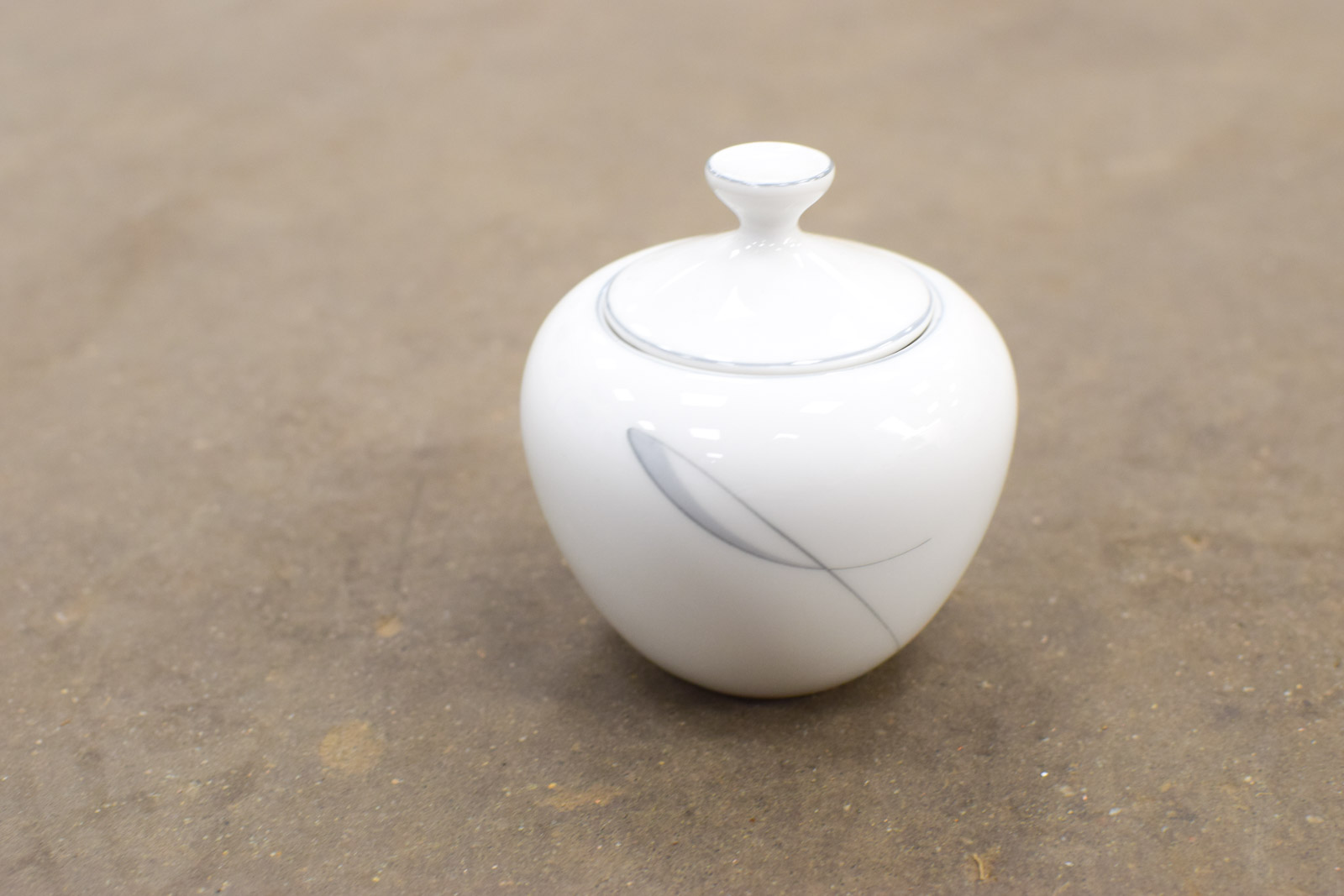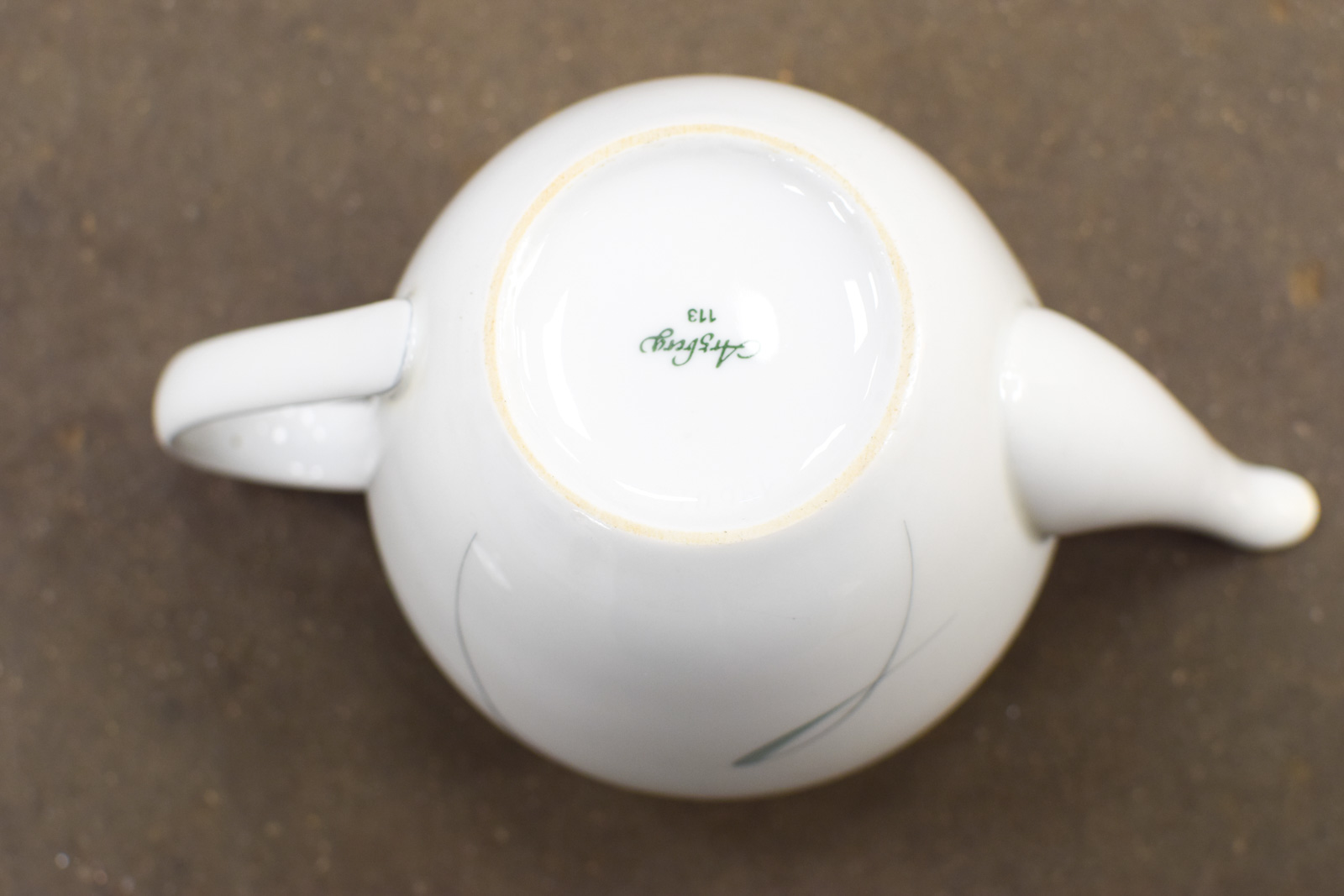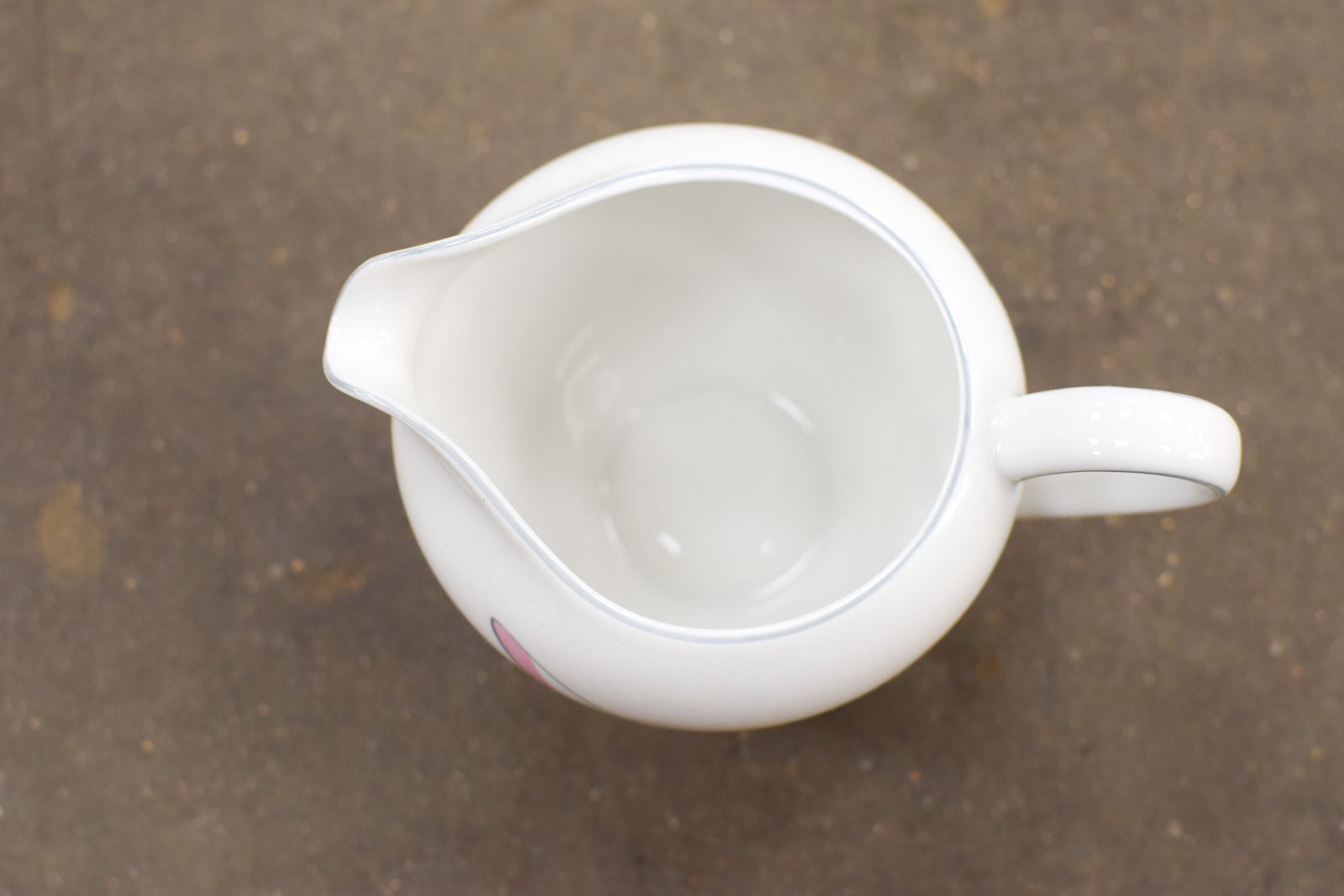 het kopje gemeten diameter bovenkant 7 cm hoog 6 cm diameter vn het schoteltje 13 cm melkkanetje gemeten van oor tot tuit 12 cm hoog 8 cm het suikerpotje gemeten diameter bovenkant opening 6 cm gemeten zonder deksel 8 cm hoog de theepot gemeten van oor tot tuit 23 cm gemeten zonde deksel 12 cm de deksel mist een stukje en heeft slijtage op het geverfde randje