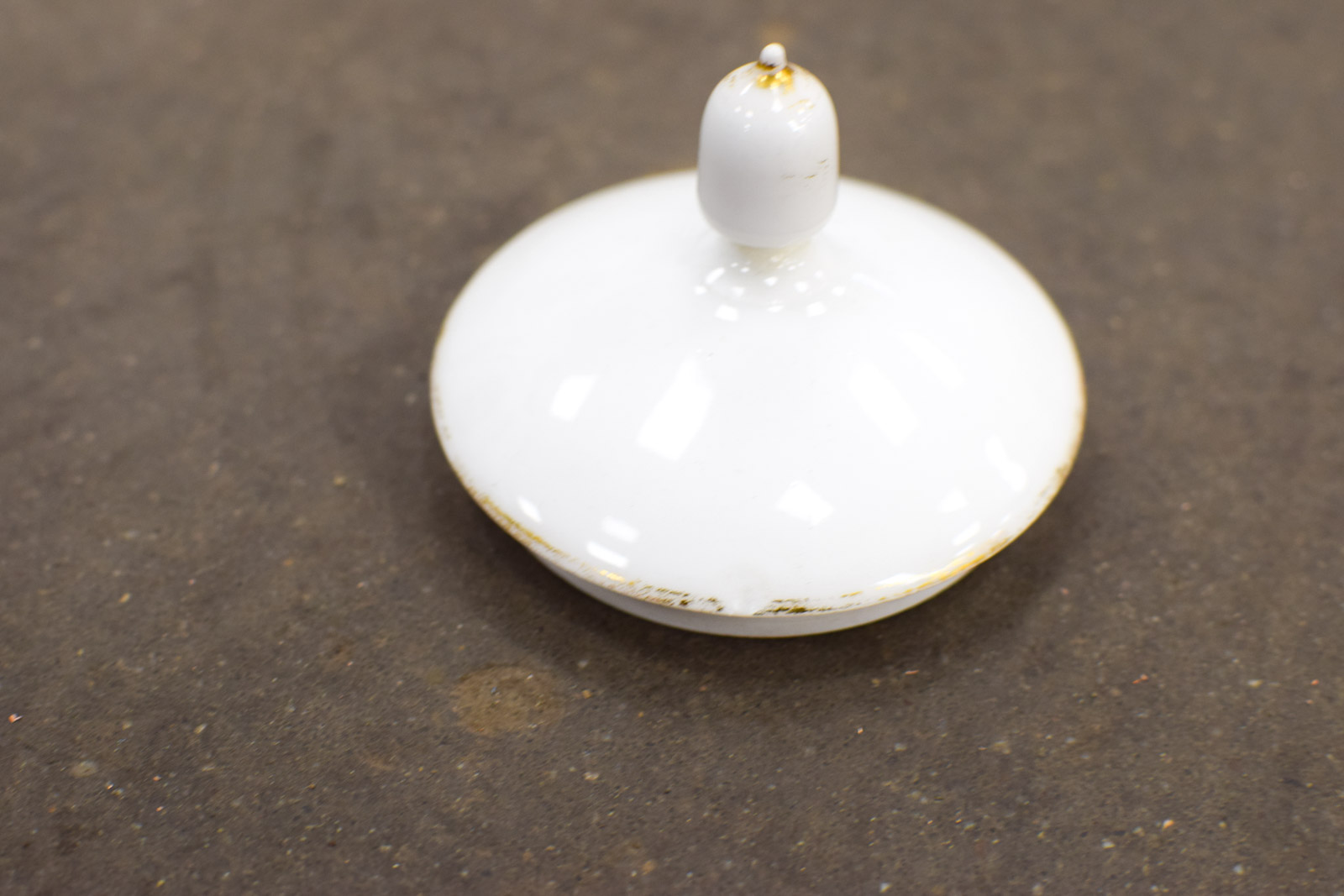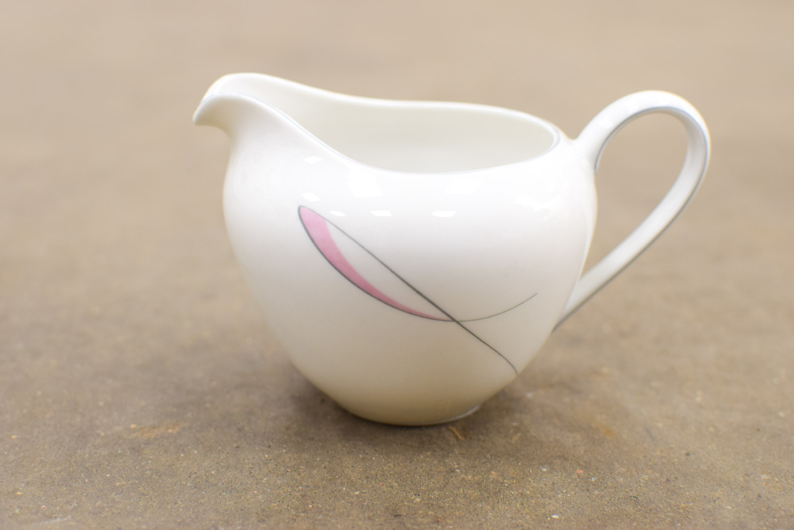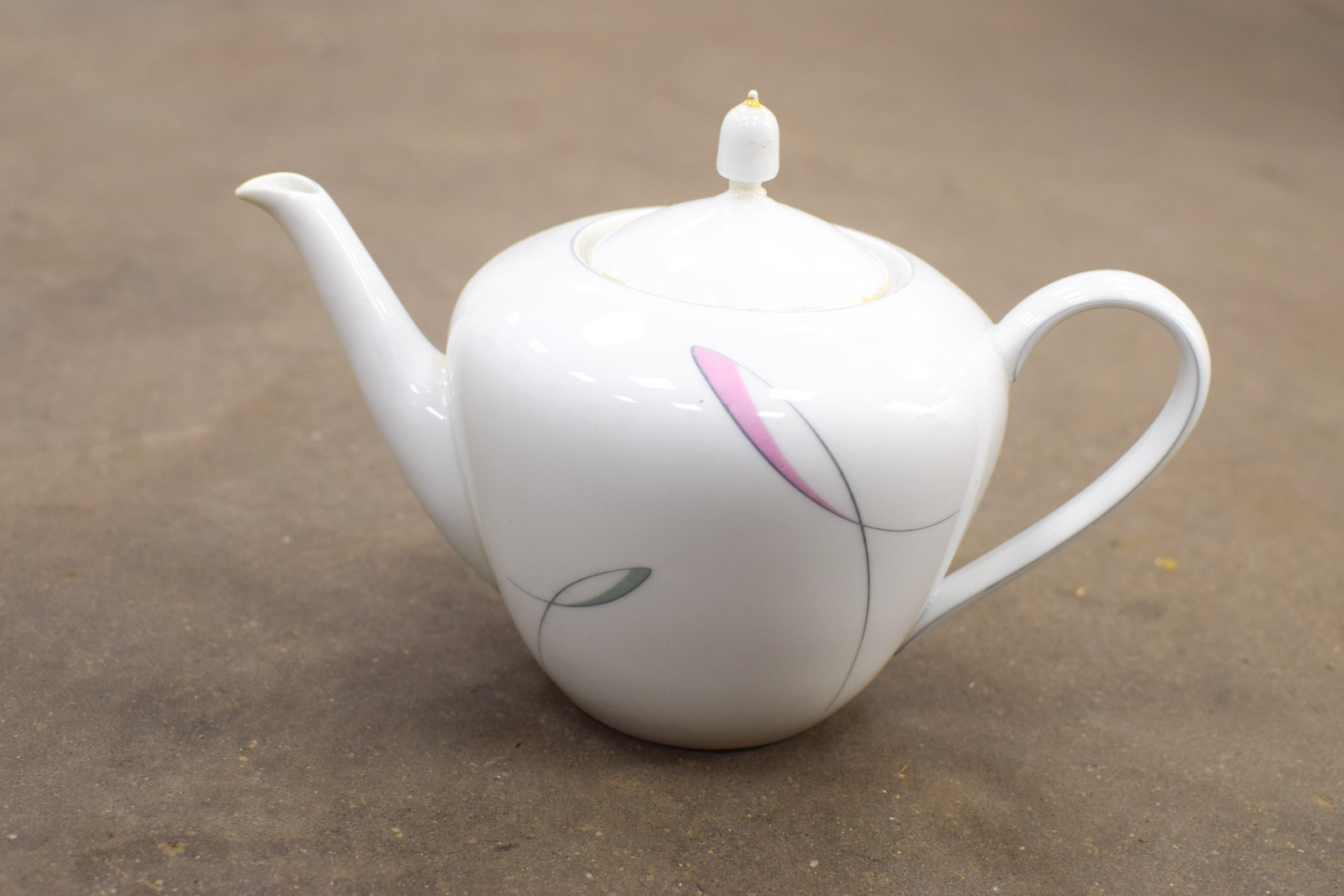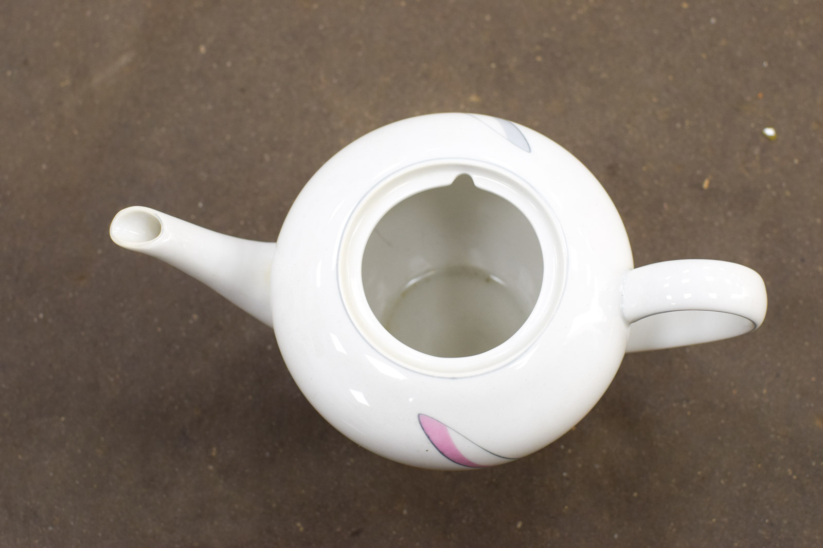 het kopje gemeten diameter bovenkant 7 cm hoog 6 cm diameter vn het schoteltje 13 cm melkkanetje gemeten van oor tot tuit 12 cm hoog 8 cm het suikerpotje gemeten diameter bovenkant opening 6 cm gemeten zonder deksel 8 cm hoog de theepot gemeten van oor tot tuit 23 cm gemeten zonde deksel 12 cm de deksel mist een stukje en heeft slijtage op het geverfde randje