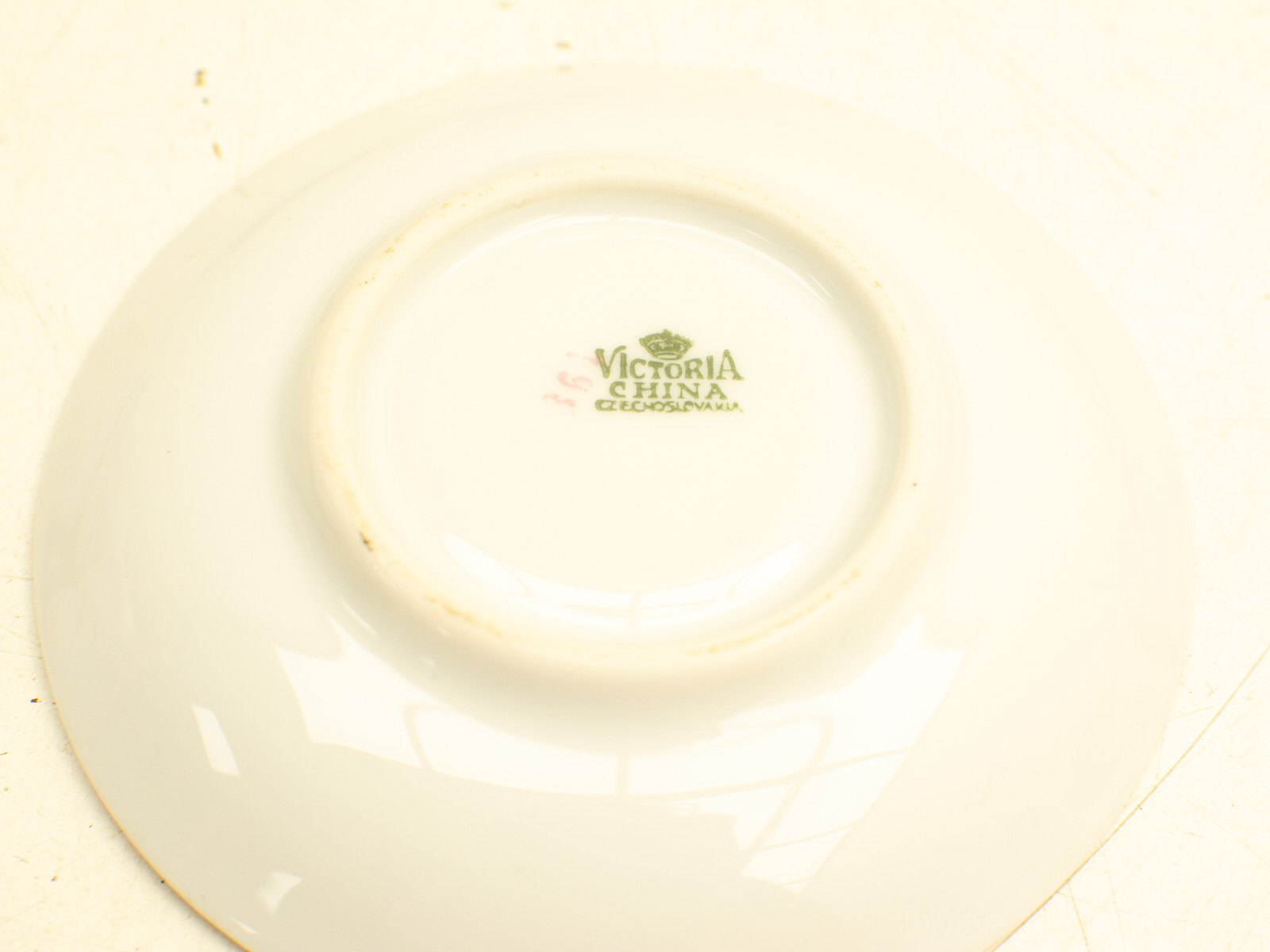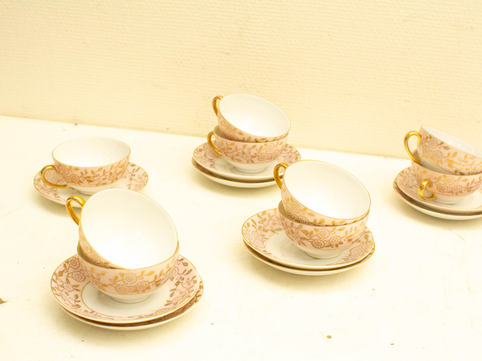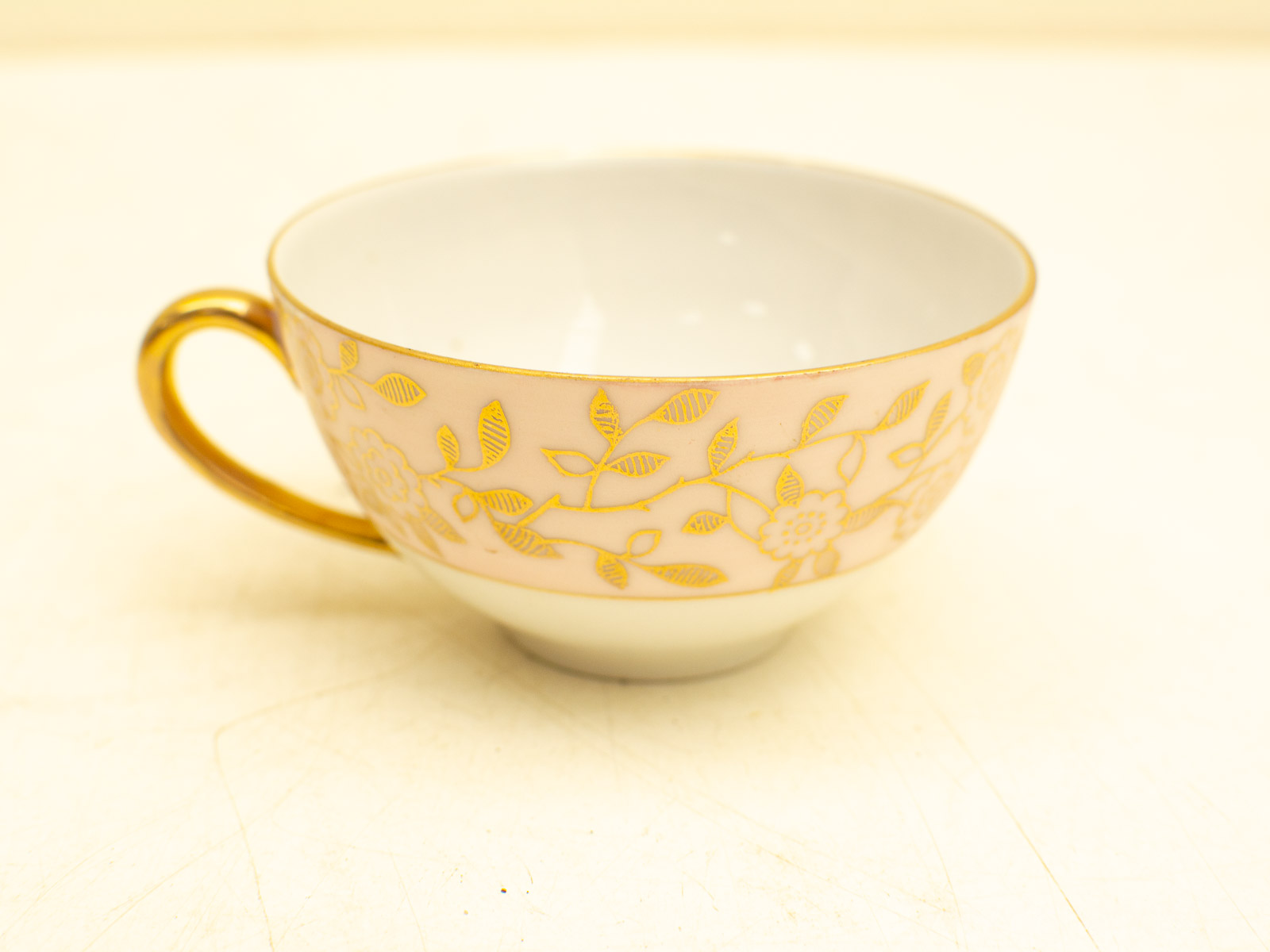 lichte slijtage kleur is roze goud kleur en wit kopje hoogte 4.5 cm diameter 8,5 cm diameter van het schoteltje 12,5 cm
