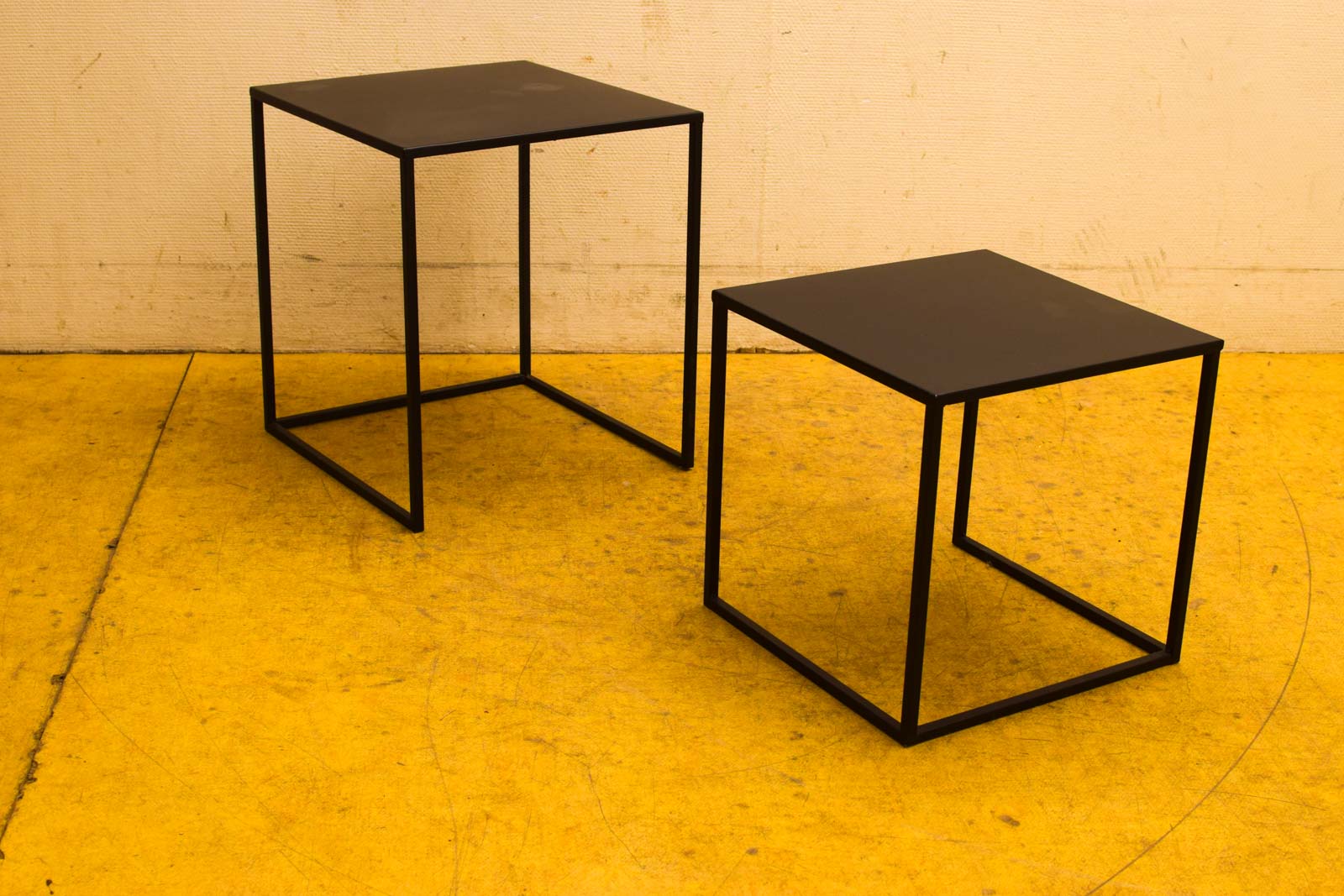 de tafels zijn van metaal bij 1 is op de bovenblad een beschadiging de tafeltjes hebben krasjes door het gebruik de grootste gemeten breed 40 cm diepte 40 cm hoog 45 cm