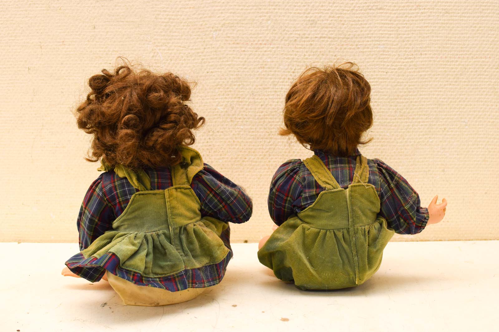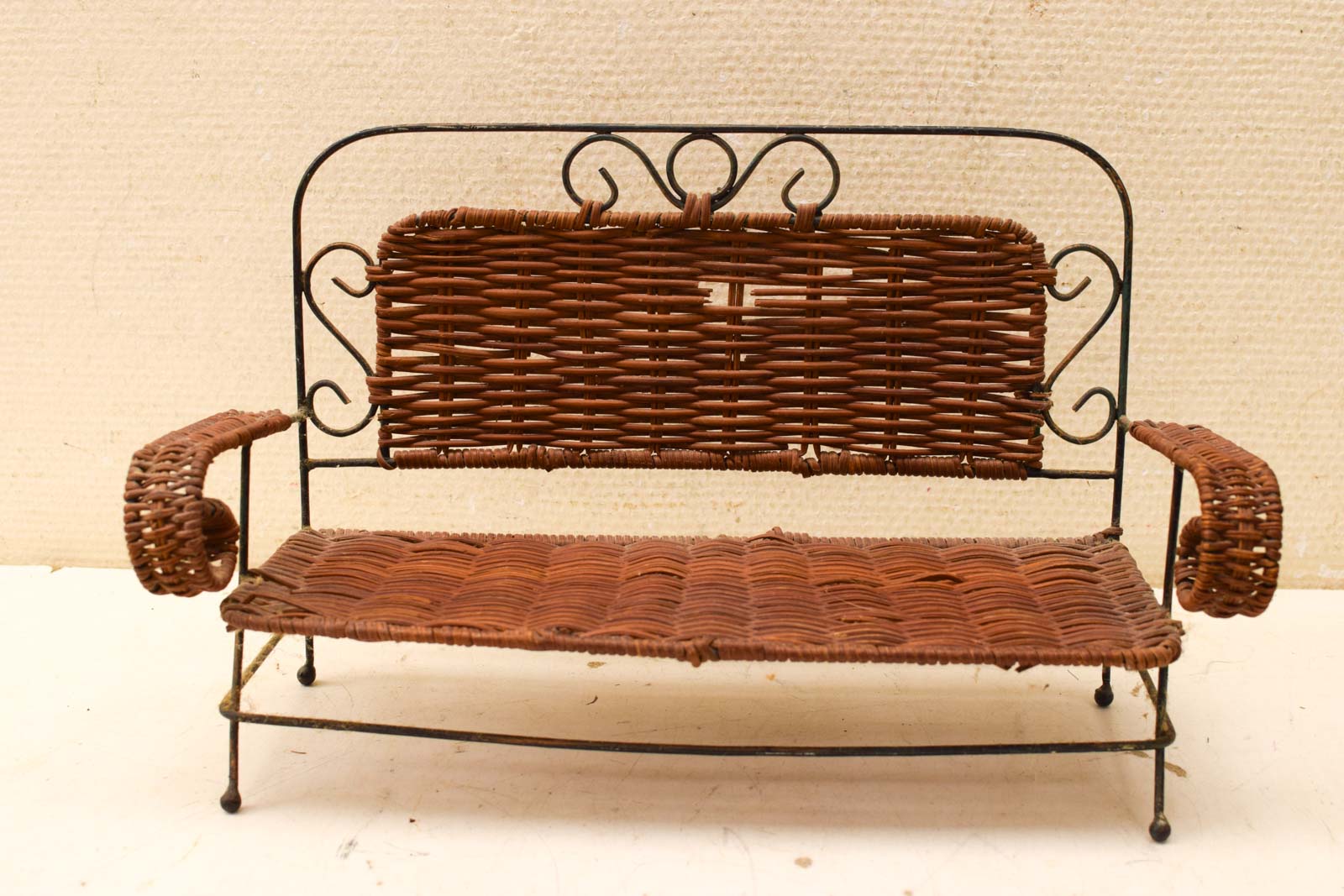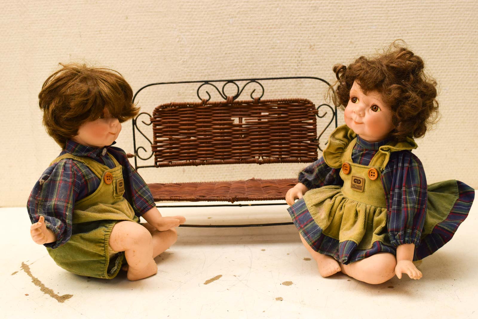 de poppen zijn van porselein en het buikje van stof de de meisjes pop gemeten hoog 26,5 cm van hand tot hand breed ongeveer 25 cm het bankje gemeten van leuning tot leuning 39 cm diepte 13,5 cm hoog 24 cm het bankje heeft een gat in de rugleuning en aan de onderkant roest de poppen zijn nog heel