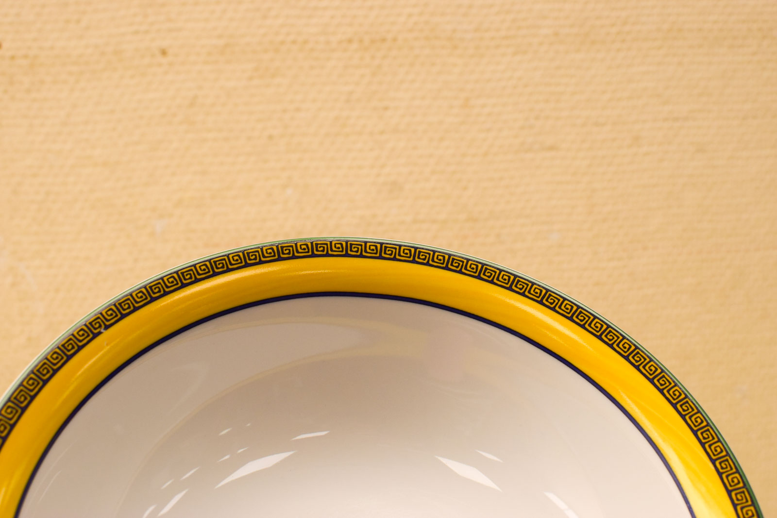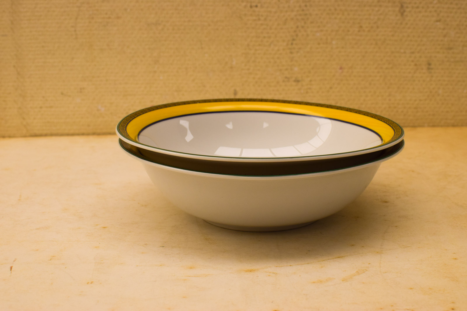 1 schaal heeft krassen aan de binnenkant vooral op de bodem de andere schaal ziet er redelijk uit diameter bovenkant 23 cm hoog 6 cm
