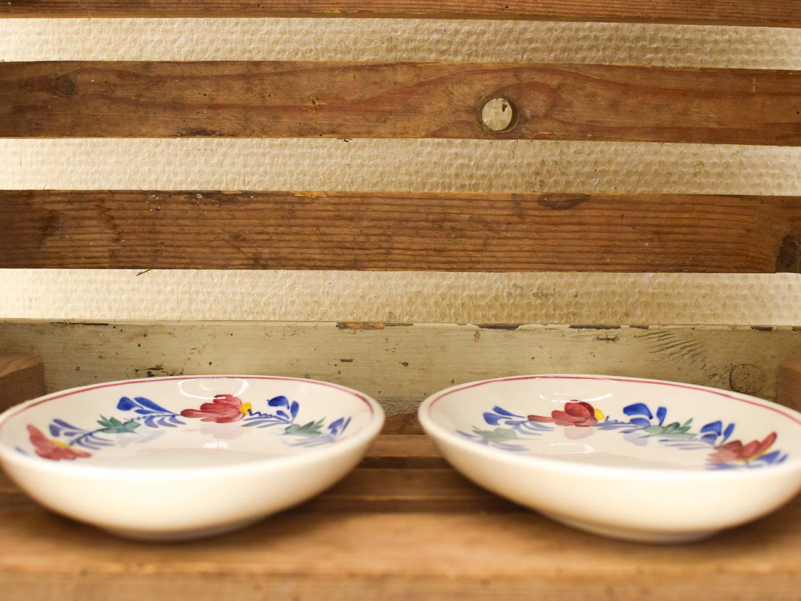 Deze boerenbont schaaltjes vertonen lichte krasjes op het glazuurwerk, wat gebruikelijk is voor servies van deze leeftijd. Dit beperkt hun functionaliteit niet en hoort bij het karakter van vintage servies. Ze zijn verder in redelijke staat en volledig functioneel.