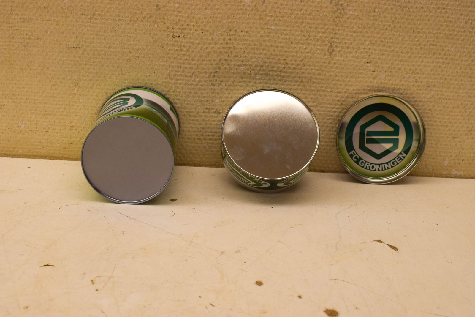 1 is een spaarpot heeft geen opening aan de onderkant en 1 bewaarblikje de spaarpot gemeten hoog 12 cm diameter bovenkant 10 cm
