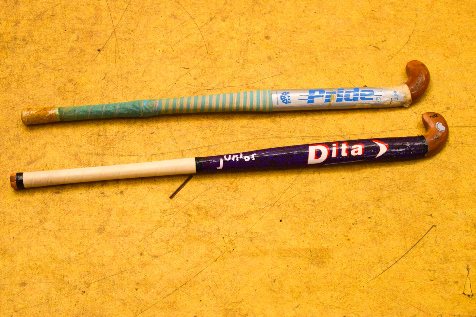 Dit hockeystick setje bevat alles wat je nodig hebt om te starten: 2 hockeysticks, 2 ballen en een praktische draagtas. De sticks zijn elk 86 cm hoog en voorzien van verschillende merknamen, waaronder Dita en Pride. De ene stick heeft een zwartblauwe grip, de ander een groene gestreepte grip.
