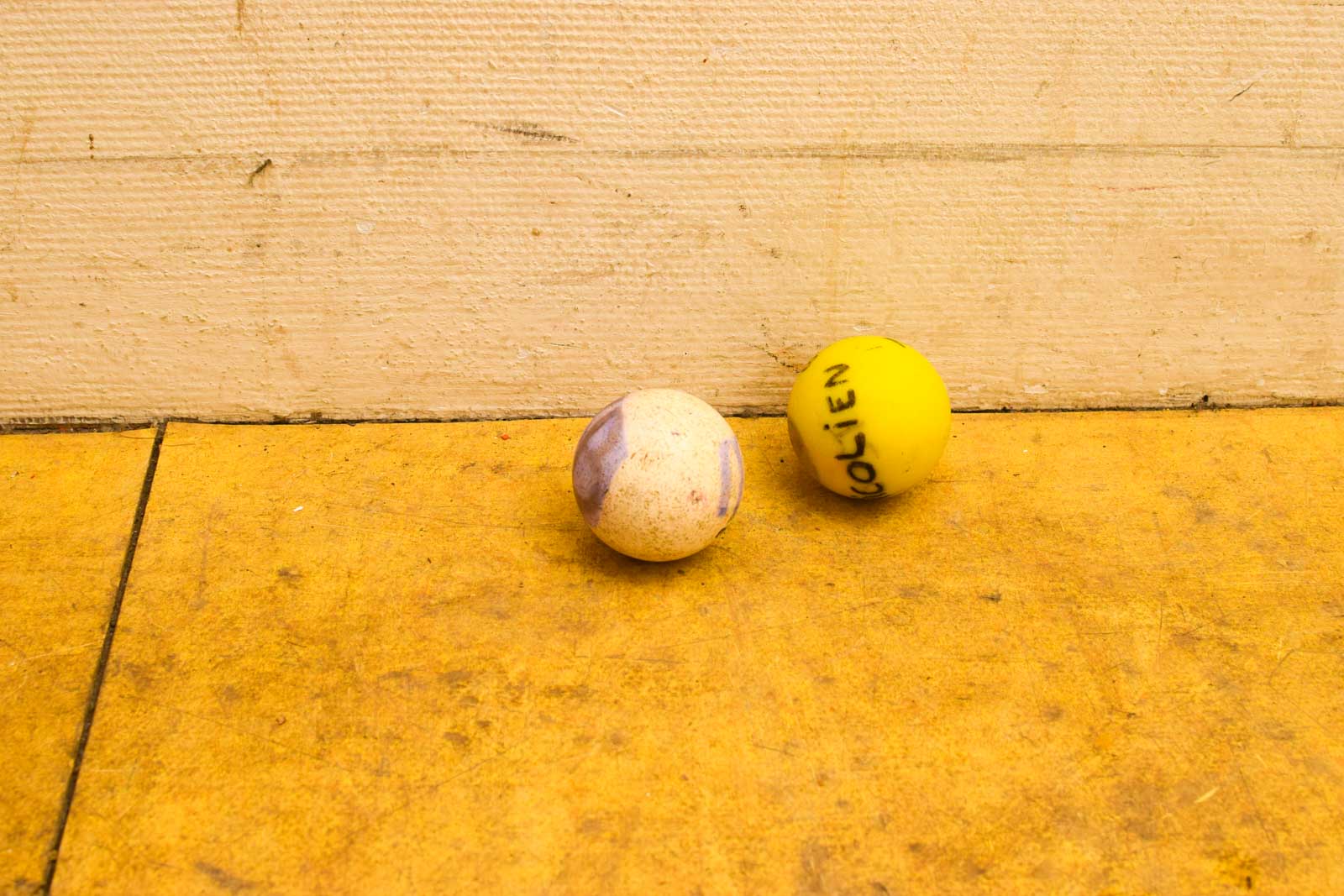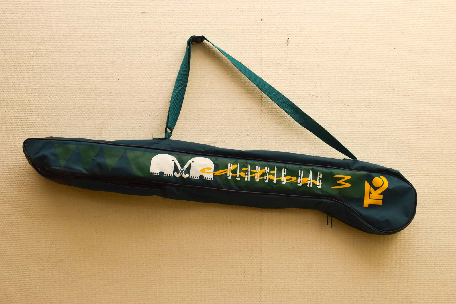 Het setje is gebruikt en draagt duidelijk de sporen van regelmatig spel mee. De ballen hebben opschriften erop staan en tonen normale gebruikssporen. De draagtas, voorzien van olifantenmotieven en gele accenten, maakt het transport makkelijk. Dit is een compleet starter- of vervangingssetje tegen een scherpe prijs.