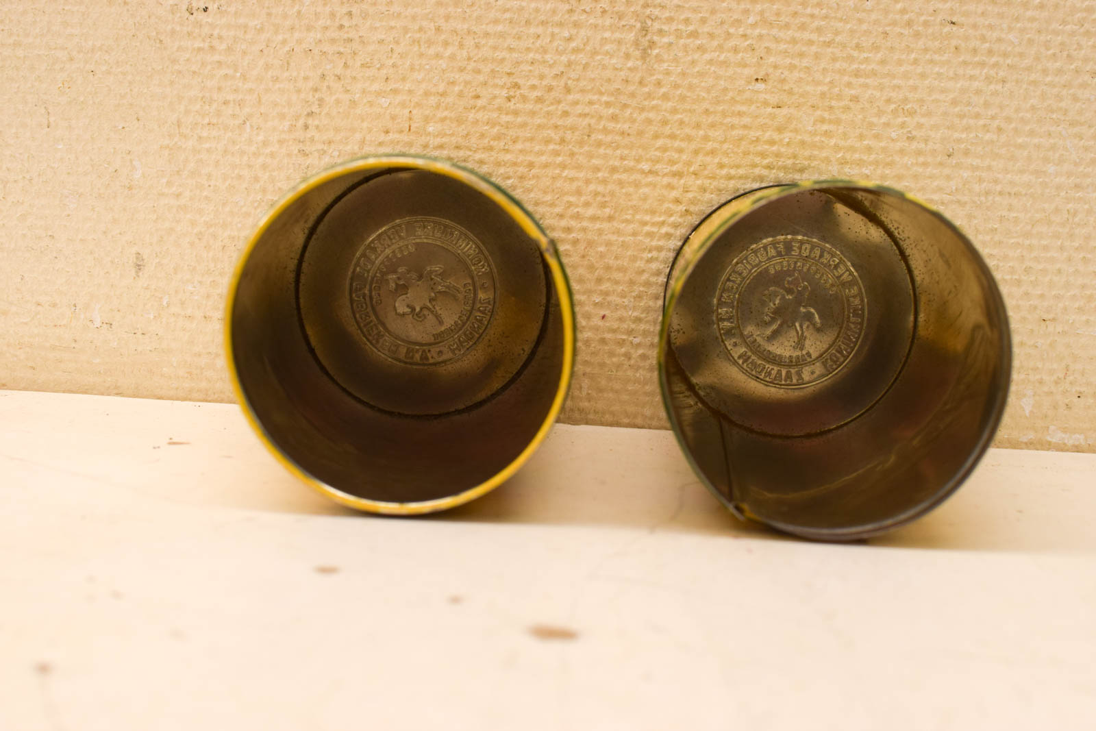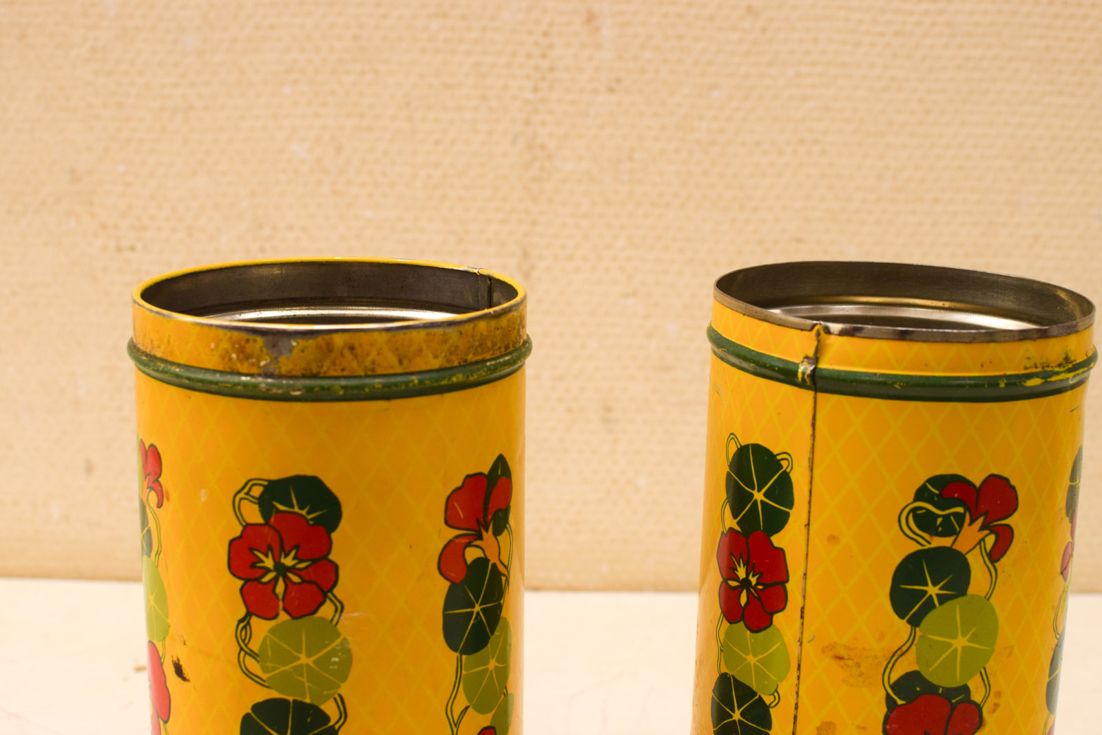ze zijn beiden gebruikt en hebben gebruikssporen en deukjes de deksels sluiten nog goed gemeten zonder deksel diameter bovenkant opening 10 cm hoog 20,5 cm