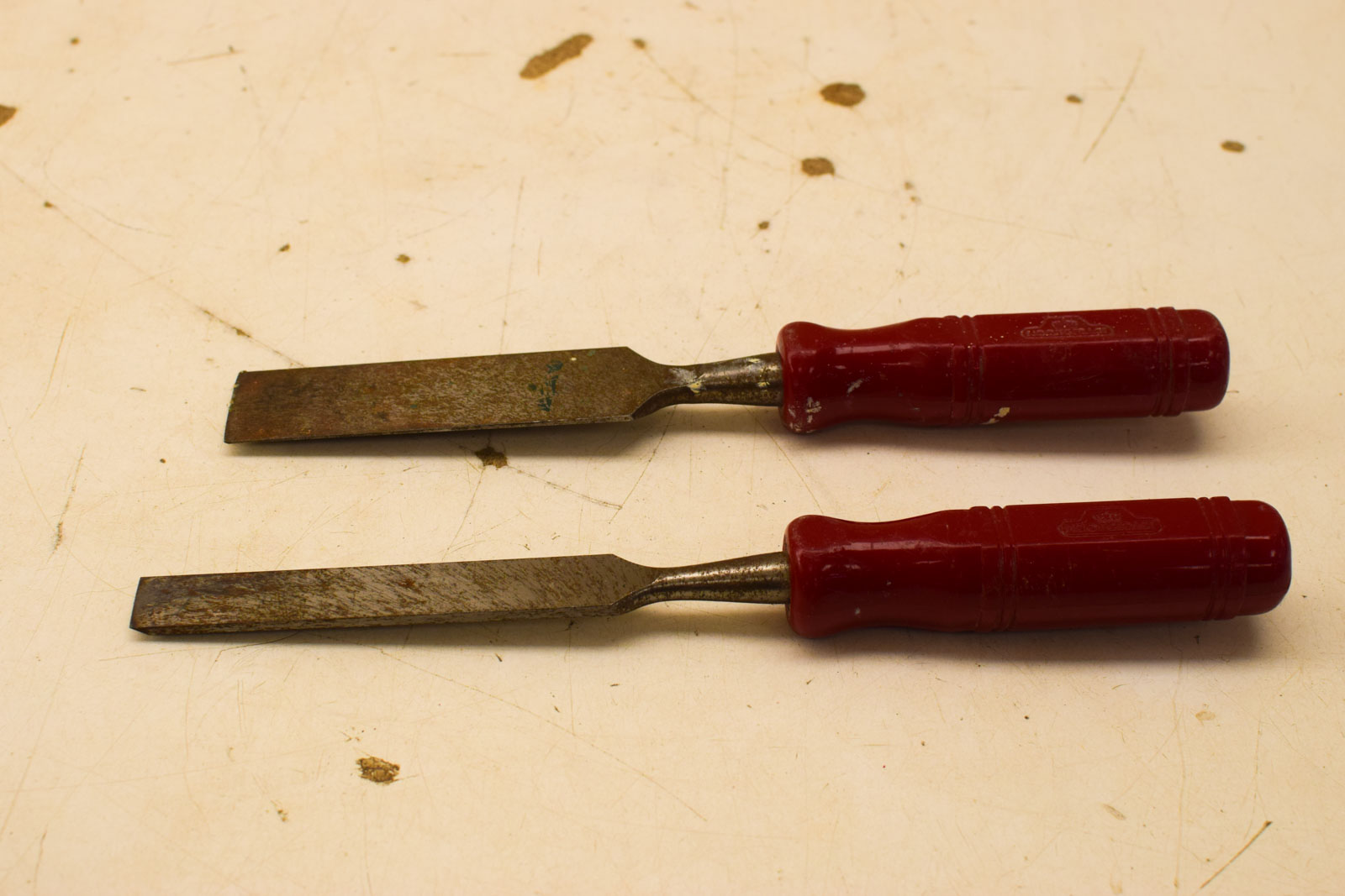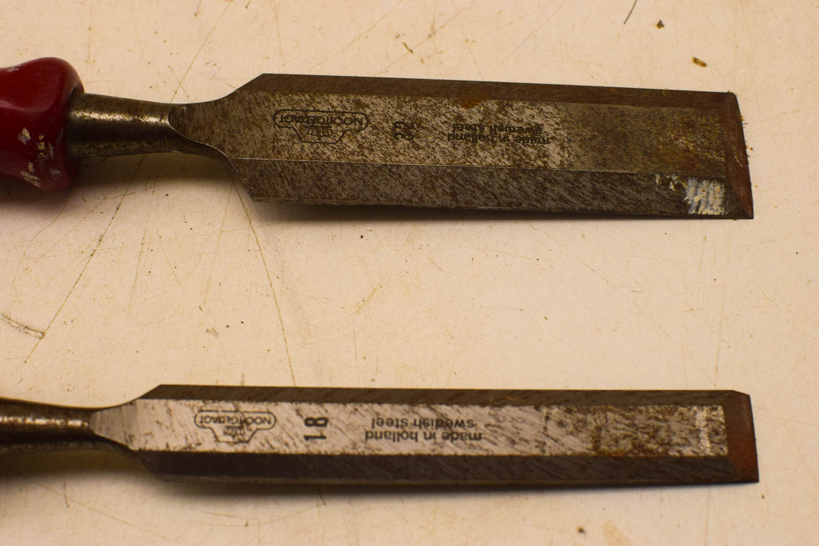 De beitels zijn gebruikt maar nog in goede werkende staat. Op de metalen bladen zie je normale slijtage en patina van gebruik, en de rode handvaten vertonen oppervlakkige krassen en verkleuringen. Dit zijn echter cosmetische gebruikssporen die de functionaliteit niet aantasten. Nooitgedacht is een gerenommeerd Nederlands merk dat bekend staat om kwaliteit en duurzaamheid van handgereedschap.