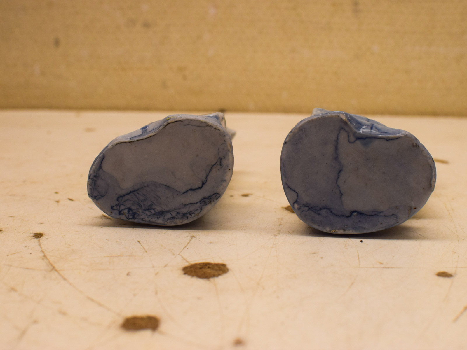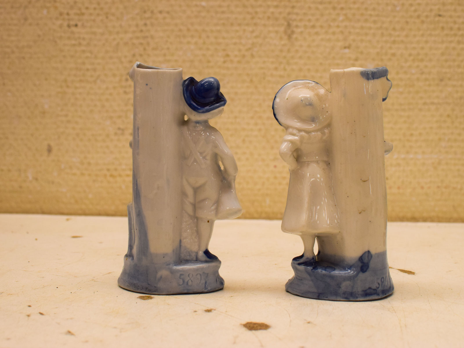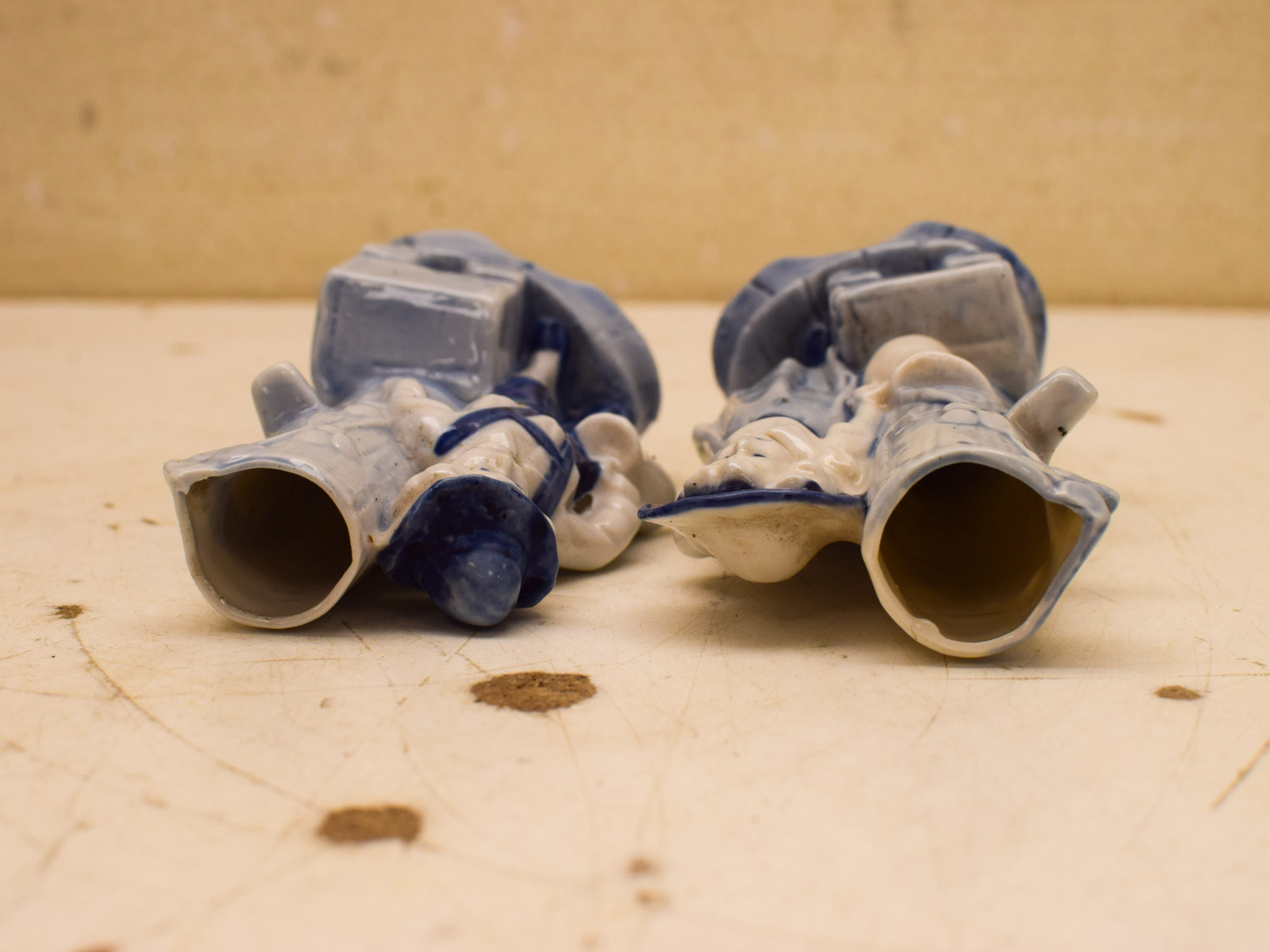 Beide vaasjes zien er nog redelijk uit, al kun je enige slijtage verwachten gezien hun leeftijd. Ze zijn nog heel en bruikbaar als decoratieve stukken of voor kleine bloemarrangementen. De blauwe onderglazuurdecoratuur is duidelijk zichtbaar en goed bewaard gebleven.