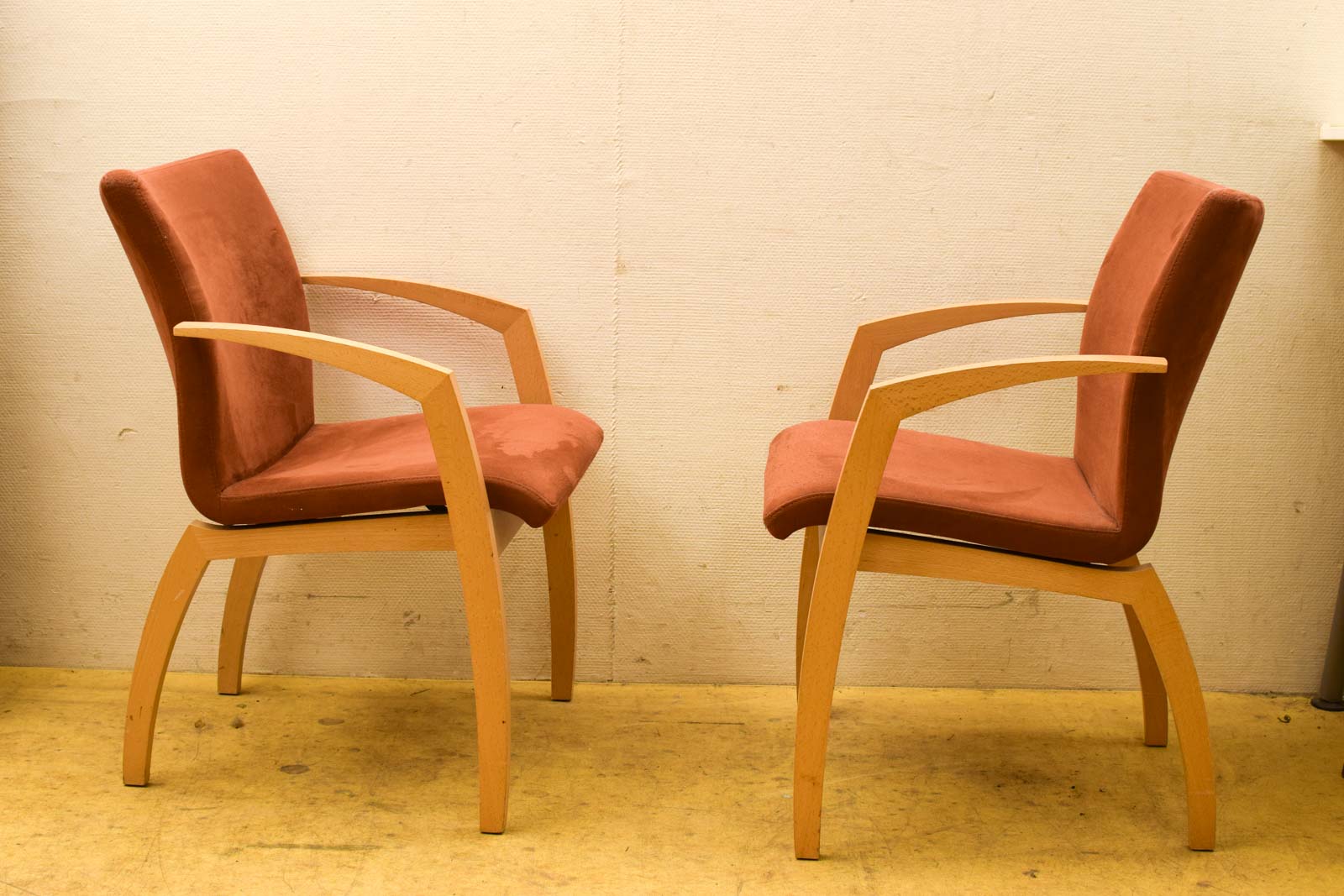 de stoelen zijn gebruikt en hebben gebruikssporen aan het hout bv krassen het stofje heeft vlekjes en slijtage aan het stof maar is nog heel de stoelen zitten nog goed gemeten met leunings breed 57 cm hoog 83,5 cm