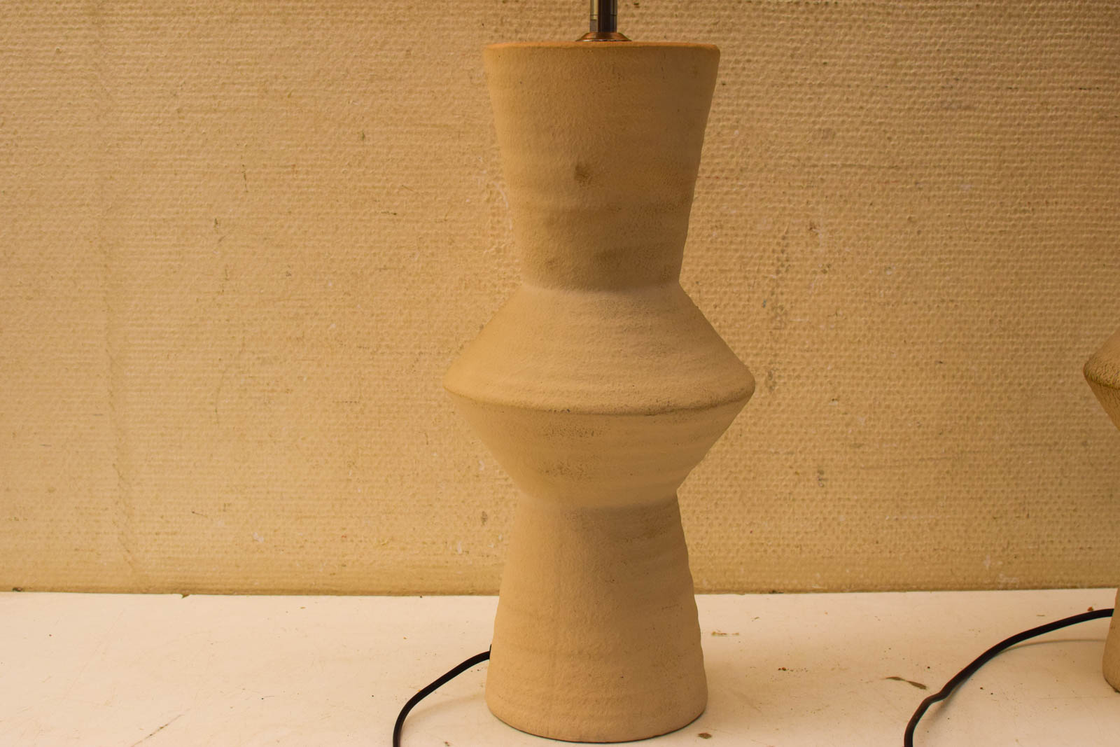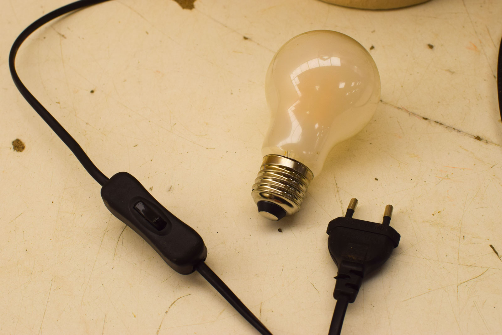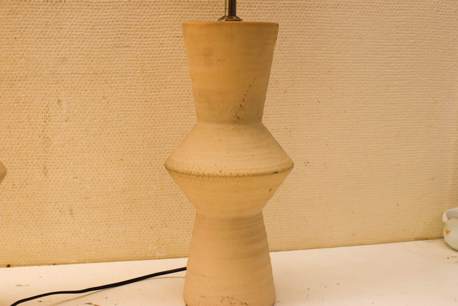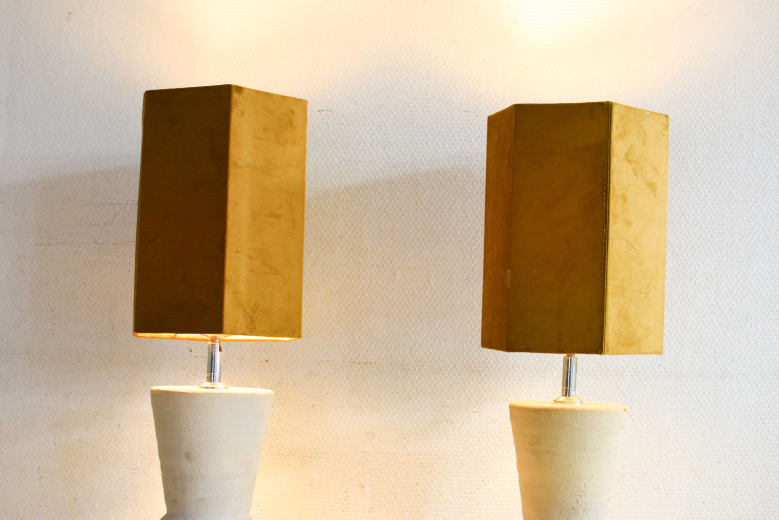 de onderstel is van steen en de kap heeft een suède stof de onderste gedeelte heeft vlekken