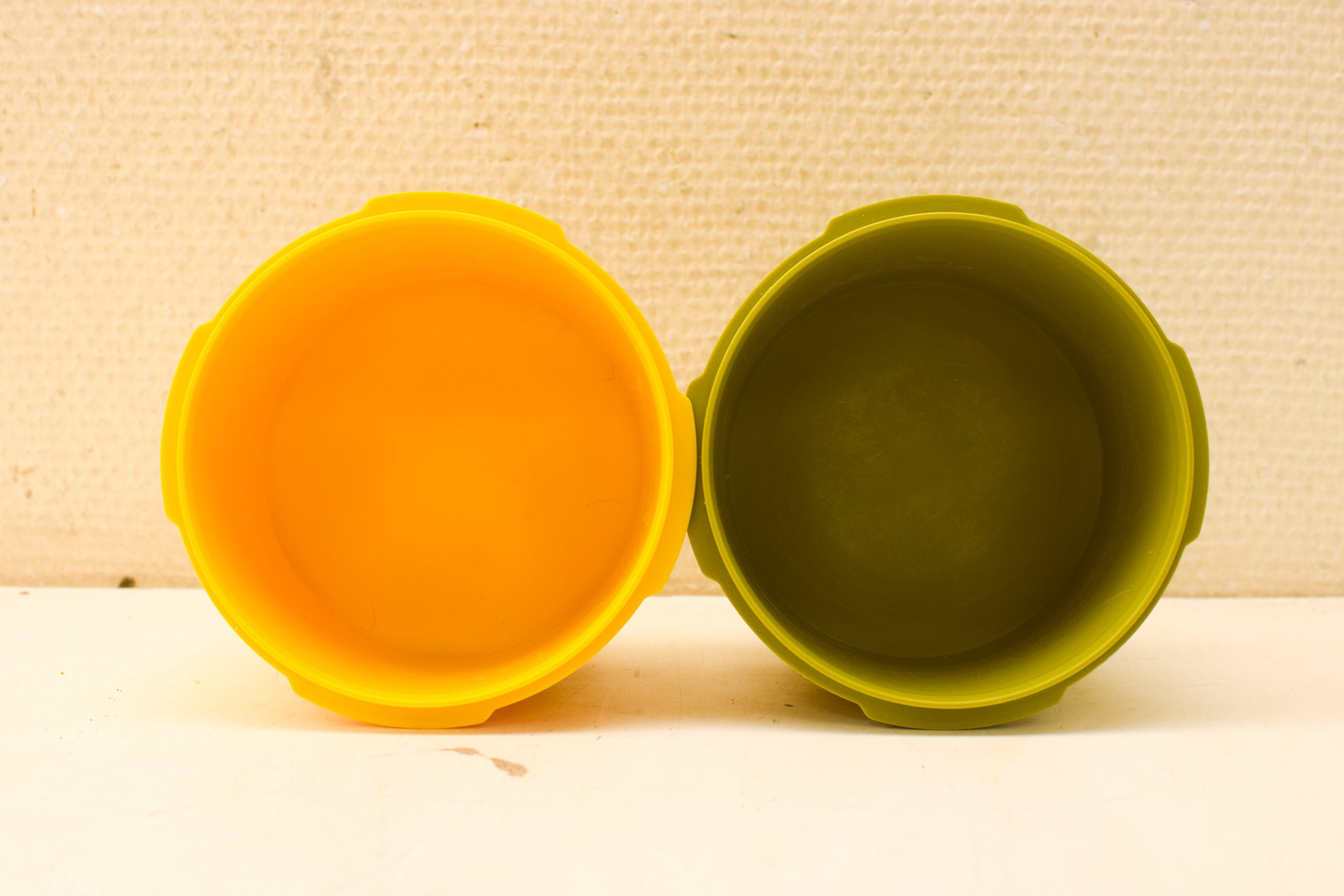 de deksels sluiten niet goed af de gele is er los op de bakjes zijn gebruikt hebben gebruikssporen en krassen diameter bovenkant opening 11,5 cm gemeten zonder deksel hoog 8 cm