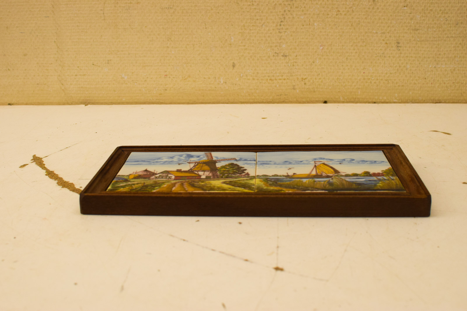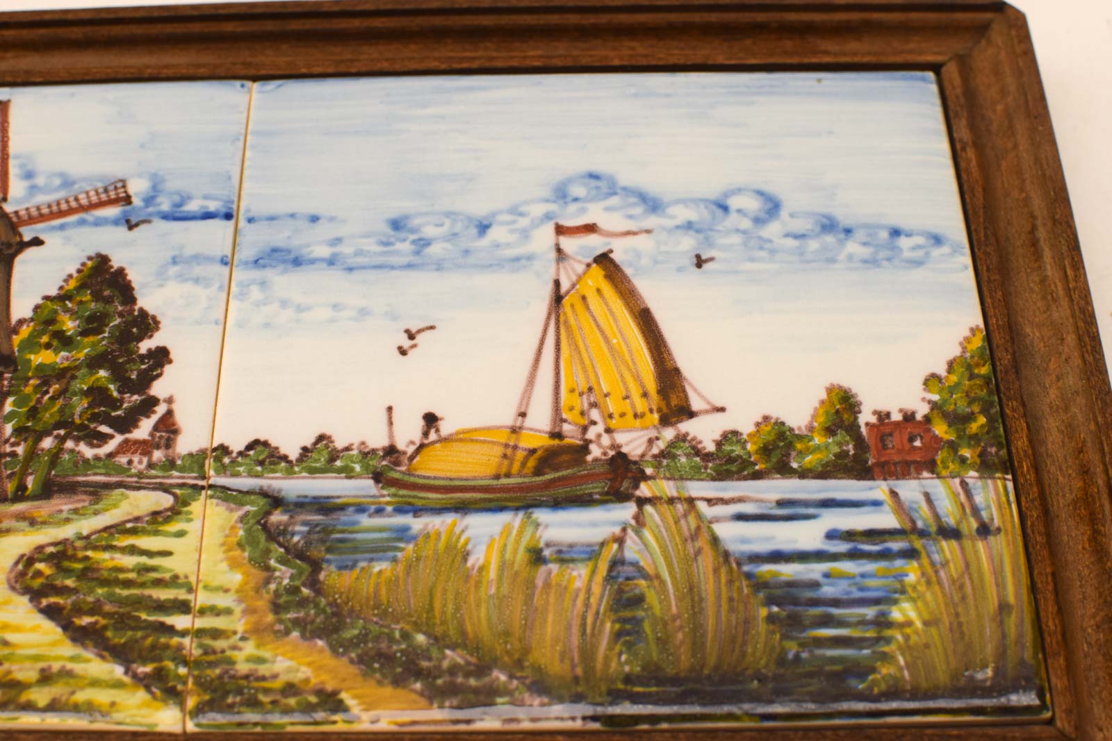 Deze set bestaat uit twee decoratieve wandtegels in een houten lijstje met klassieke Hollandse taferelen. Elk paneel toont een gedetailleerd handgeschilderd decor: aan de linkerkant een traditionele molen omringd door polderland, aan de rechterkant een gele zeilboot op het water met riet en bomen. De tegels zijn uitgevoerd in geglazuurde keramiek met warme geel-, groen- en bruintinten tegen een lucht in licht blauw.