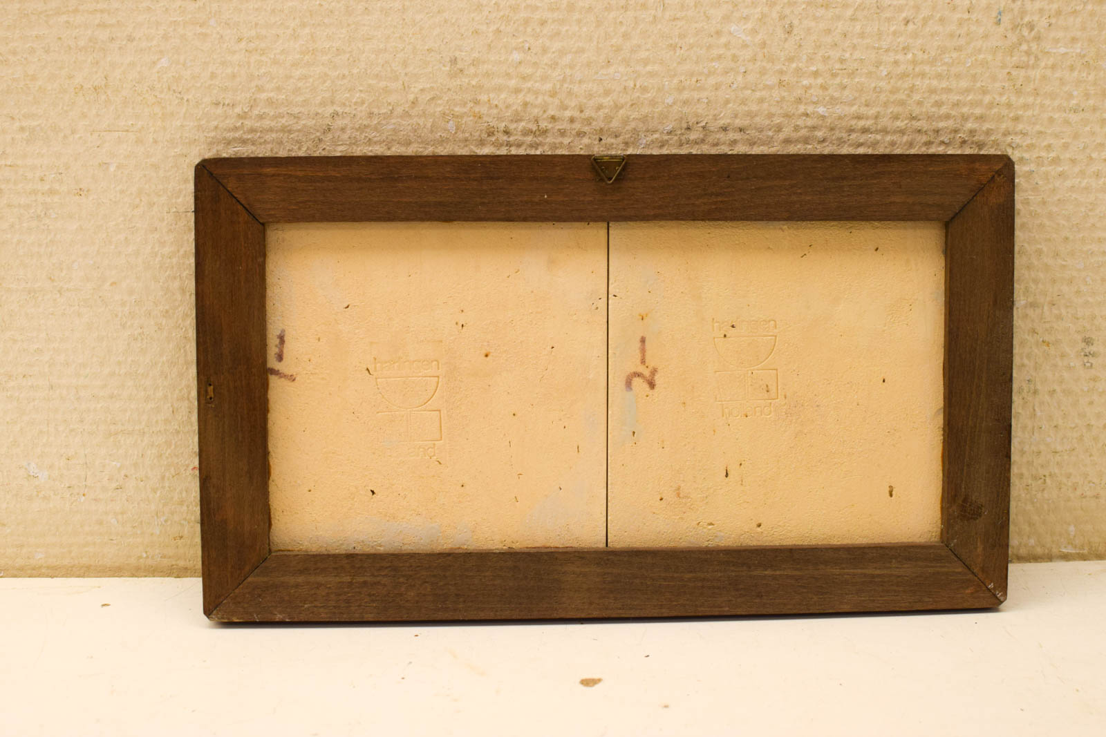 De houten lijstjes zijn gemaakt van donker hout en hebben een eenvoudige, degelijke uitvoering. Ieder paneel bevat twee tegels naast elkaar die samen het tafereel vormen. De afmetingen zijn 30 cm breed en 17 cm diep, wat ze geschikt maakt voor vrijwel elke woonruimte.