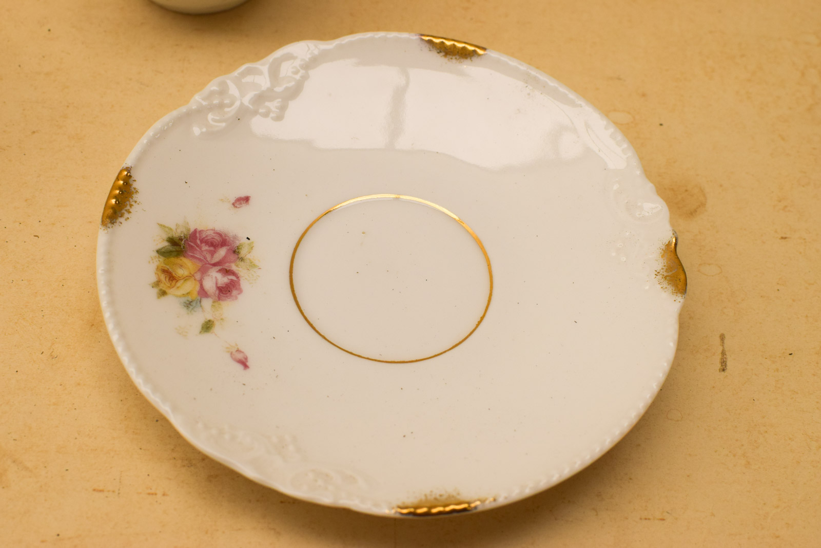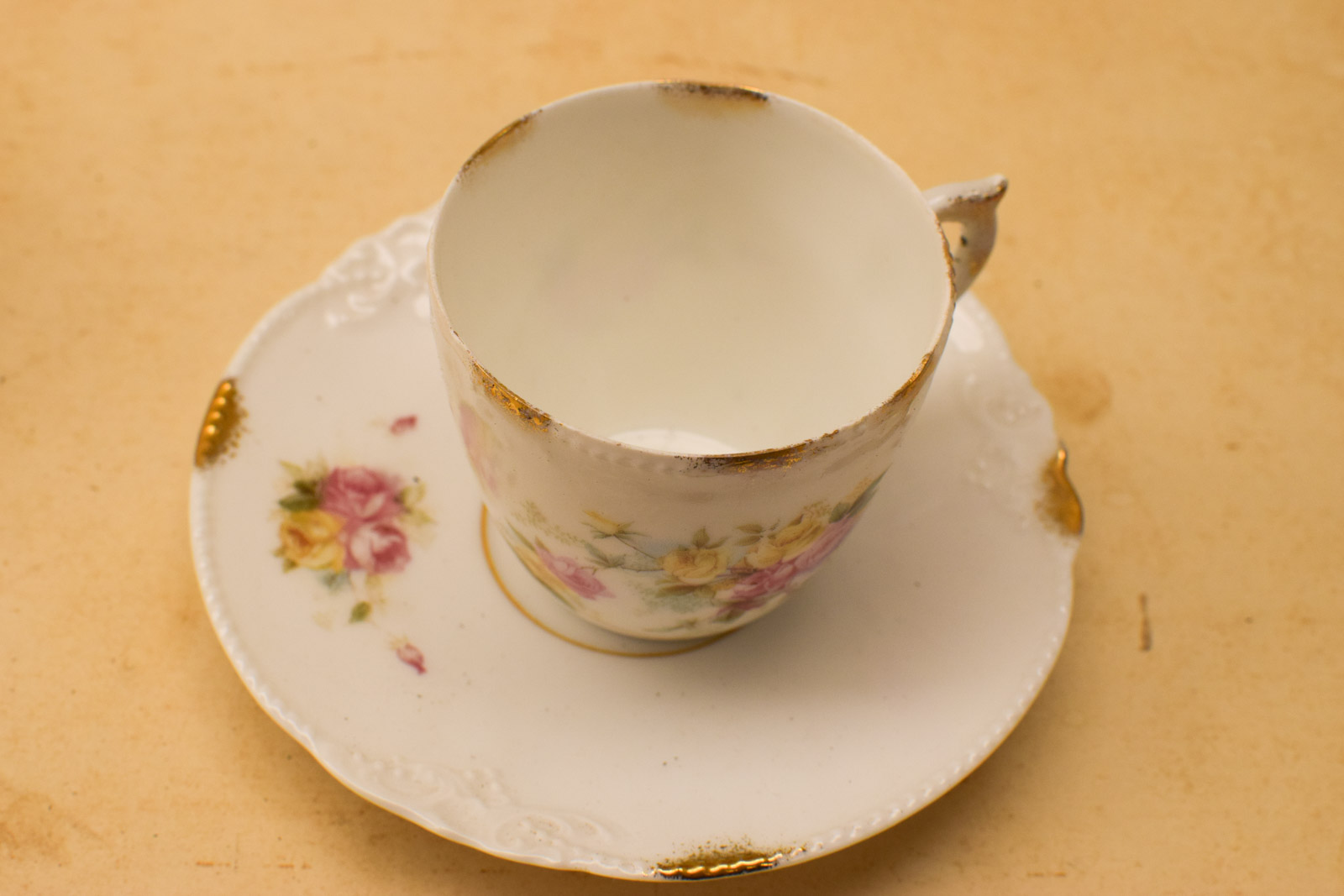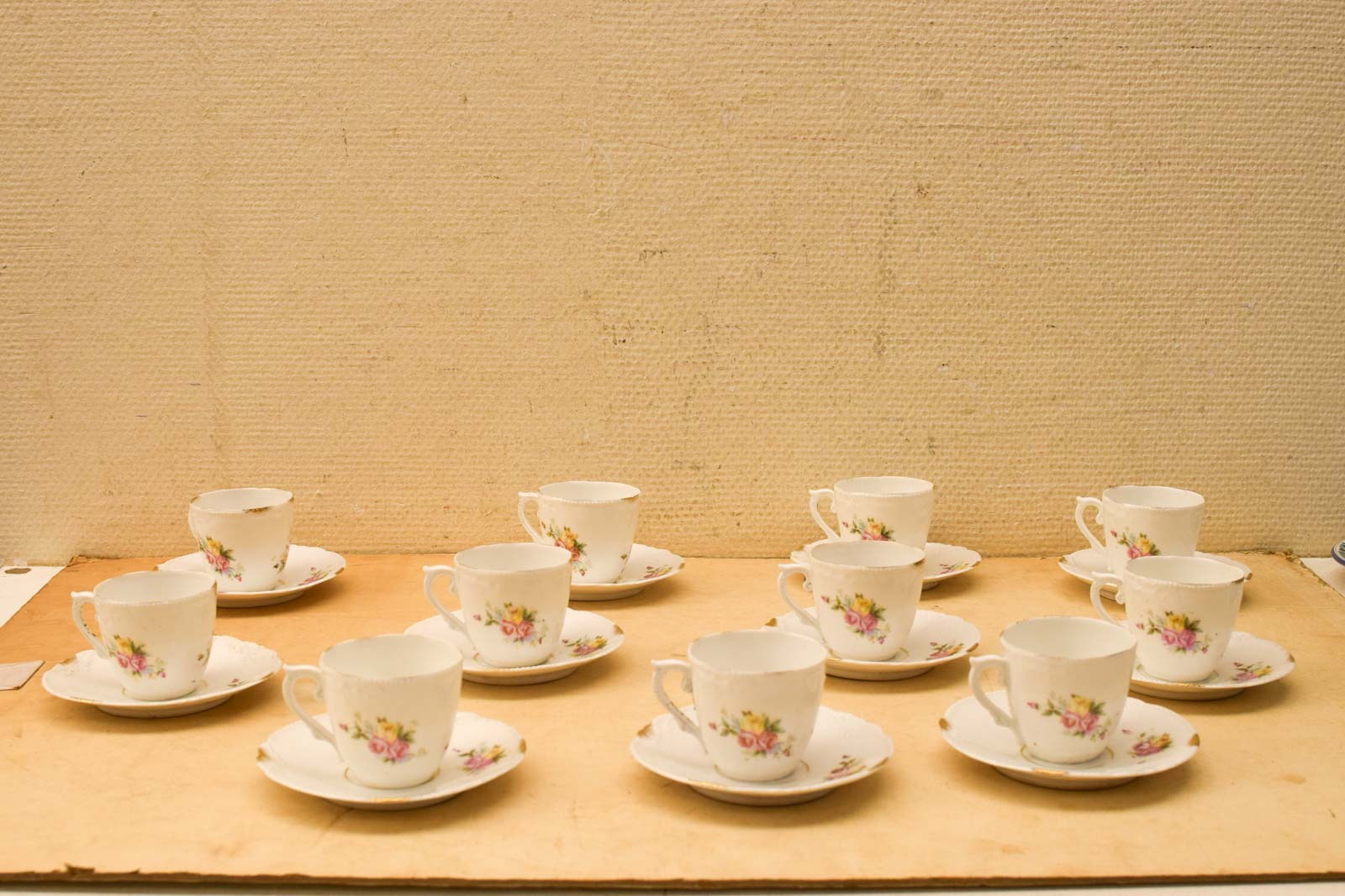 diameter bovenkant van het kopje 7 cm hoog 6 cm diameter van het schaaltje 13 cm heeft lichte slijtage op het geverfde randje