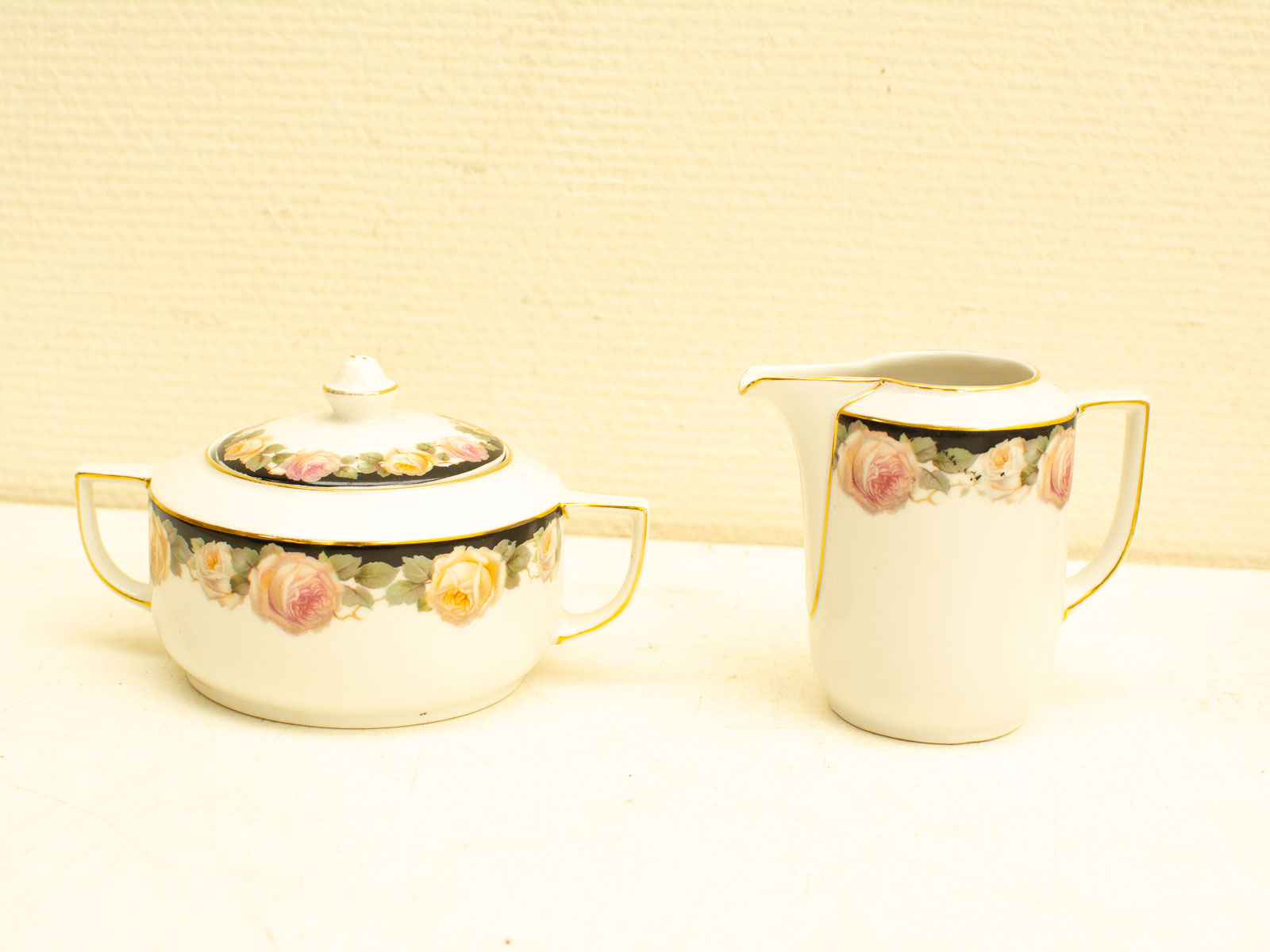 schoteltje diameter 13 cm kopje hoogte 4,5 cm diameter 7 cm melkannetje van oor tot tuit 10,5 cm hoogte 9 cm suikerpotje van oor tot oor 15 cm hoogte zonder deksel 6 cm schaaltje diameter 14 cm hoogte 6,5 cm theepot van oor tot tuit 19 cm hoogte zonder deksel 8 cm het geverfde randje heeft slijtage verder ziet het servies er nog goed uit