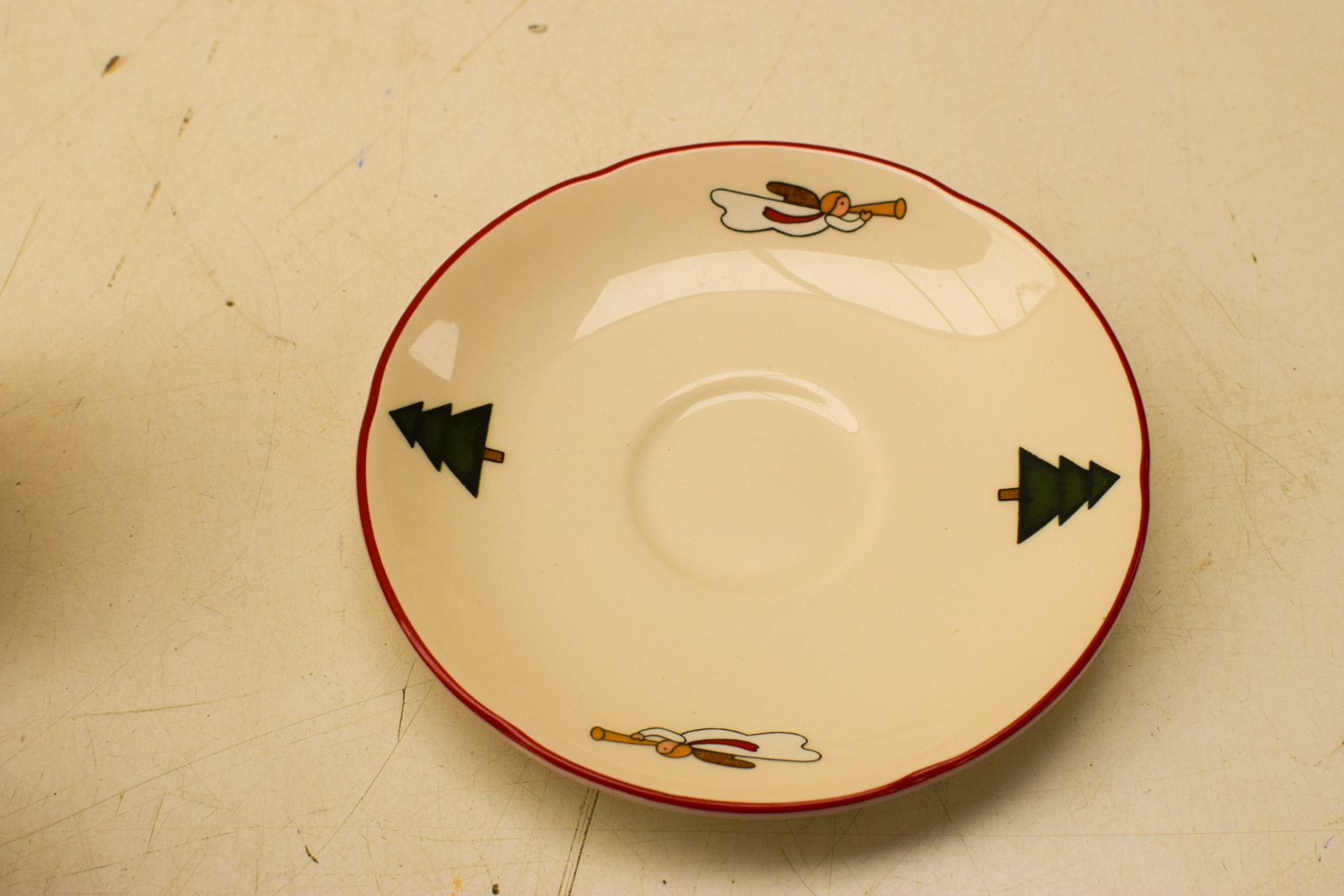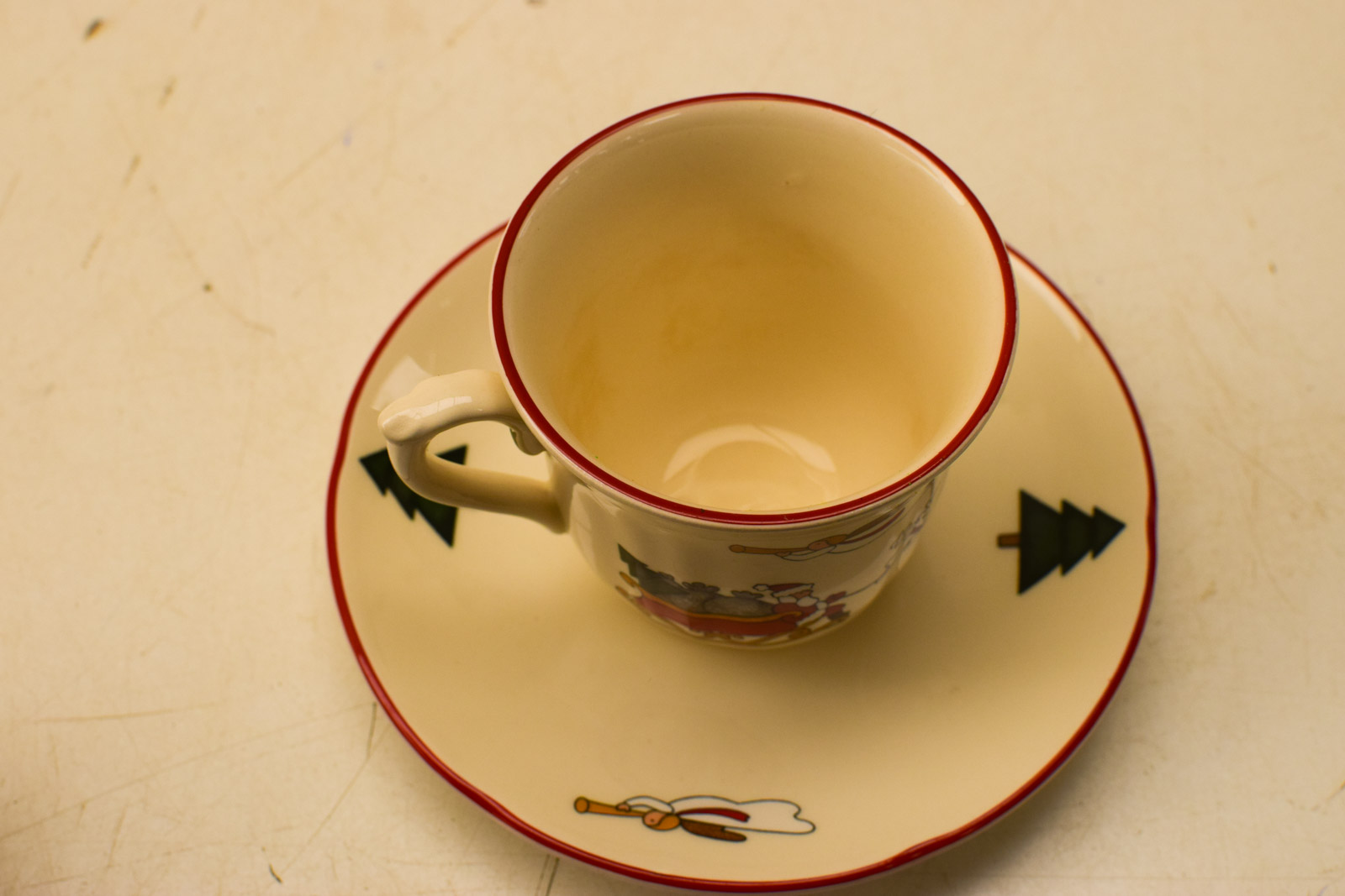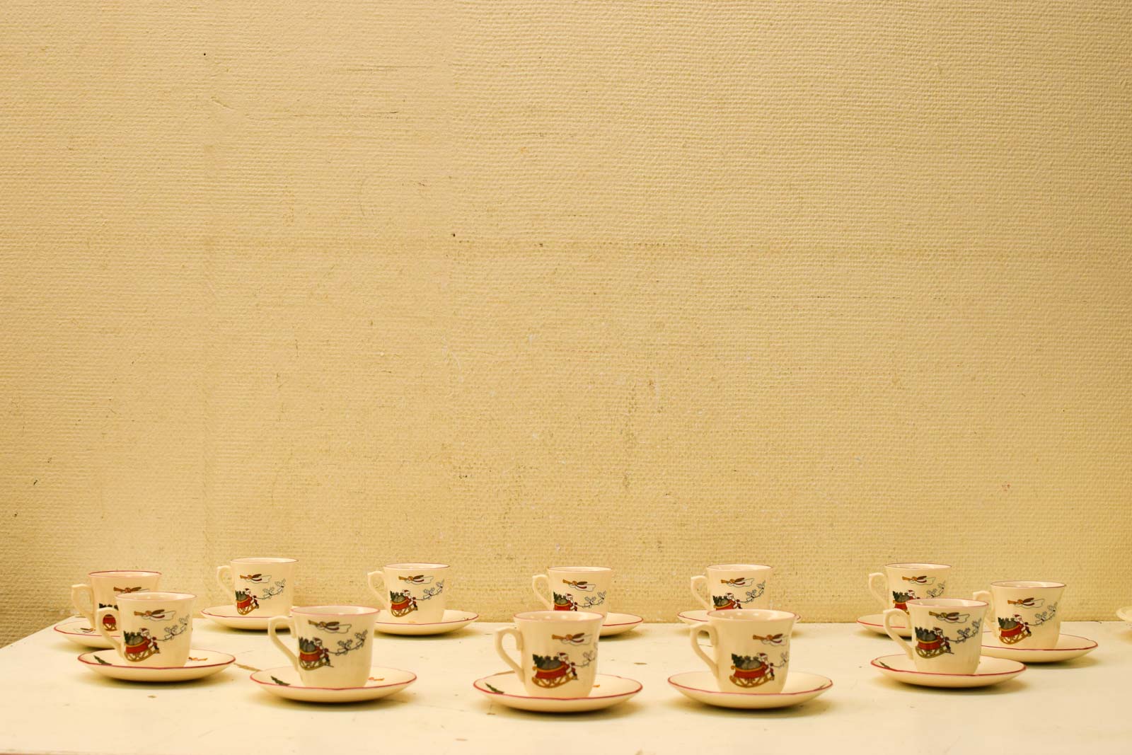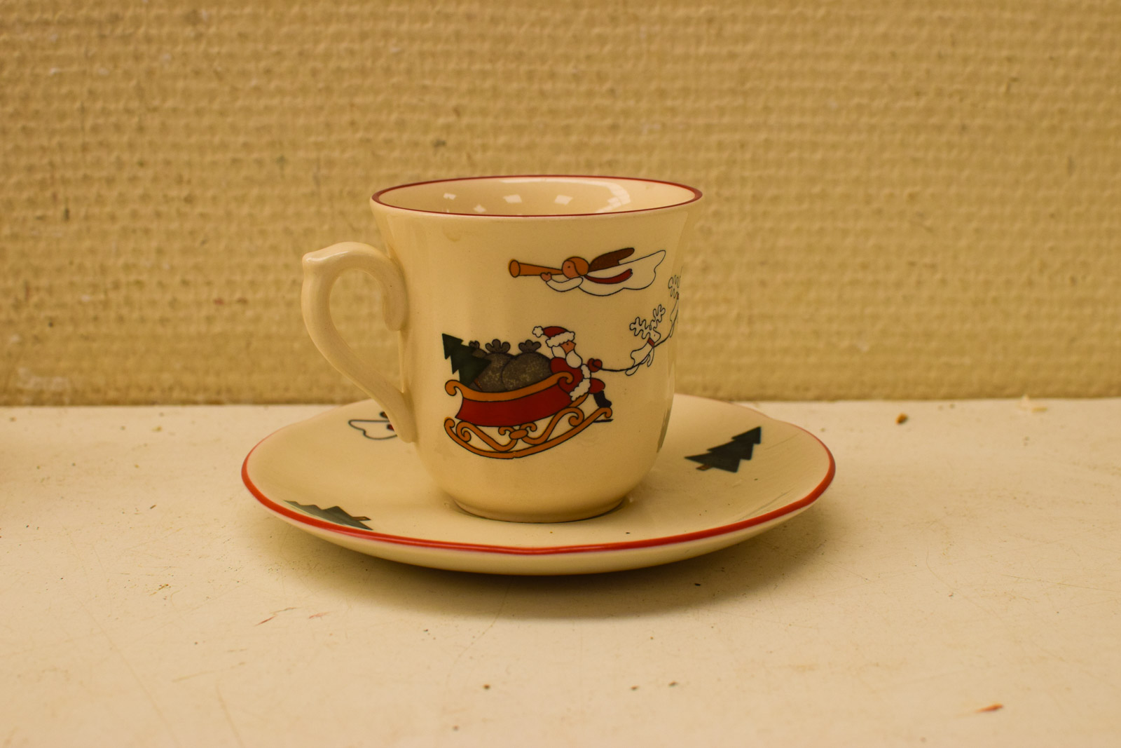 Het servies vertoont gebruikssporen die je mag verwachten bij een vintage artikel van deze ouderdom. De kopjes hebben aanslag aan de binnenkant en het geheel heeft lichte krasjes. Het ziet er ondanks deze sporen nog behoorlijk uit en is prima geschikt voor dagelijks gebruik of voor liefhebbers van vintage kerstdecoratie.