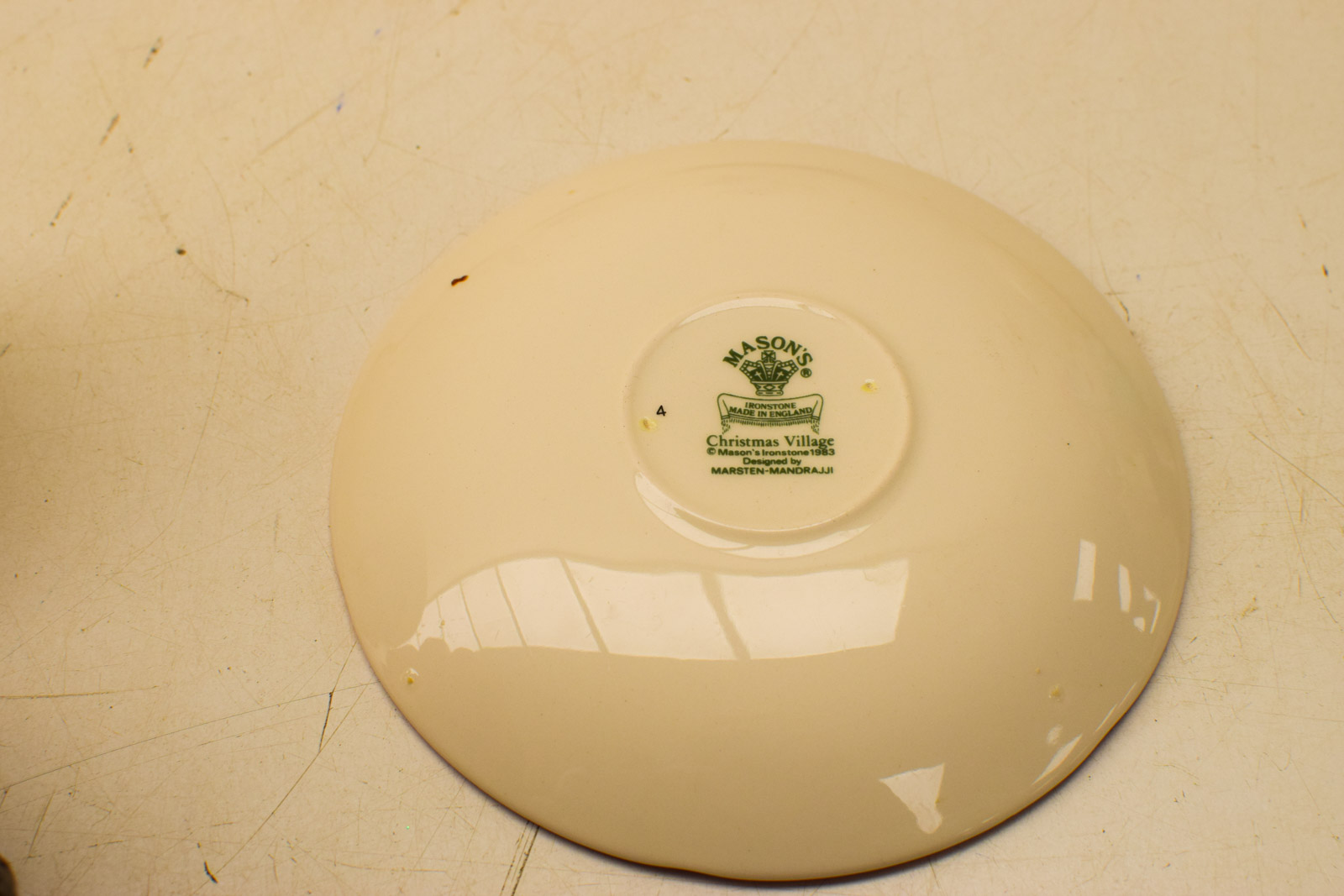 Dit is een 24-delig Mason’s Christmas Village kop en schotel servies, een klassieker voor wie van vintage kerstdecoratie houdt. Het servies is ontworpen door Mason’s Ironstone in 1983 en toont karakteristieke illustraties met kerstthema’s: een kerstman in zijn slee, kerstbomen, een trompettende engel en pijltjes in zwart, rood en geel op een crèmekleurige ondergrond. Elke kop en elk schoteltje heeft een rode rand.