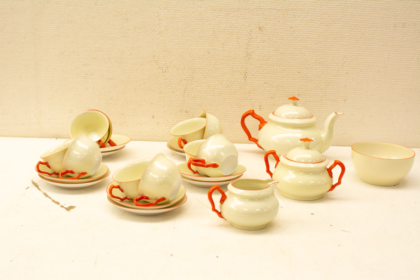diameter bovenkant van het kopje 8,5 cm hoog 4,5 cm diameter van het schoteltje 13,5 cm melkkannetje gemeten van oor tot tuit 11 cm hoog 7 cm suikerpot gemeten van oor tot oor 15 cm hoogte gemeten zonder deksel 7 cm diameter van de bovenkant opening van het schaaltje 12,5 cm hoog 6 cm de theepot van oor tot tuit 22 cm hoogte gemeten zonder deksel 9 cm het servies is beige en oranje
