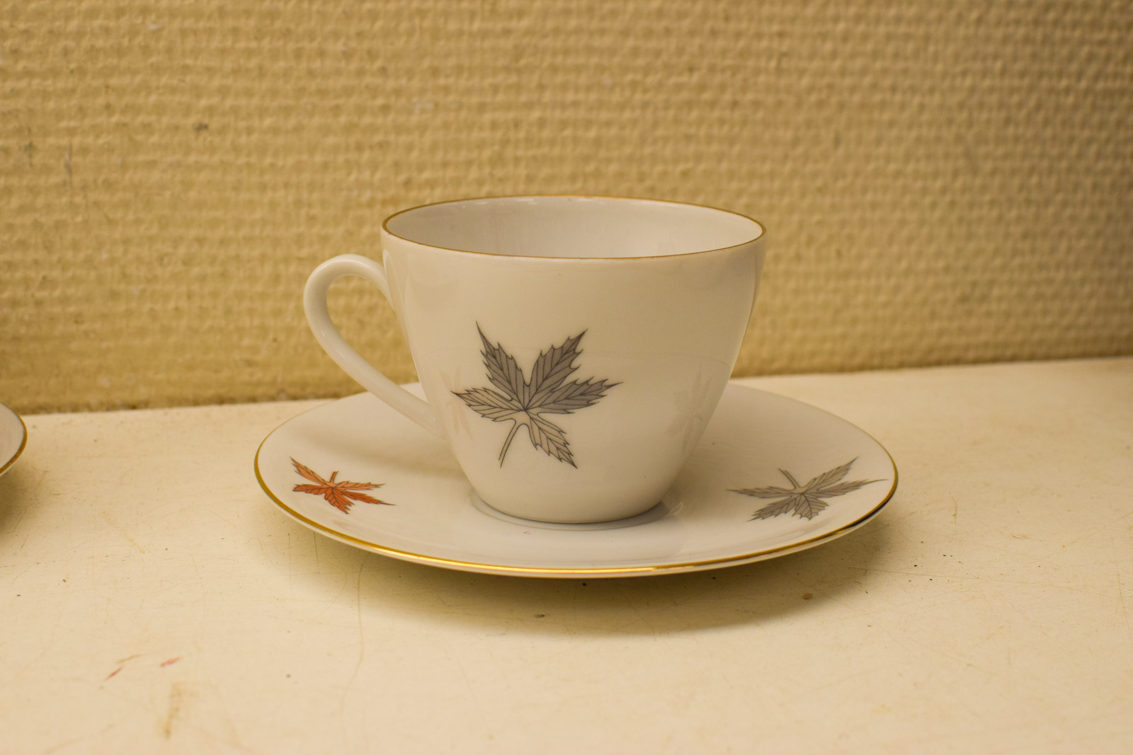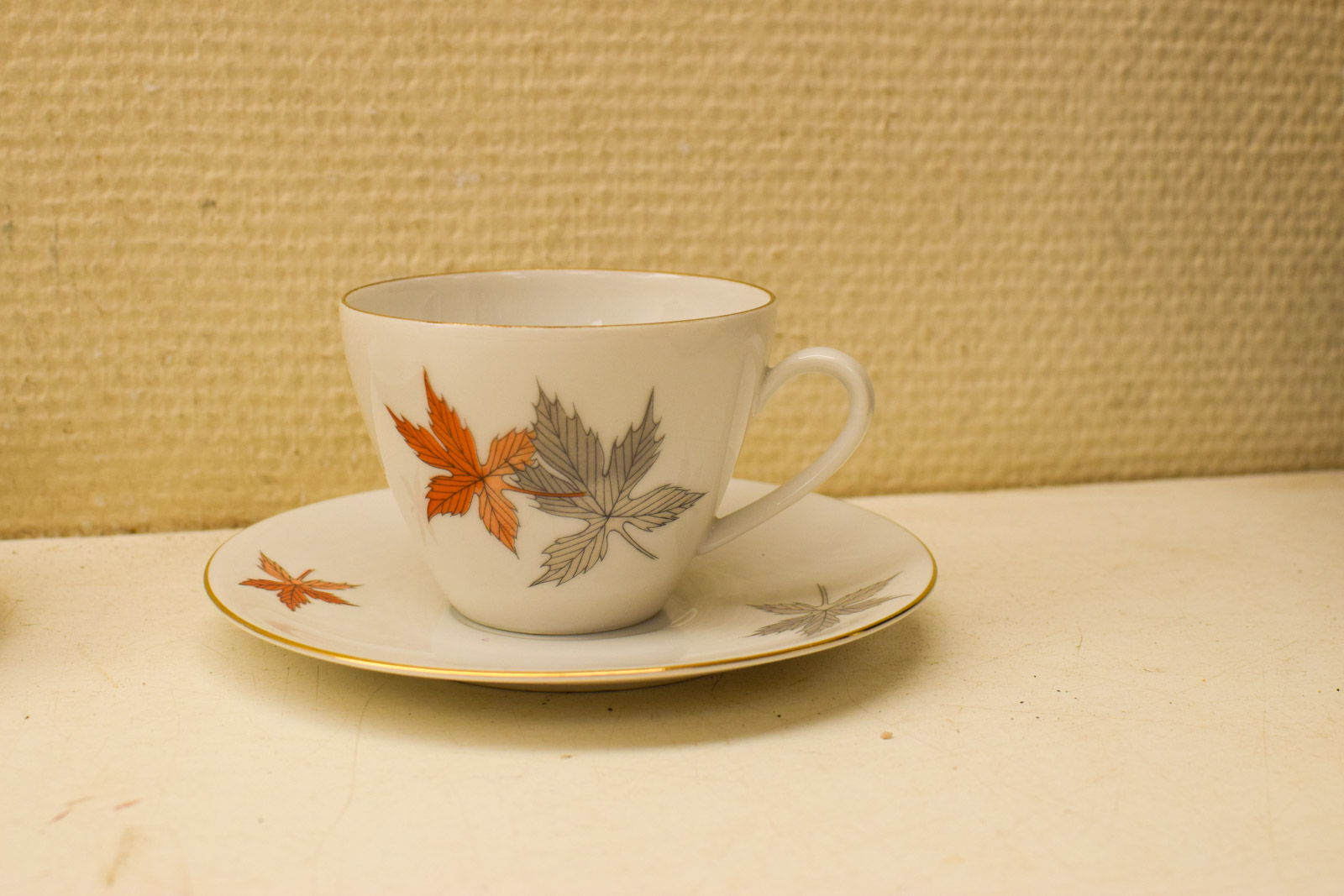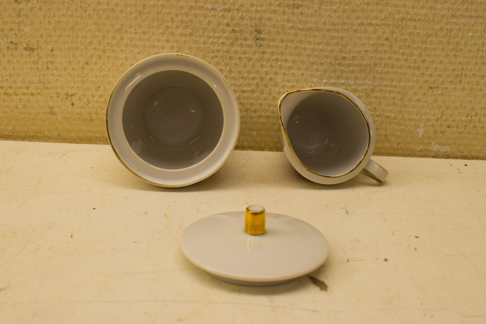 het kopje gemeten diameter bovenkant opening 8 cm hoog 6 cm diameter van het schaaltje 14 cm suikerpot gemeten diameter bovenkant 8,5 cm gemeten zonder deksel hoog 7 cm melkkannetje gemeten van oor met tuit 9,5 cm hoog 6,5 cm de theepot gemeten van tuit met oor 20 cm hoog 13 cm de theepot mist een stukje op de rand zie foto het servies heeft slijtage op het goudkleurig geverfde randje