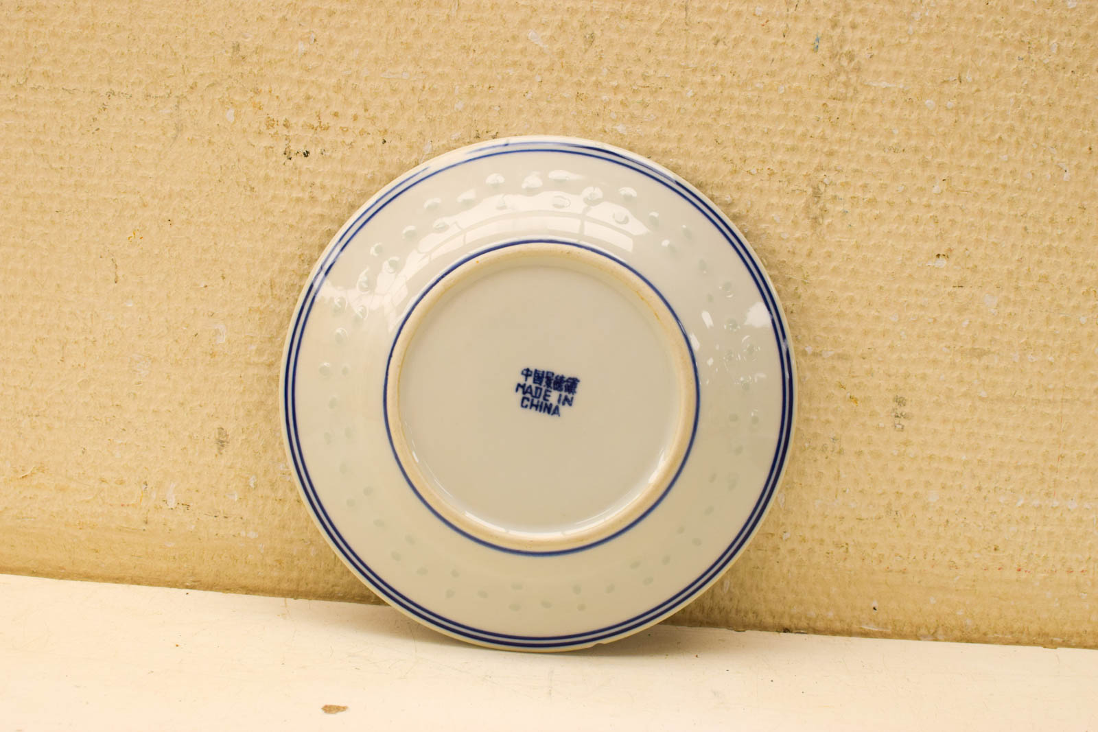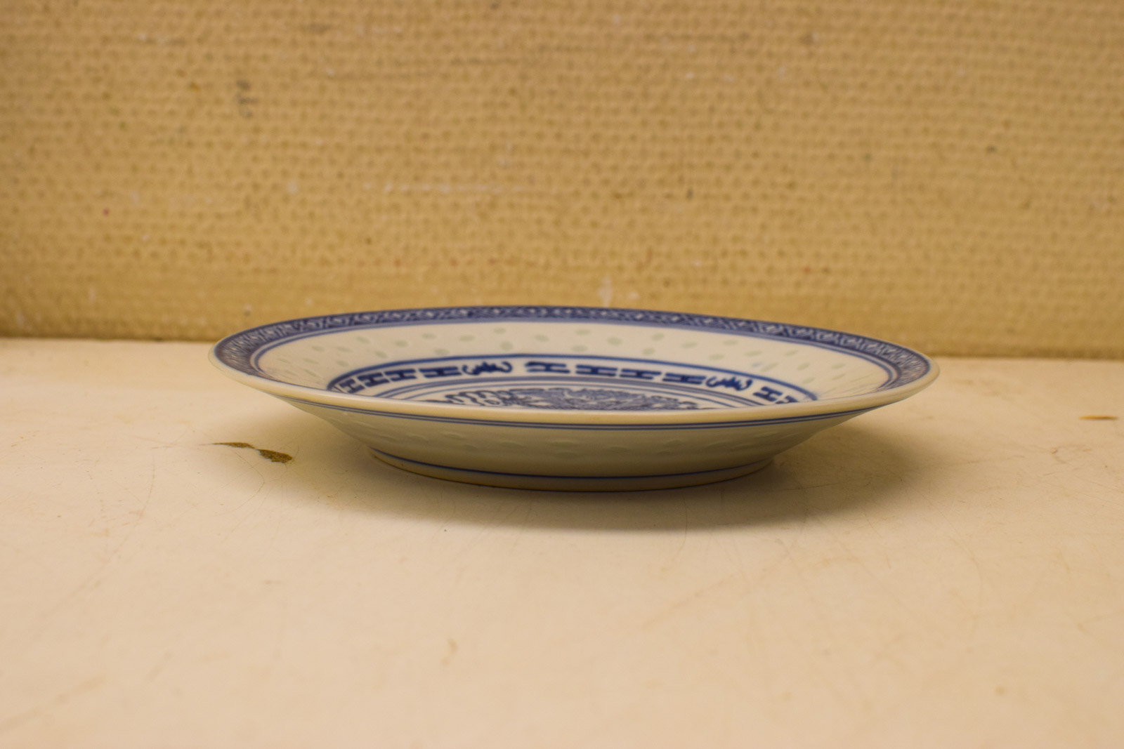 Deze set van 3 porseleinen borden heeft een klassieke blauw-witte draakafbeelding in het midden. Het zijn originele Chinese borden, zoals aangegeven op de onderzijde. De draak is een traditioneel motief in de Aziatische keramiek en staat symbool voor kracht en geluk. Deze borden passen perfect in een vintage of Aziatisch geïnspireerde inrichting.