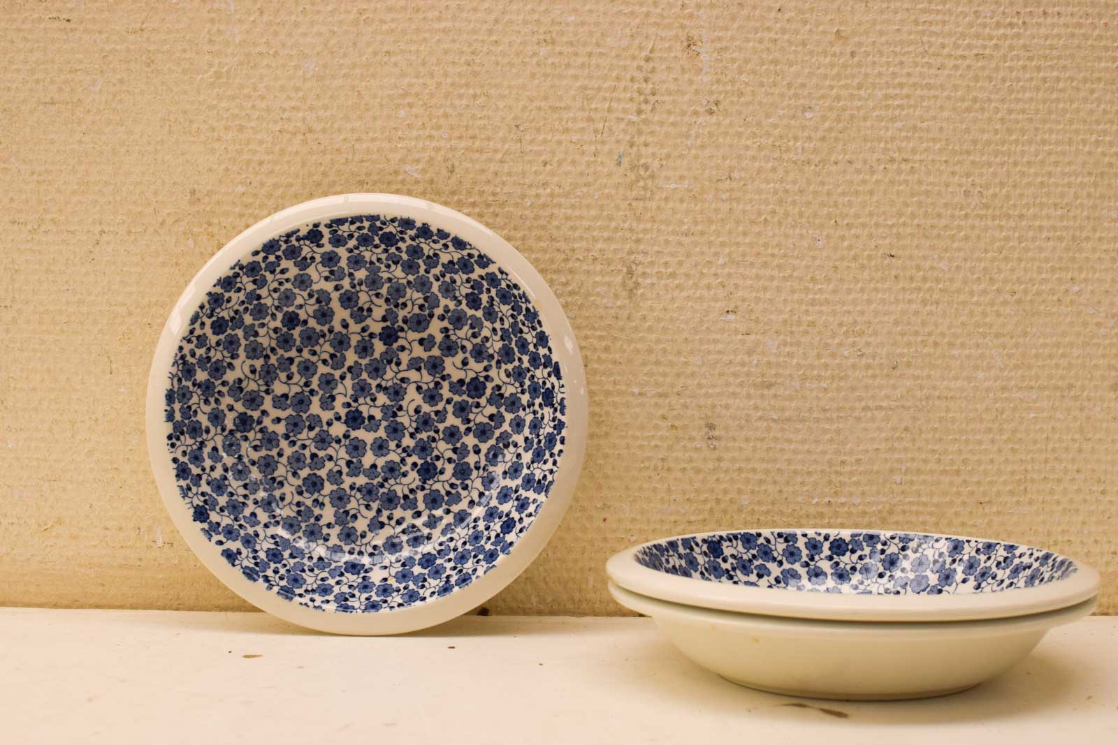 Dit zijn 3 diepe borden van Wedgwood, het befaamde Engelse porseleinfabrikant dat sinds 1759 bekend staat om zijn verfijnde keramiek. De borden hebben aan de binnenkant een sierlijk bloemetjespatroon in delft blauw op wit porselein, een design dat teruggaat op de traditionele Hollandse blauwe delftware. Het patroon bestaat uit klein geschilderde bloempjes en ranken die volledig over het binnenoppervlak verdeeld zijn.
