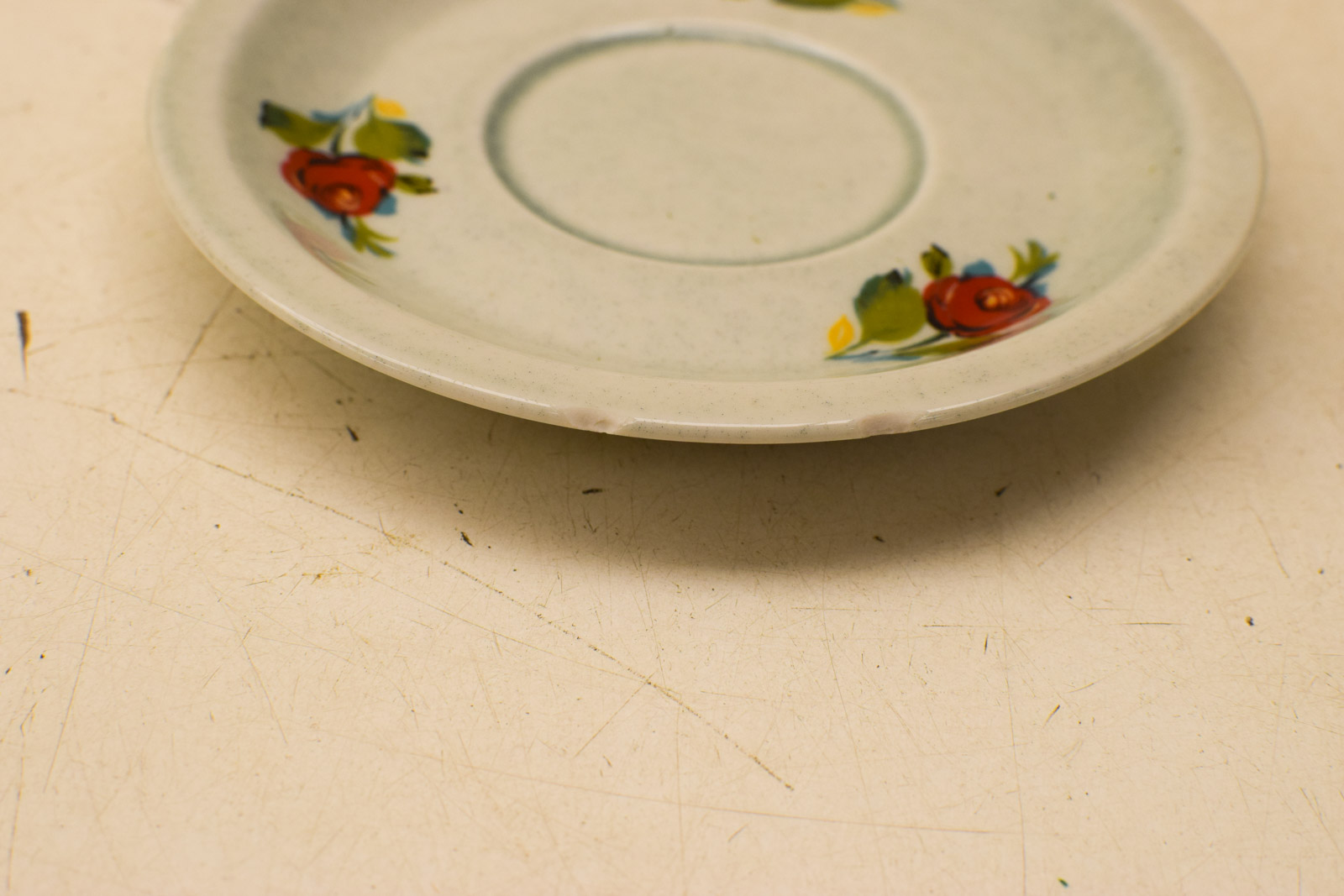1 schaaltje mist 2 stuks zie foto verder ziet het servies er nog redelijk uit diameter bovenkant van het kopje 6,5 cm hoog 7 cm diameter van het schoteltje 13,5 cm