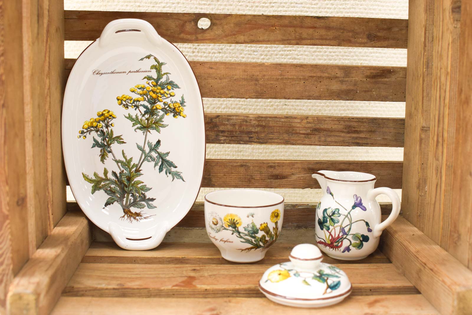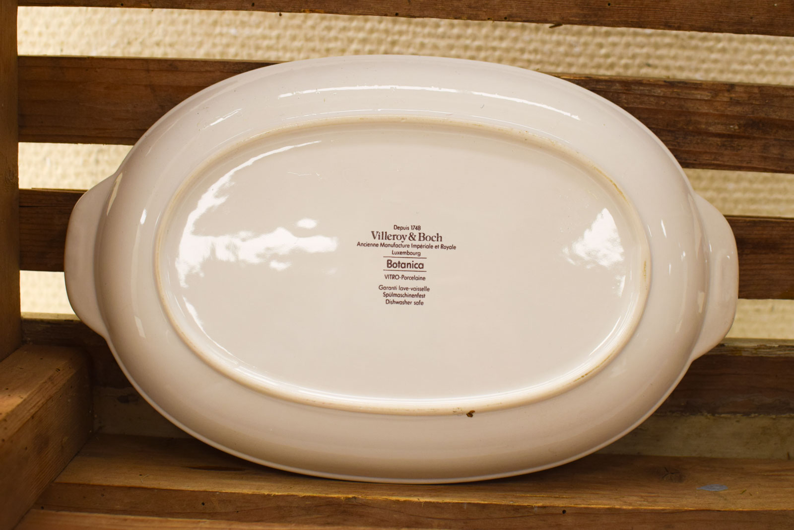 Compleet 4-delig Villeroy & Boch porseleinen servies met suikerschaaltje, melkkannetje en grote serveerschaal. Botanica-decor met gele en paarse bloemen. Geschikt voor koffie- en theeservies.