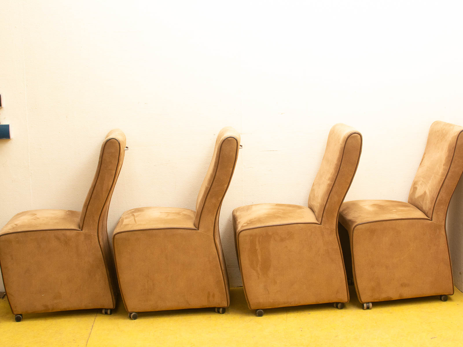 zitten 4 wieltjes onder de stoelen een handvat aan de achterkant om de stoel te verplaatsen de stoelen hebben slijtage bovenin in de hoeken zie fotos