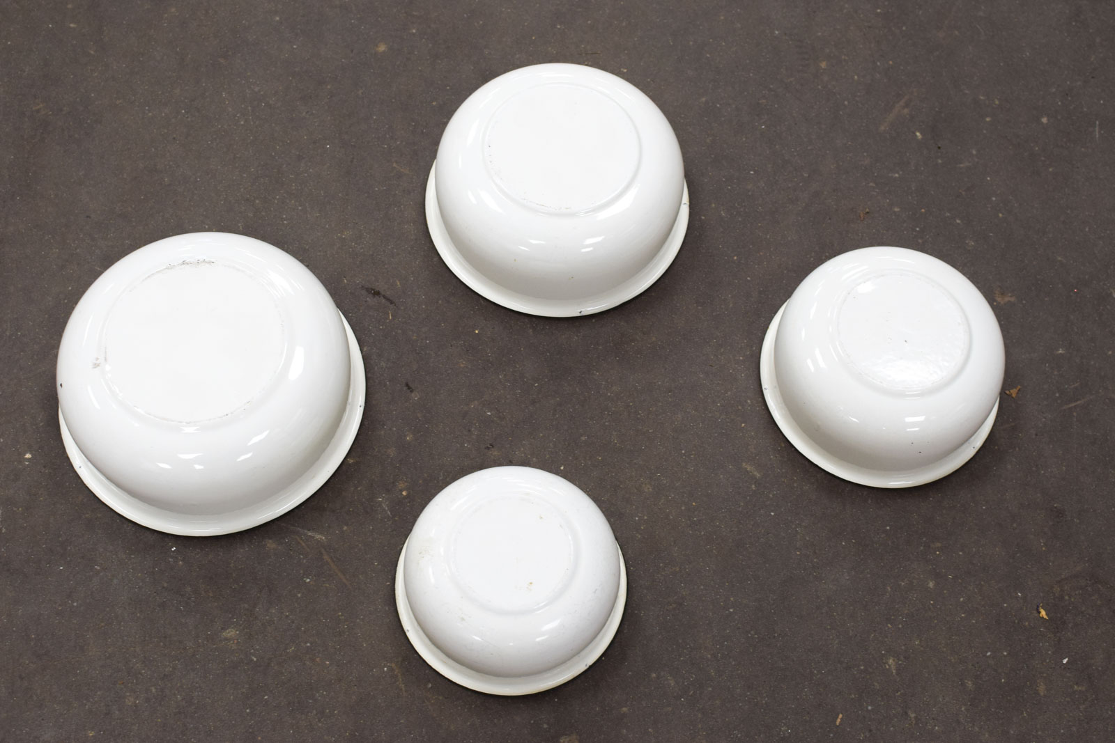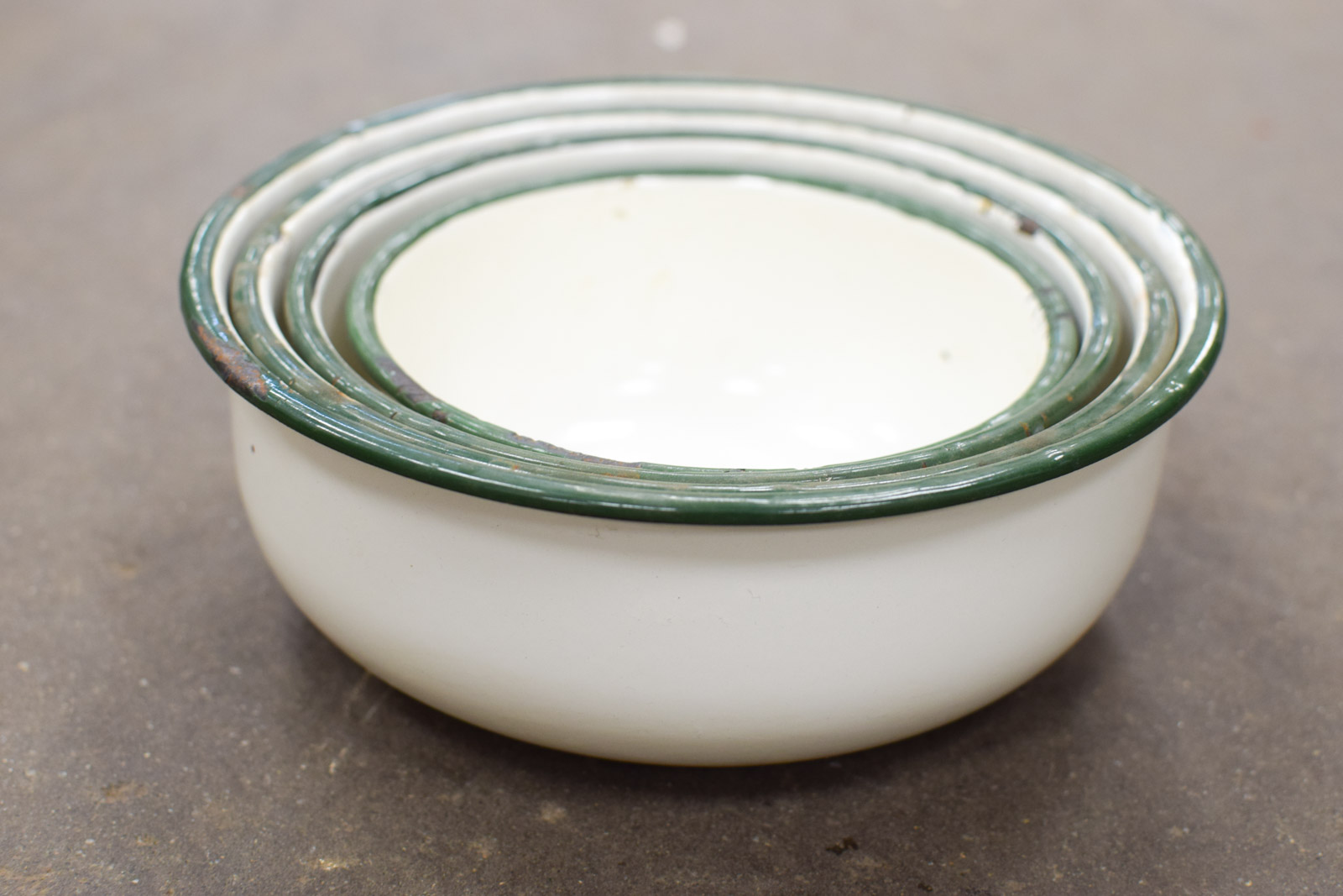 de schalenset heeft een groene rand de schalen hebben roestplekjes vlekjes en krassen de kleinste schaal gemeten diameter bovenkant opening 15,5 cm hoog 6,5 cm de grootste gemeten diameter bovenkant opening 21,5 cm hoog 8 cm