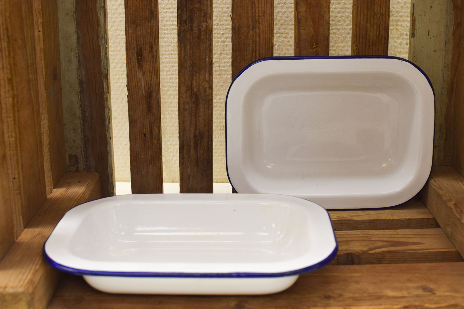 ze zijn alle 4 gebruikt en hebben krassen door het gebruik de rand is donkerblauw de kleinste schaal gemeten breed 20 cm diep 15 cm hoog 4 cm de grootste schaal gemeten breed 26 cm diepte 19 cm hoog 4,5 cm
