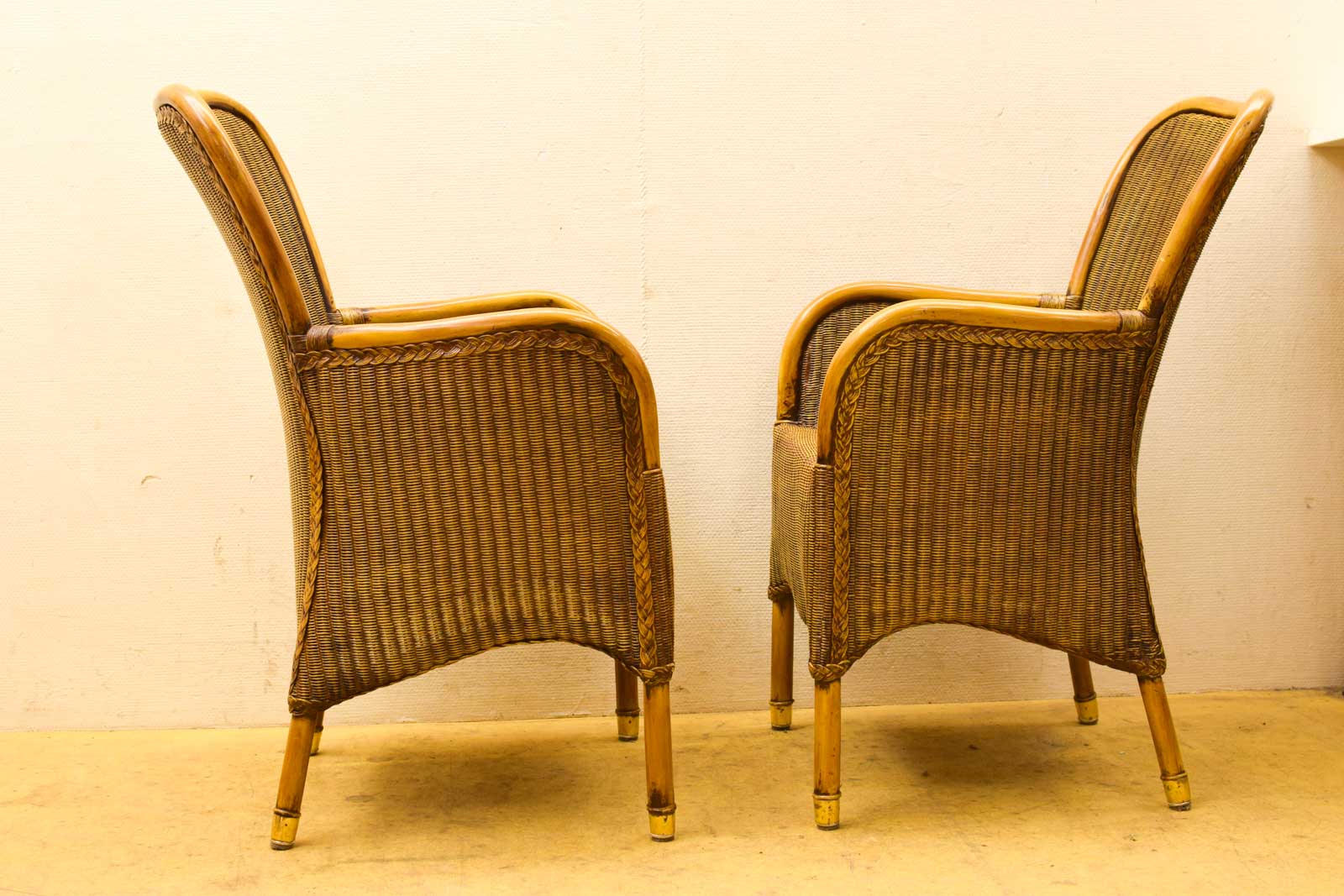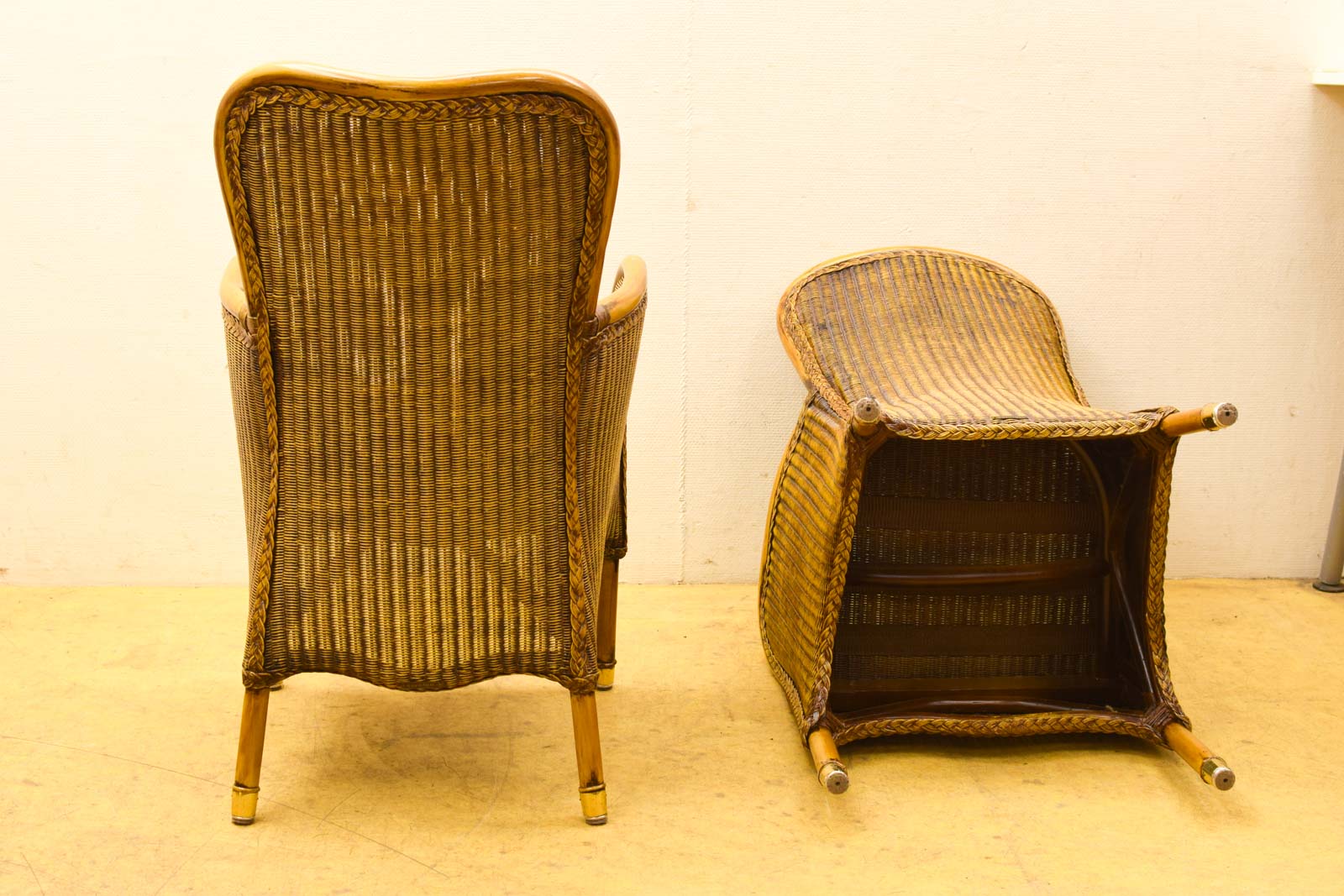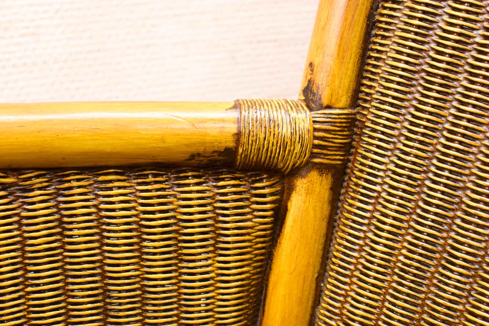 De stoelen zijn all vier gebruikt en vertonen normale gebruikssporen. De rotan is op sommige plekken wat afgesletenen er zichtbare sporen van jarenlang gebruik, maar ze zitten nog steeds goed en zijn stabiel. De houten delen laten patina zien, wat kenmerkend is voor vintage meubels. Er zit geen kussentje bij.