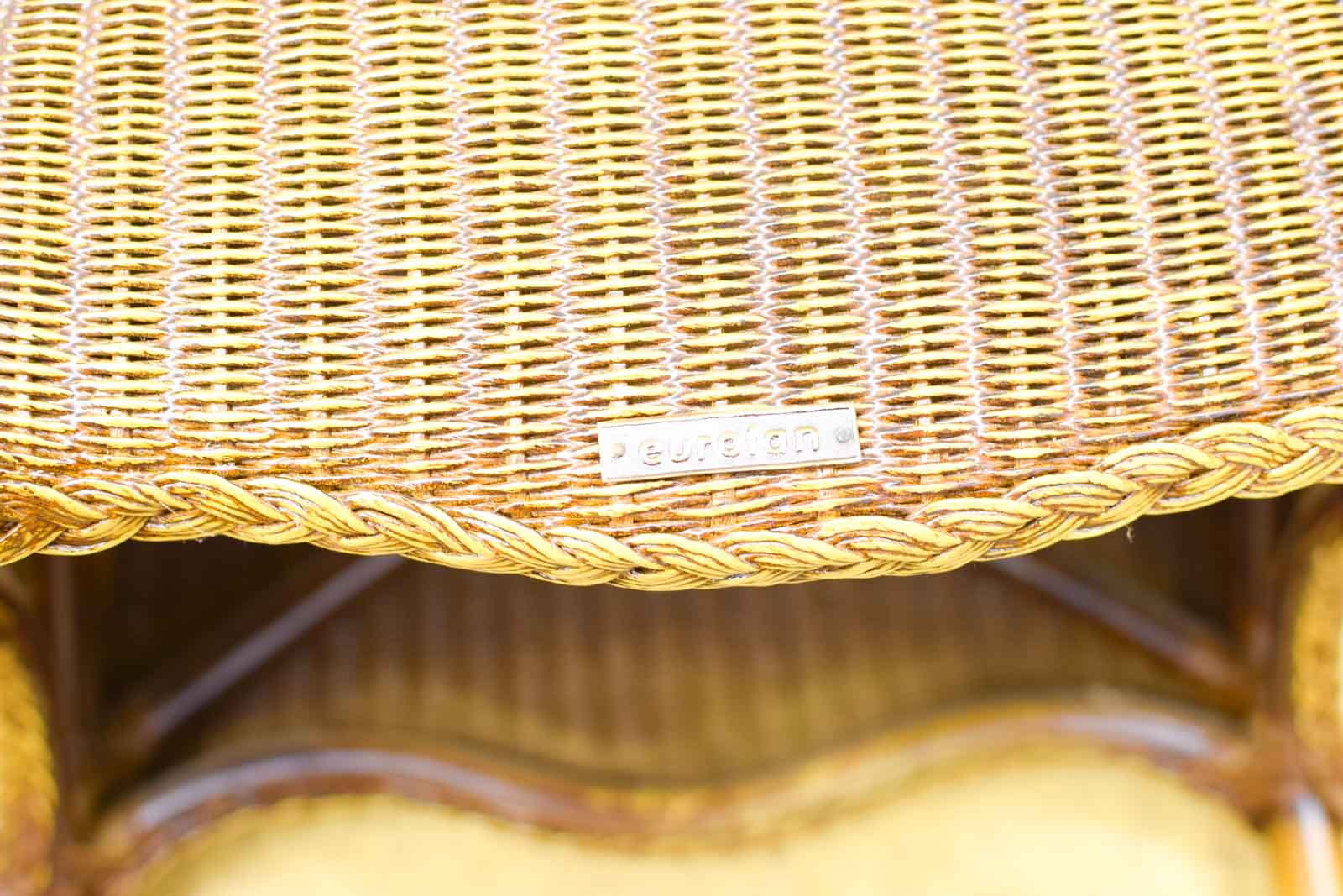 Dit zijn 4 Eurotan rotan stoelen, een klassieke combinatie van natuurlijke rotan en houten frame in geel-goudtint. De stoelen hebben een solide constructie met gebogen armleuningen en een ergonomische rugleuning. Ze zijn ontworpen voor duurzaamheid en comfort, wat ze populair maakt voor eetkamer, woonkamer of veranda.