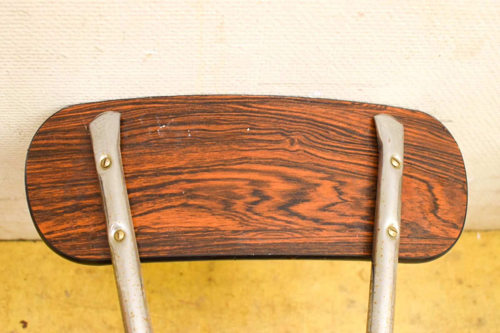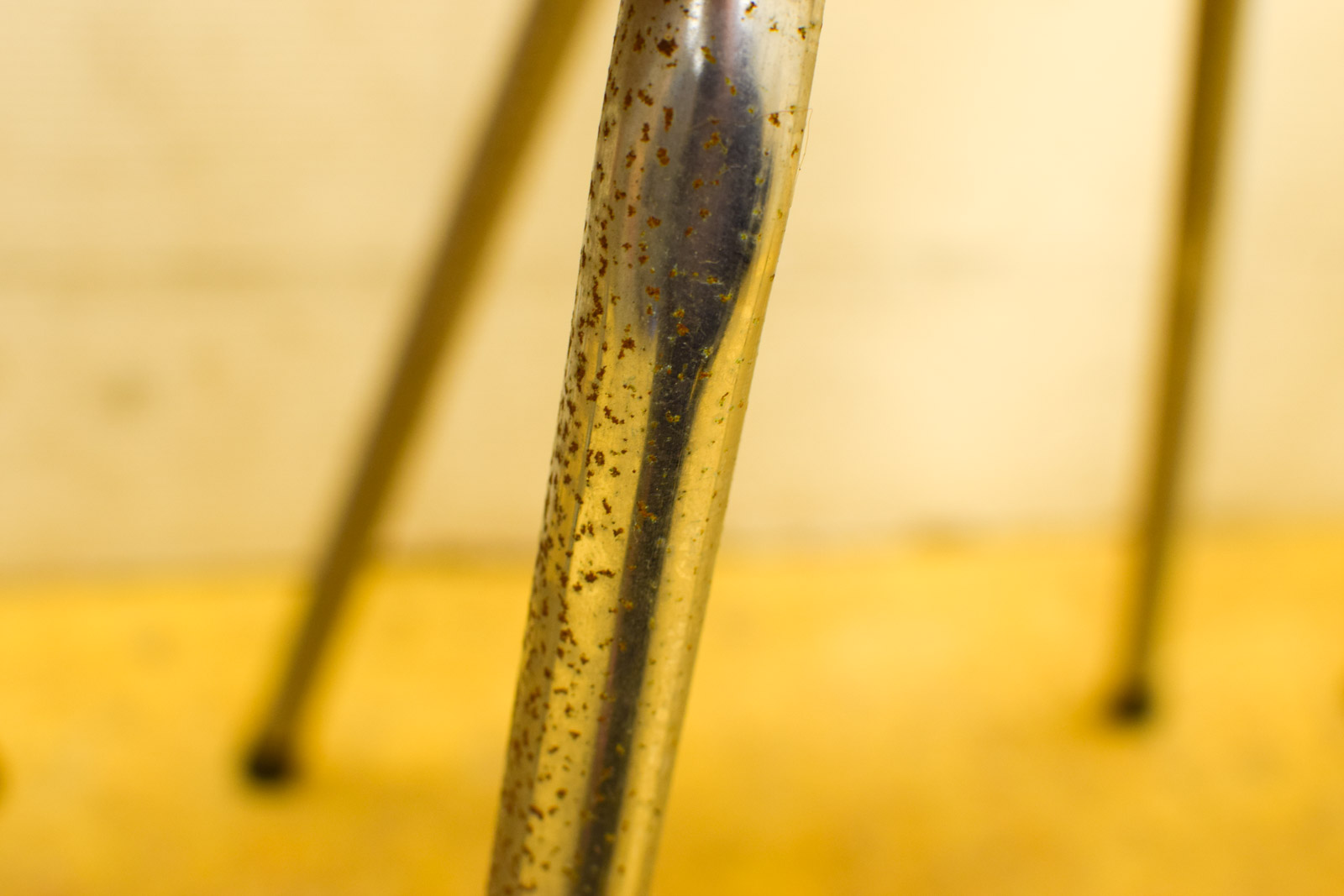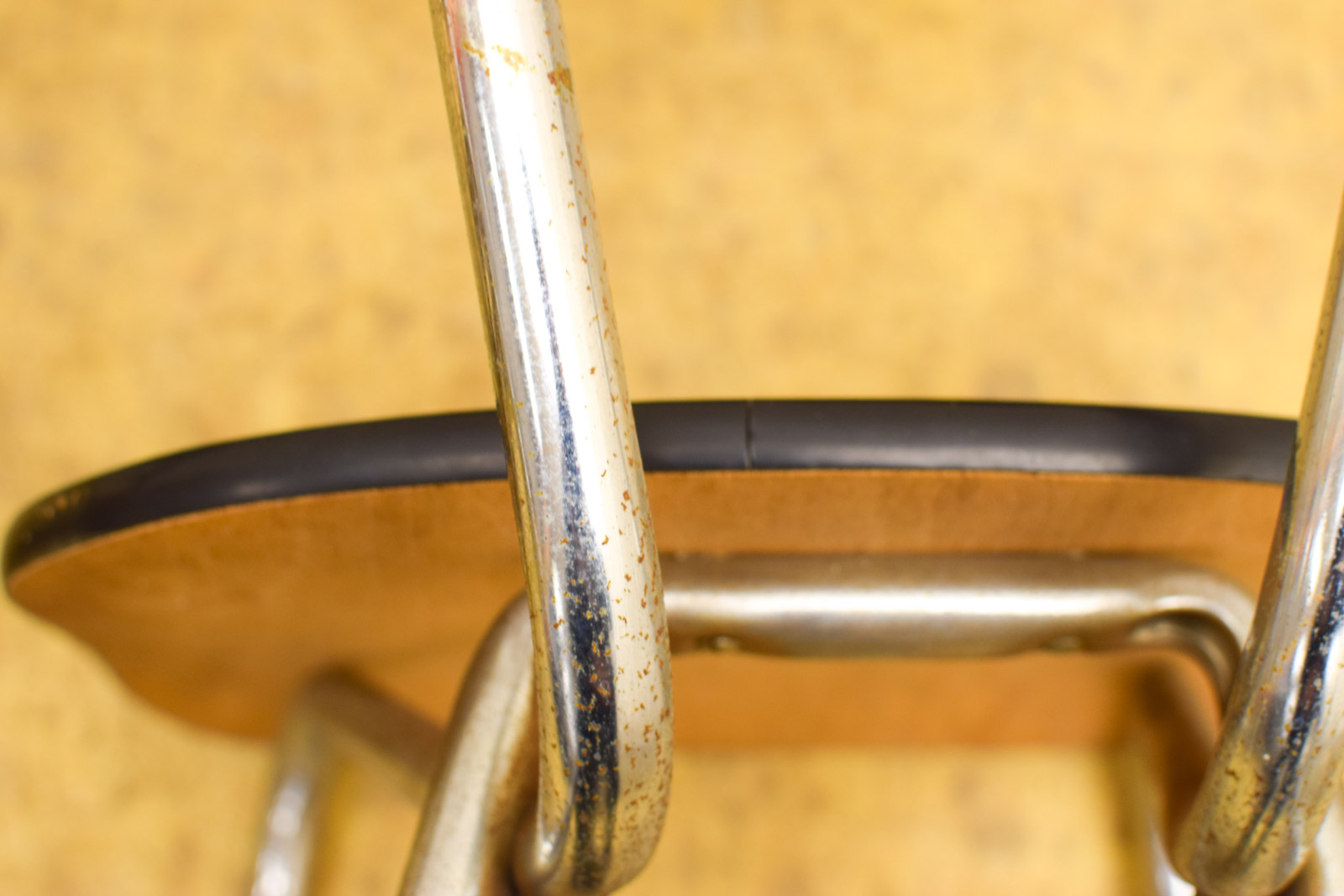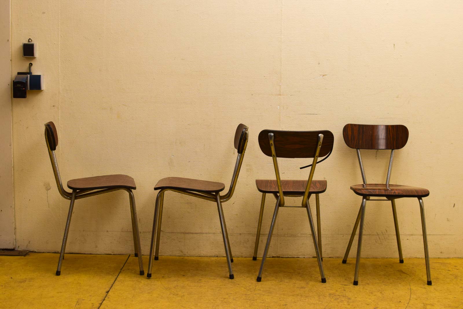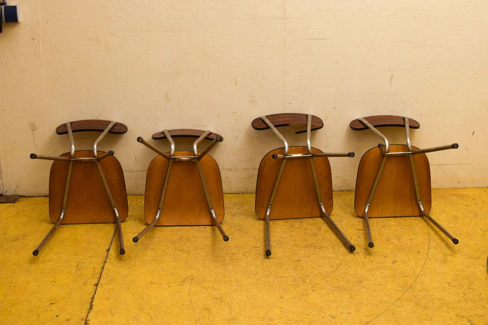 Over de staat: drie stoelen zijn in redelijk goede conditie. Een stoel heeft echter een los rubbertje aan de onderkant van één poot (zie foto). Het metalen onderstel vertoont op alle stoelen roest- en oxidatievlekken, wat typerend is voor vintage metaalwerk van deze leeftijd. Het zijn gebruikssporen die deel uitmaken van de eigentijdse patina van deze meubelen.