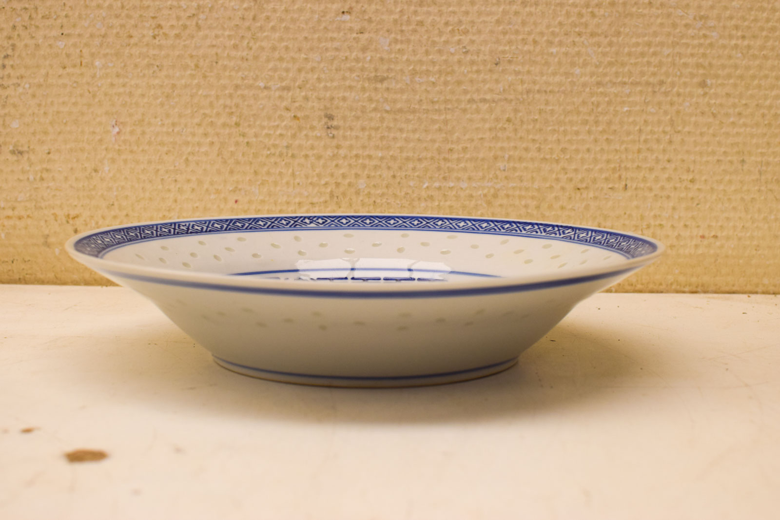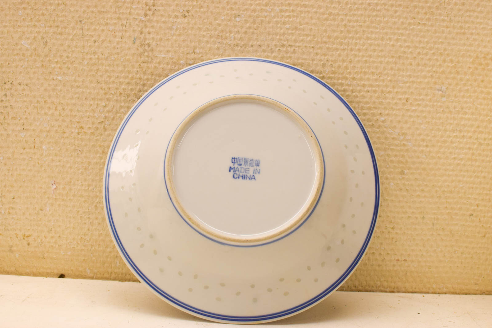 De borden hebben gebruikssporen en krassen die je op de foto’s kunt zien. Dit geeft ze karakter en vertelt hun gebruiksgeschiedenis. Let op: één van de vier borden is duidelijk lichter van kleur dan de anderen, waarschijnlijk door verschil in glazuur of bakking. Dit is een authentieke eigenschap van ouder porselein en niet weg te poetsen.