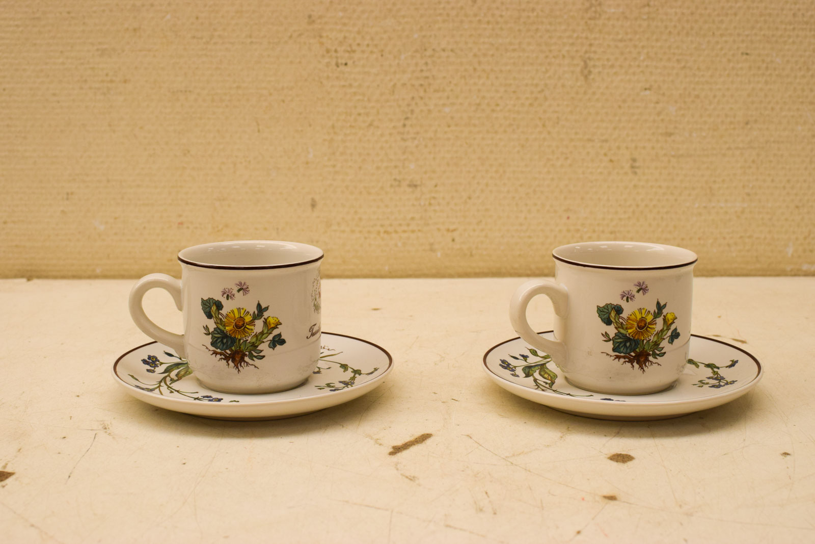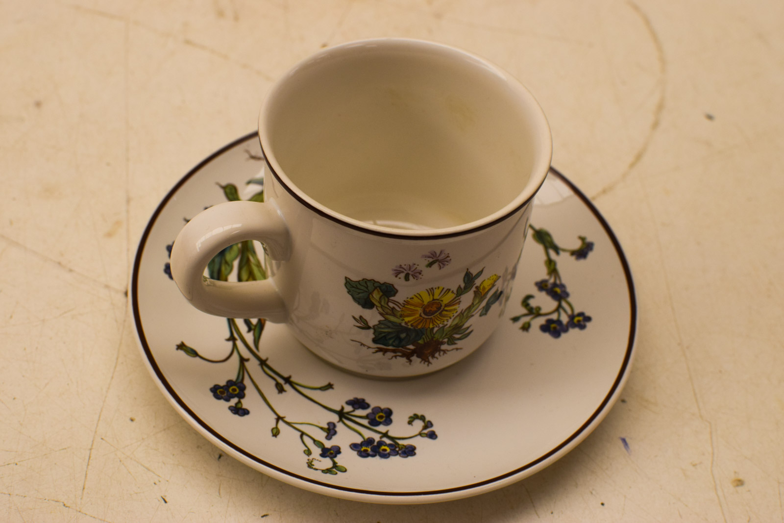 Het kopje gemeten diameter bovenkant 7,5 cm hoog 7 cm diameter van het schoteltje 15 cm