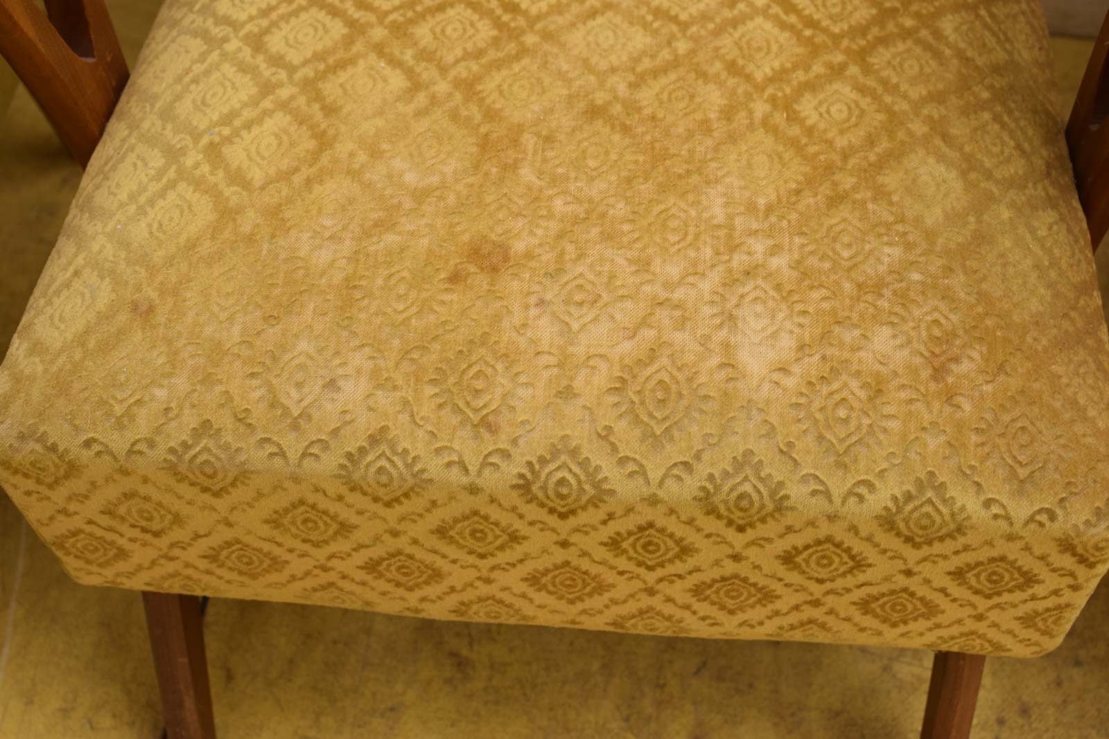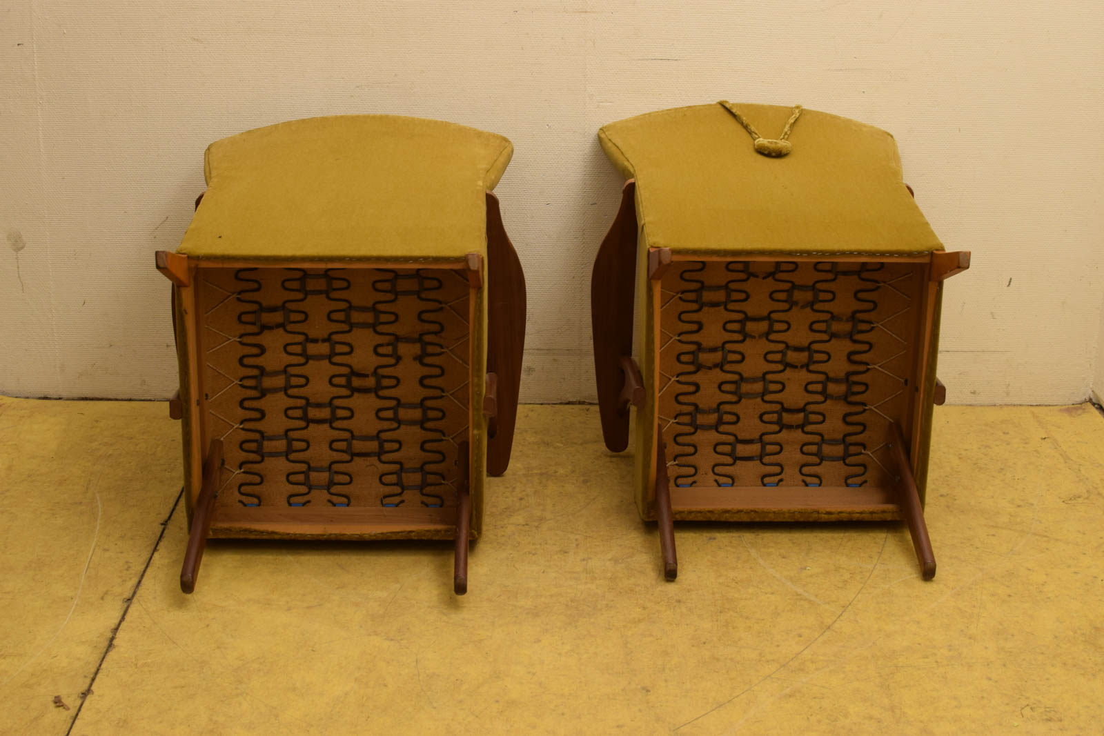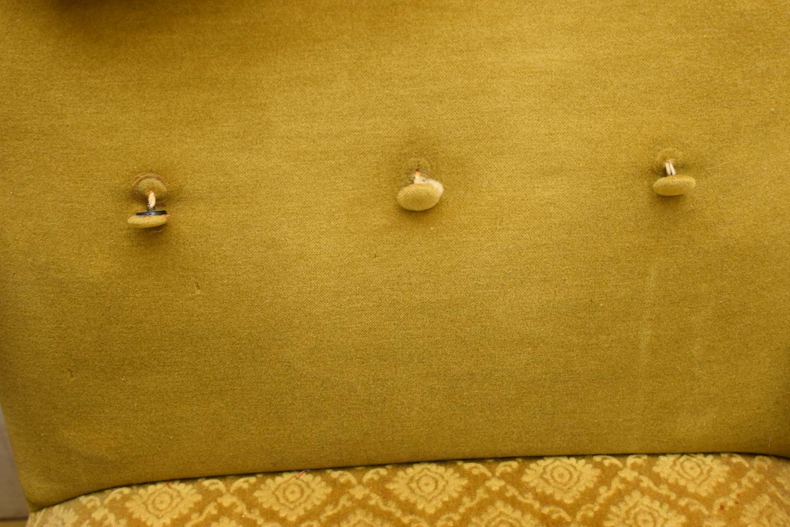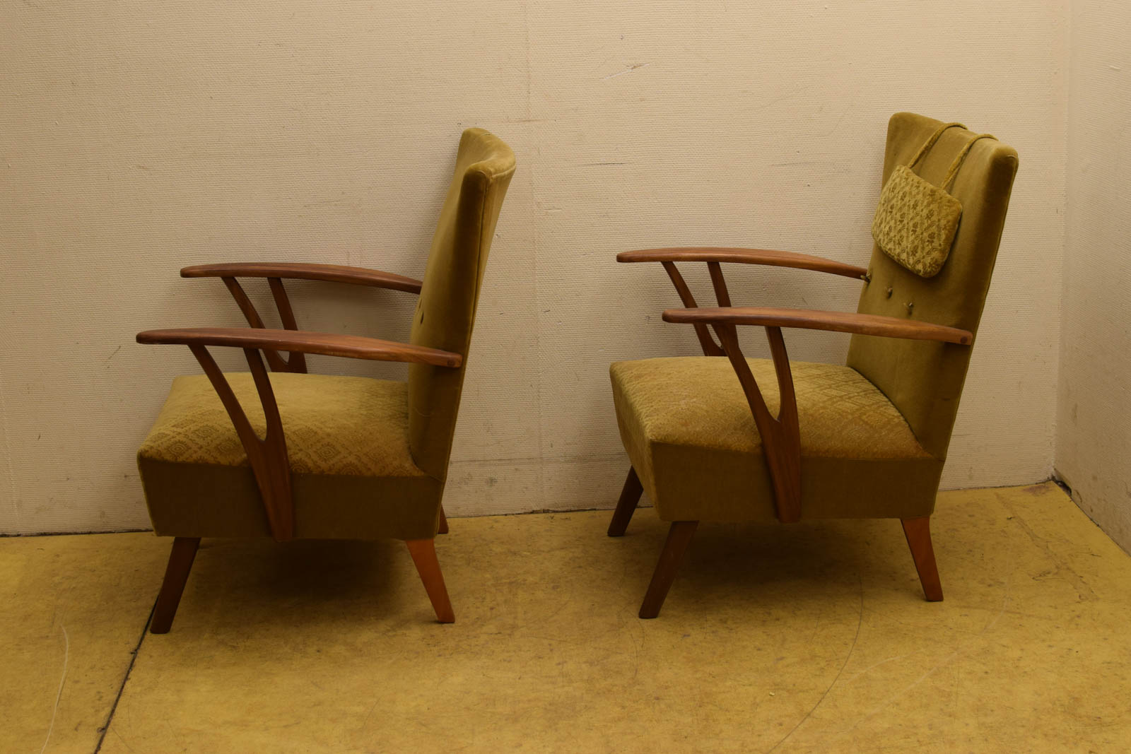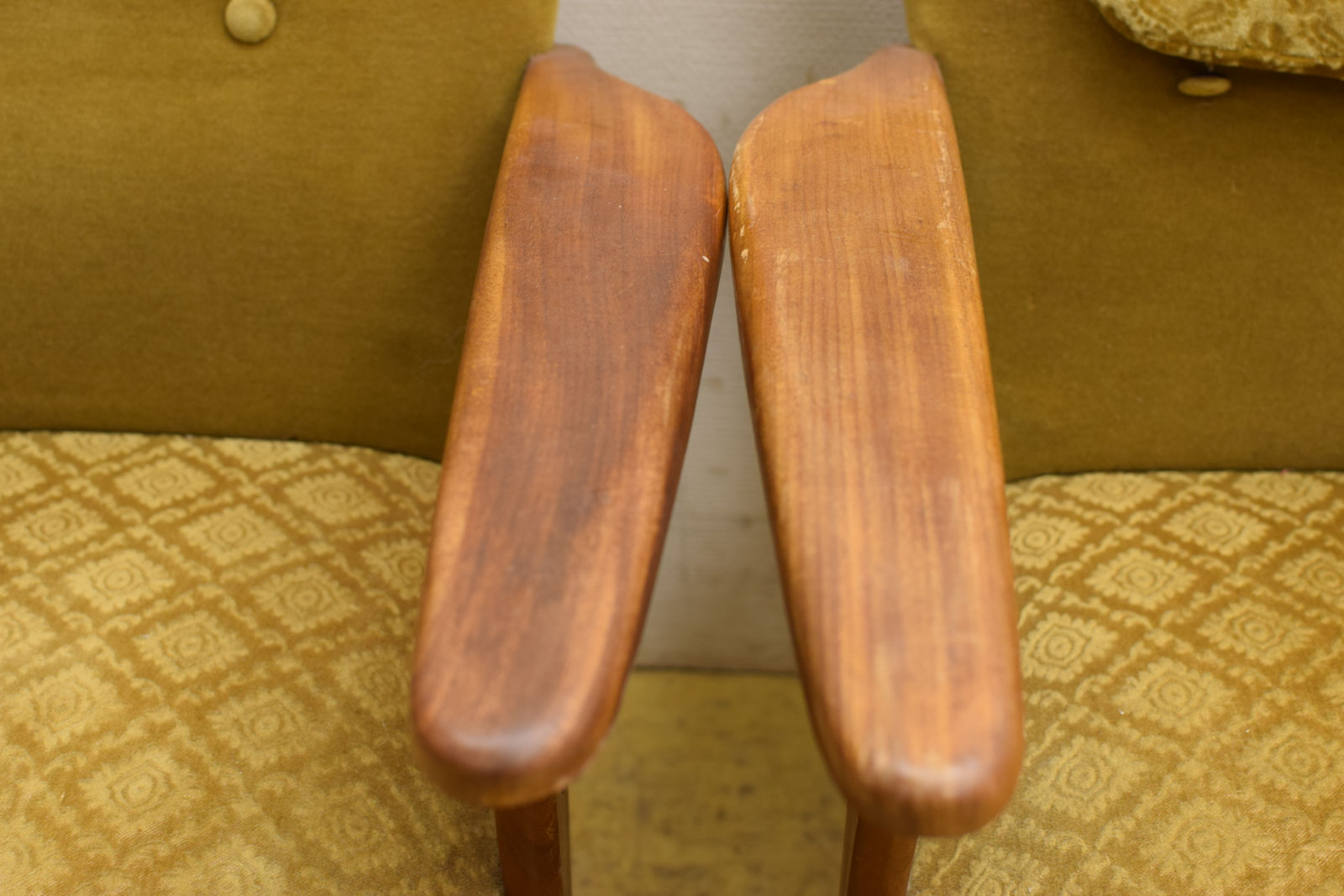 de fauteuils hebben gebruikssporen aan de armleuningen en het stofje heeft wat slijtage en mist 1 knoopje en 2 knoopjes zitten los de stoelen zijn gebruikt 1 stoel heeft de rugversiering