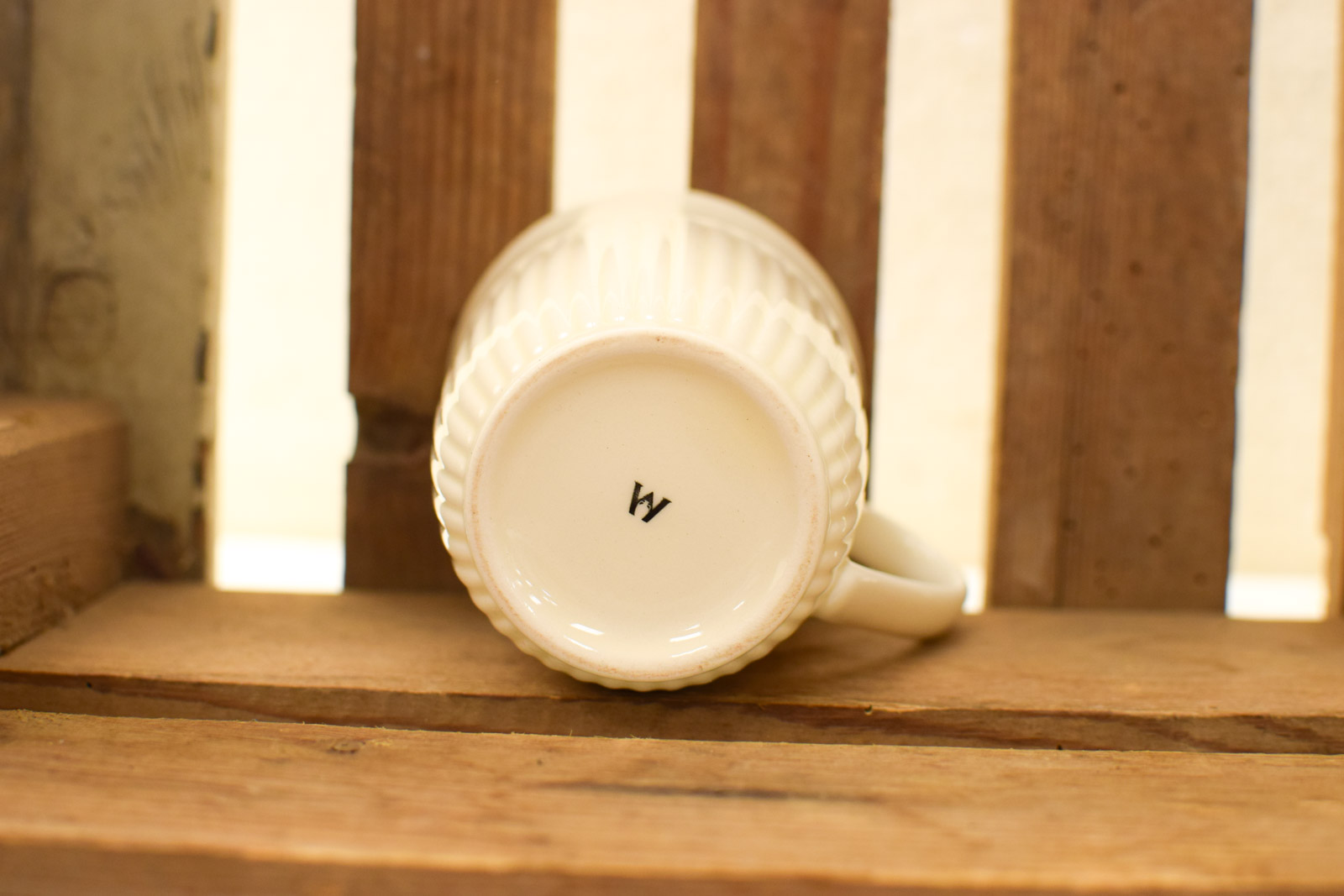 Set van 4 witte porseleinen kopjes met ribbeldesign. De kopjes hebben kleine gebruikssporen aan de binnenkant, maar zijn verder in goede staat. Afmetingen: 7 x 7 x 9 cm.