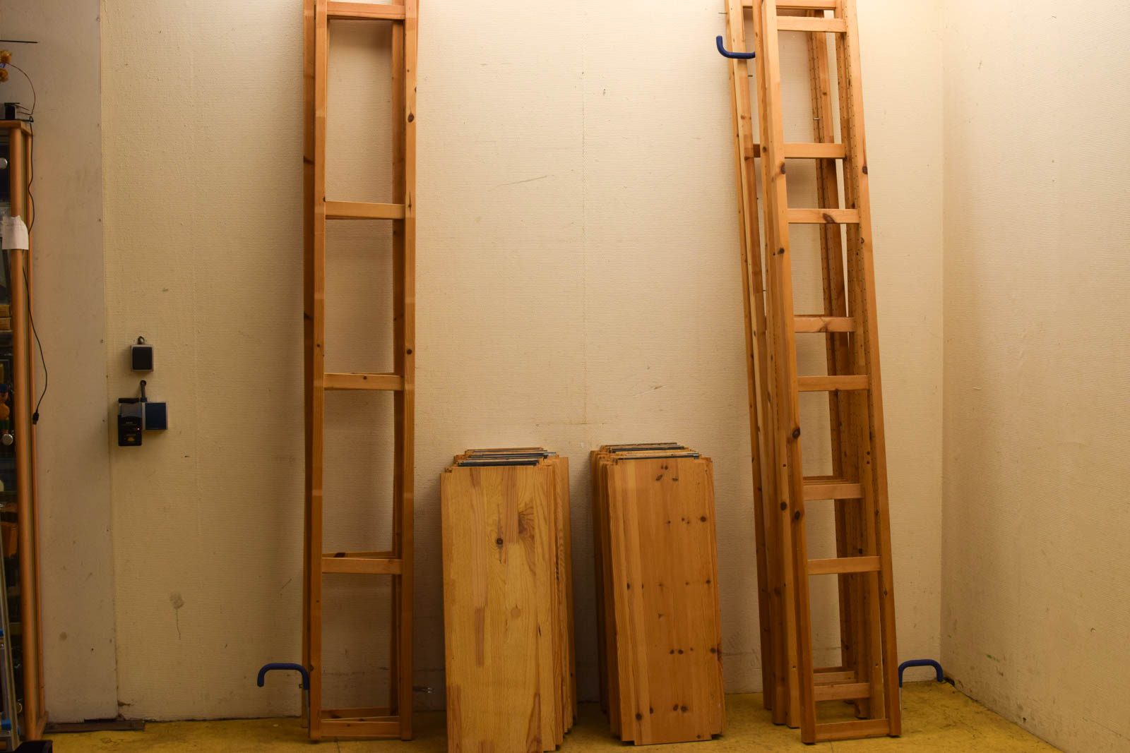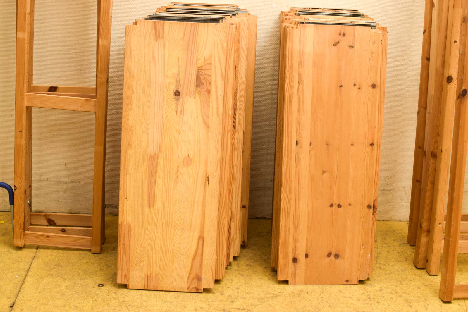 De 39 legplanken gemeten zoals op de 1ste foto breed 30 cm hoog 83 cm de de 8 staanders zijn breed 30 cm hoog 227 cm er zijn pinnen bij