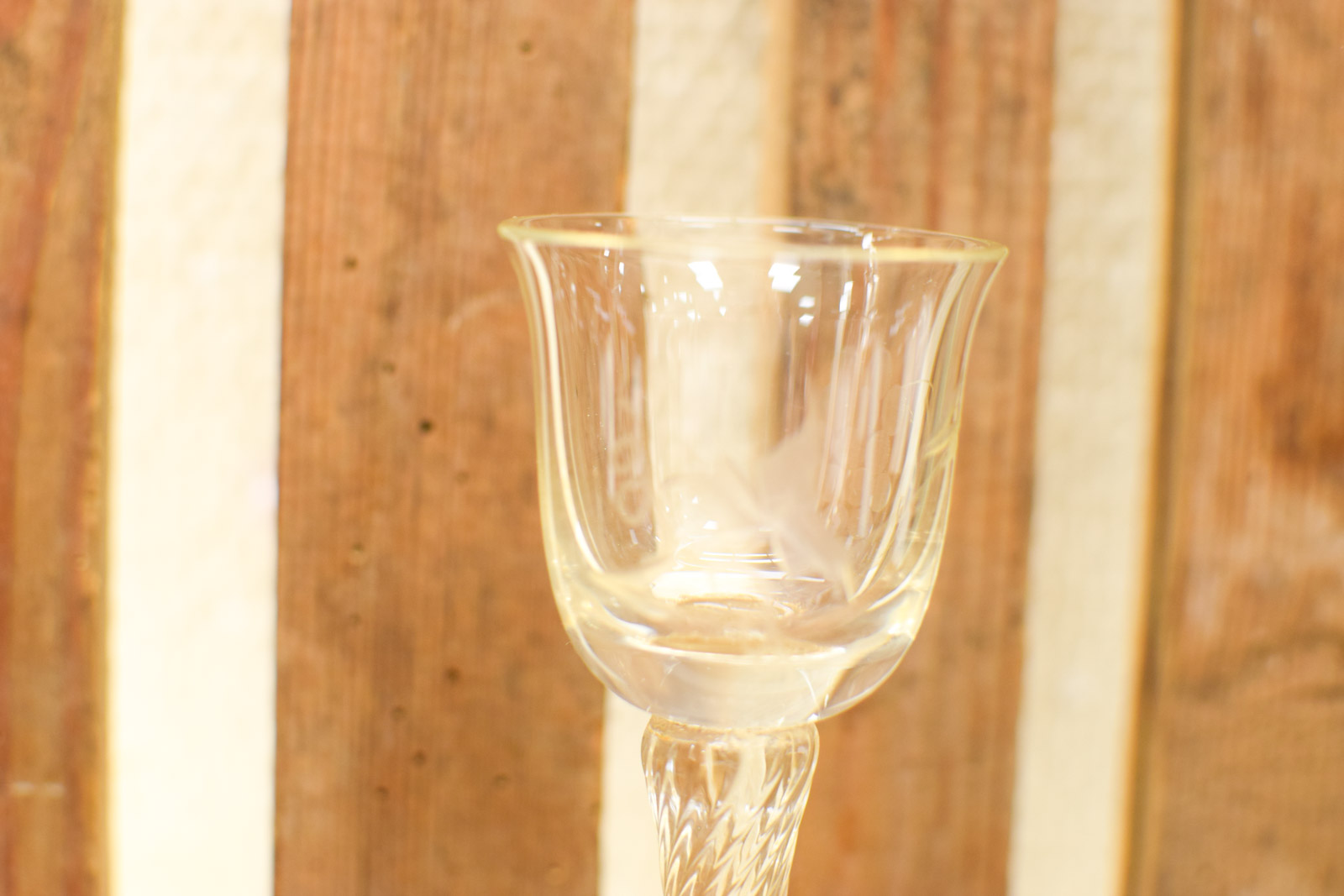De karaf bereikt een hoogte van 22 centimeter (gemeten inclusief het oor) en heeft een ronde bulbvorm met een druppelvormige stopper. De borrelglaasjes hebben een diameter van 5 centimeter aan de opening en zijn 11,5 centimeter hoog. Het geslepen patroon op de voeten en het lijnenspel van het glas geven het servies een klassieke uitstraling die aansluit bij traditionele huishoudstijlen.