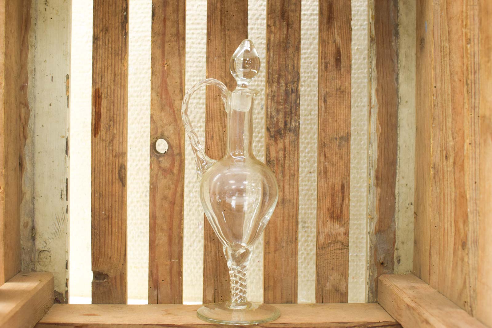 Deze glazen karaf met borrelglaasjes is een compleet vijfdelig servies in helder geslepen glas. De set bestaat uit een karaf met een gebogen oor en drie glaasjes met karakteristieke geslepen voet, waarvan twee glaasjes gemonteerd op een voet en één losse.